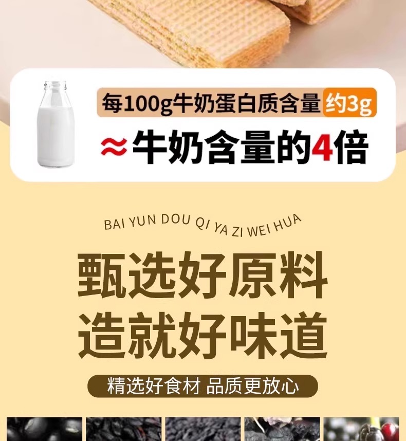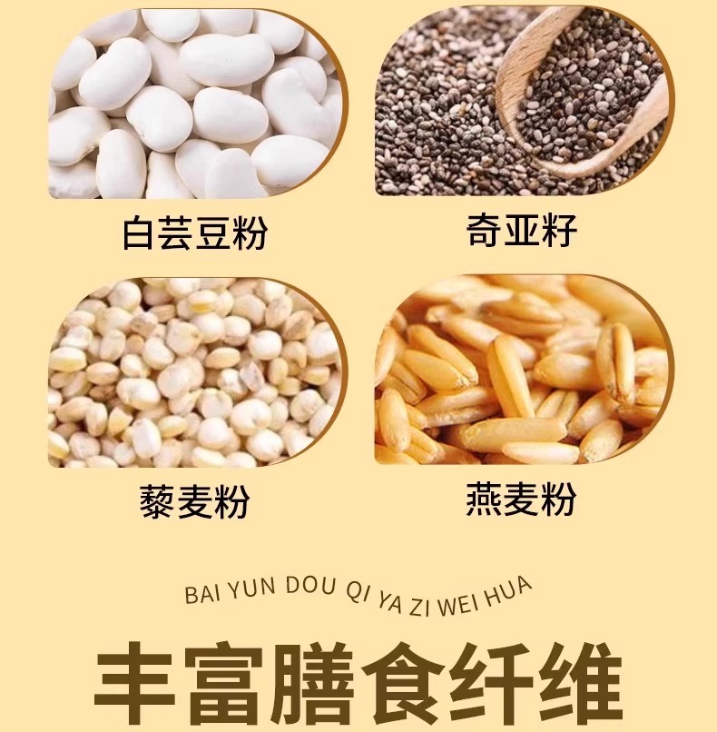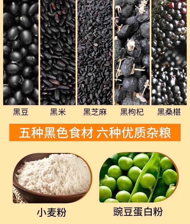 配料:全麦粉,小麦粉,精炼植物油,豌豆蛋白粉,椰子油,结晶果糖,脱脂乳粉,黑豆豆浆粉,藜麦粉,白芸豆豆粉(添加量>5%),奇亚籽(添加量>3%),黑米粉,黑桑葚粉,黑枸杞粉,黑芝麻,食用盐,碳酸氢氨,碳酸氢钠。