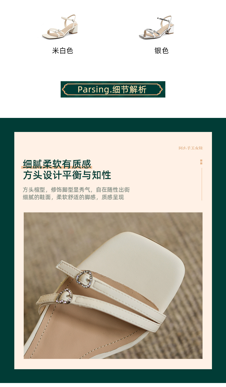 阿么手工女鞋方头仙女风一字带凉鞋不累脚夏季银色百搭中跟4.8CM