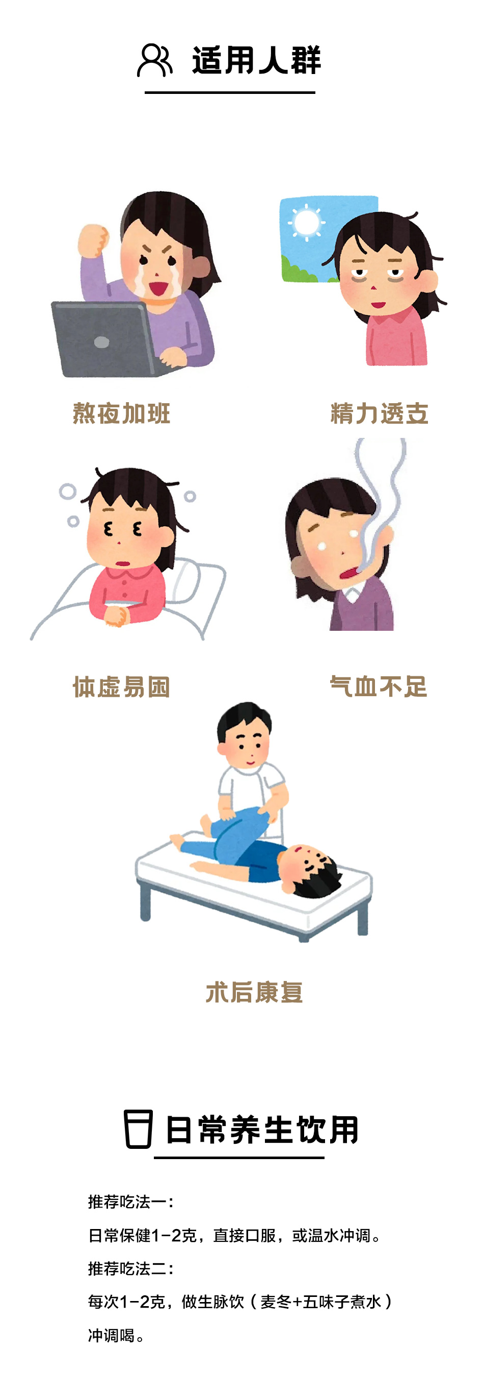 【配料】:吉林通化林下野山参(15年以上参龄)、西藏那曲虫草,每瓶人参虫草粉含2-3根虫草 【产地】:吉林省通化市、西藏藏族自治区那曲市 【产品类型】:初级农产品 【生产方式】:野生采集 【保存方法】:密封冷冻保存 【保质期】:2年 【生产日期】:见包装 【食用方法】:日常保健1-2g/天,直接吃,或温水冲调(跟冲奶粉一样)。也可做生脉饮(麦冬+五味子煮水)冲调喝。开瓶前请摇一摇,确定人参和虫草粉充分拌匀。 【适用人群】:体虚易困者,气血不足者,术后康复者等人群;不适宜人群:孕妇、哺乳期妇女、14周岁以下儿童。 【注意事项】: 1. 虫草和野山参均在野外自由生长,采集后未经过度清洗,带皮带根须打粉,或有少量黑渣,为正常现象,不影响食用; 2. 日常保健用,不作为医用标准,如需入药,谨遵医嘱。 |