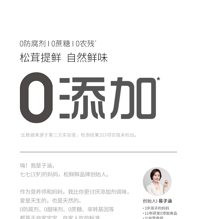 央视推荐品牌松鲜鲜,品牌创始人易子涵女士坚守10年研发0添加健康产品的初心。作为营养师和妈妈,讨厌添加剂调味,产品0防腐剂,0甜味剂,0蔗糖,非转基因等,所有产品都基于自家宝宝、家人吃的标准做到孩子爱吃,全家放心吃!