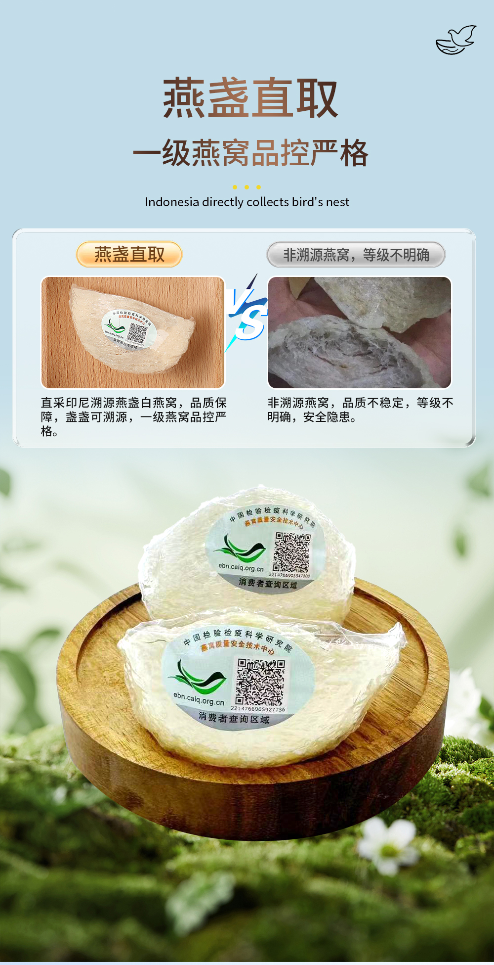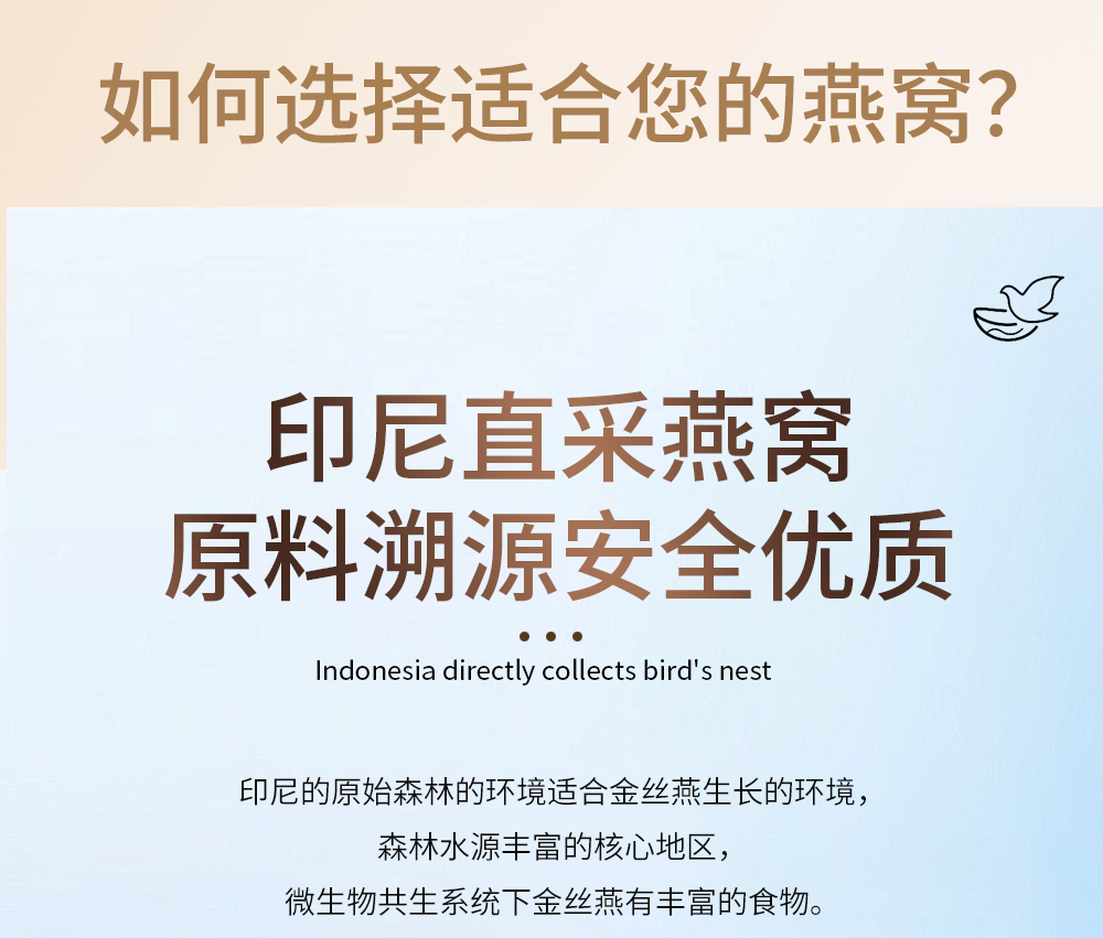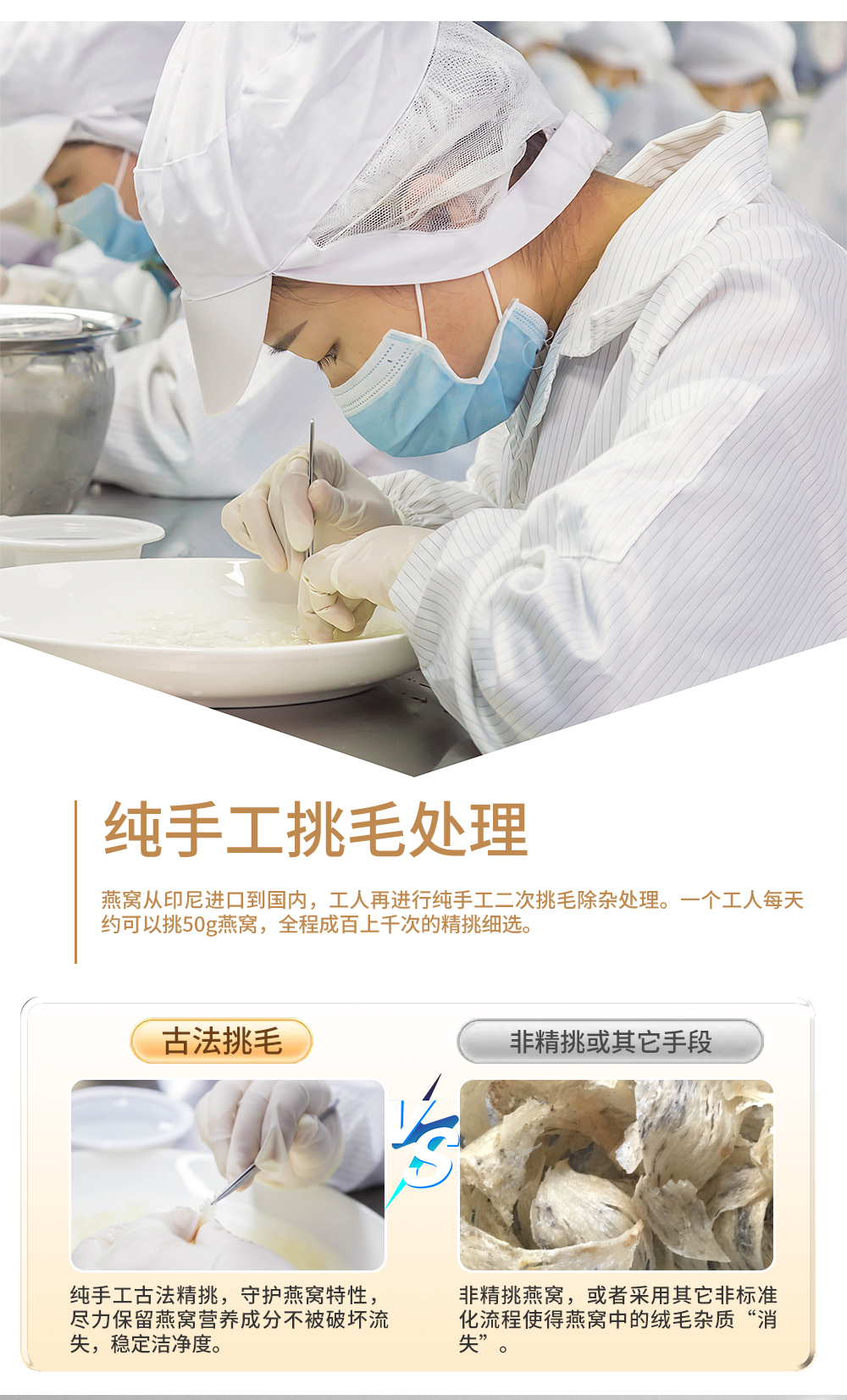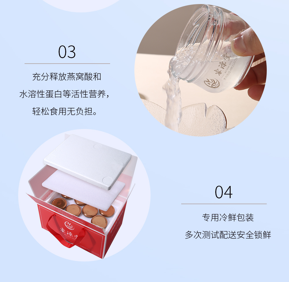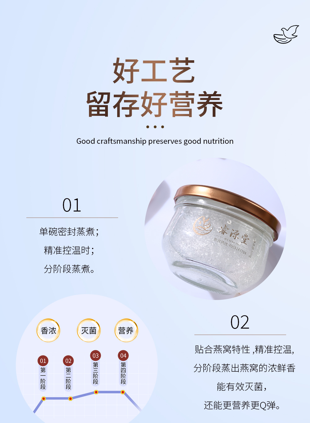 原材料使用印尼原盏燕窝,经过多道工序,然后选择炖煮的方法制作而成。为了保证燕窝口感最佳,如需自提请提前两天致电预定。