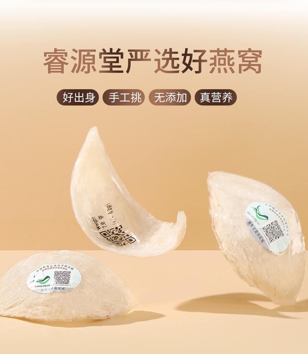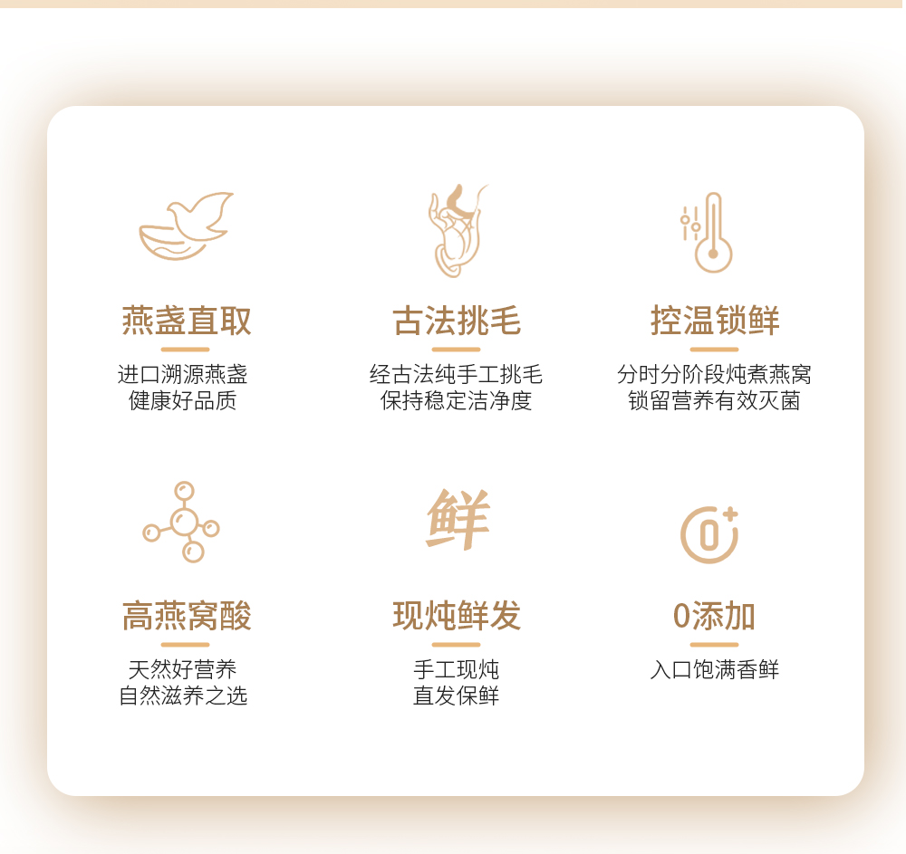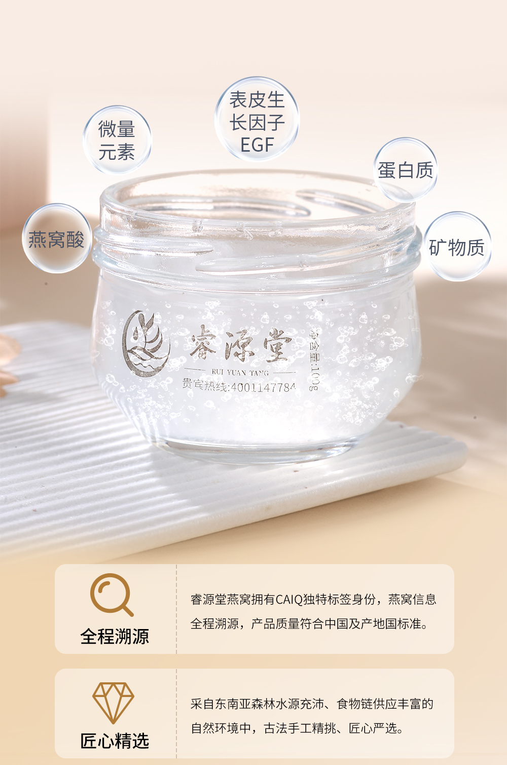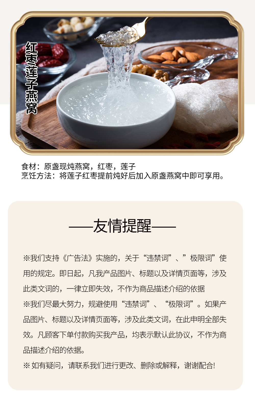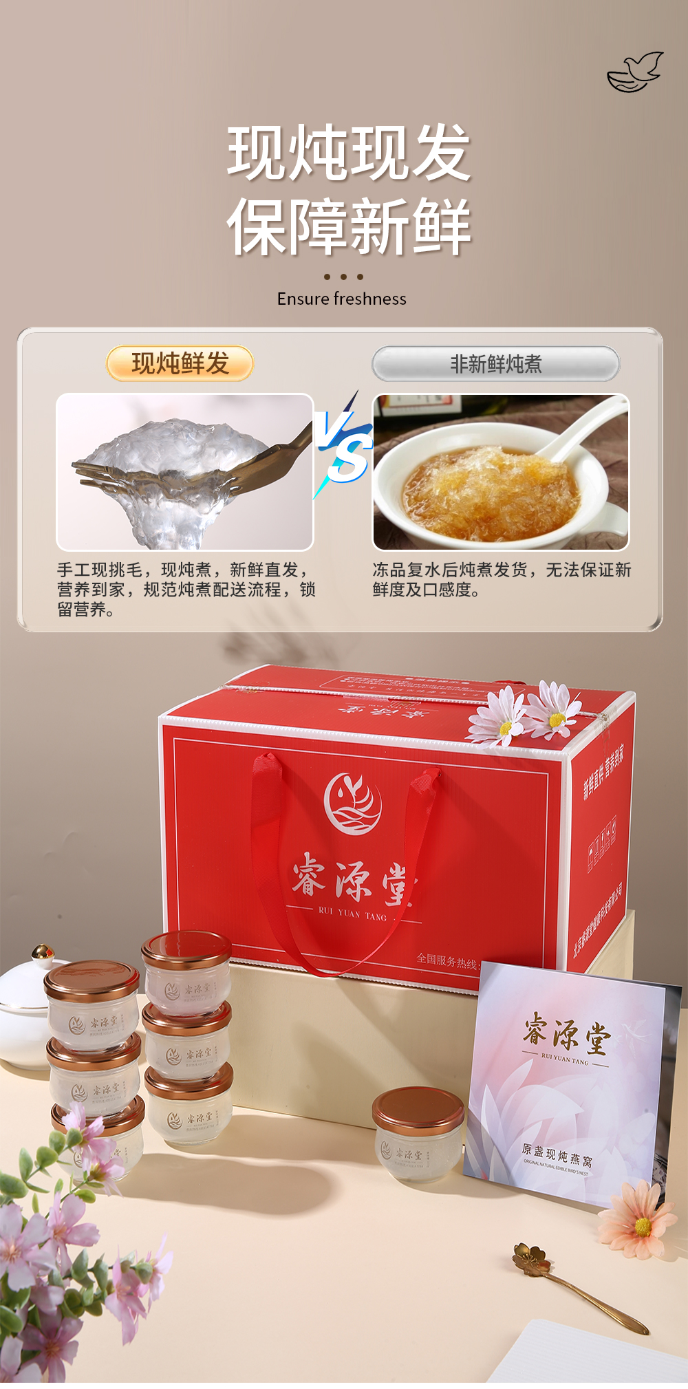 原材料使用印尼原盏燕窝,经过多道工序,然后选择炖煮的方法制作而成。为了保证燕窝口感最佳,如需自提请提前两天致电预定。