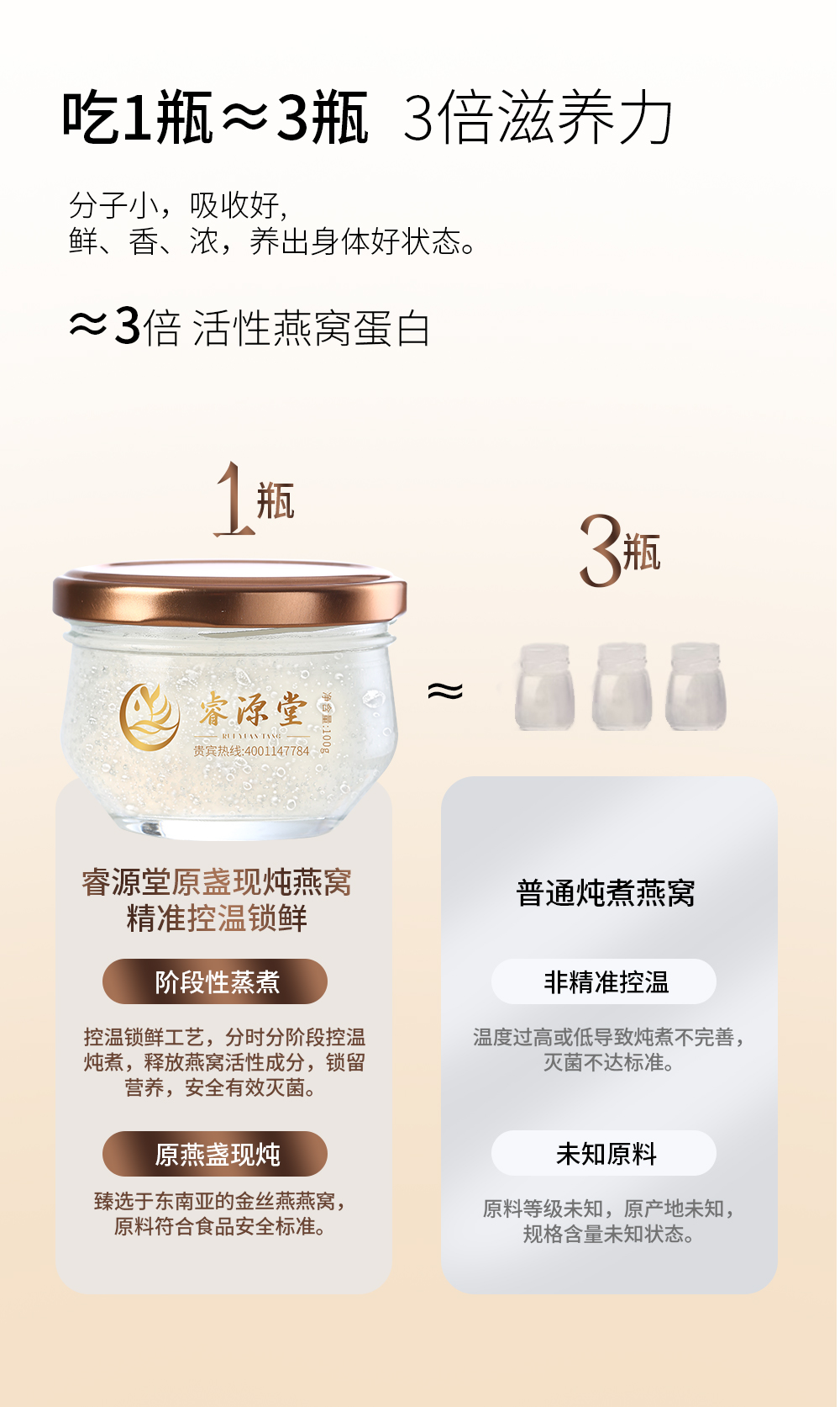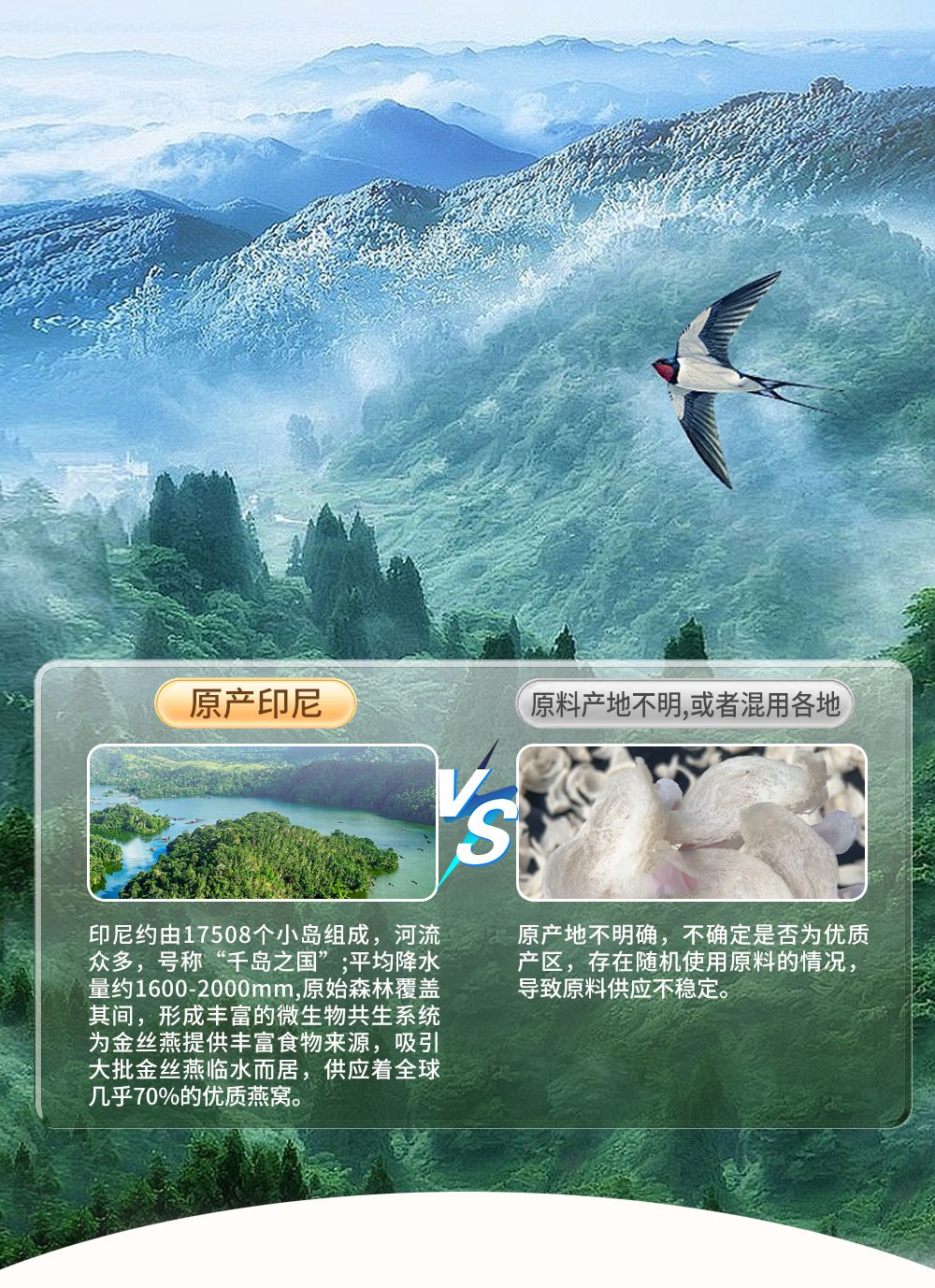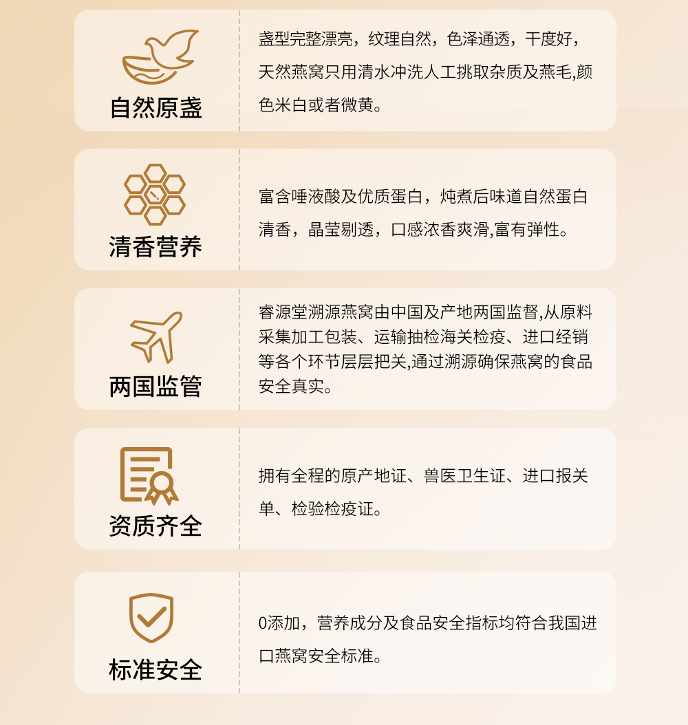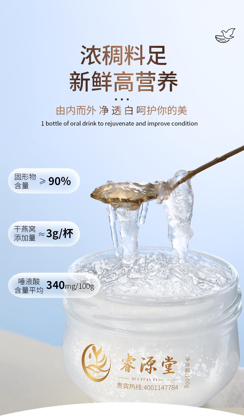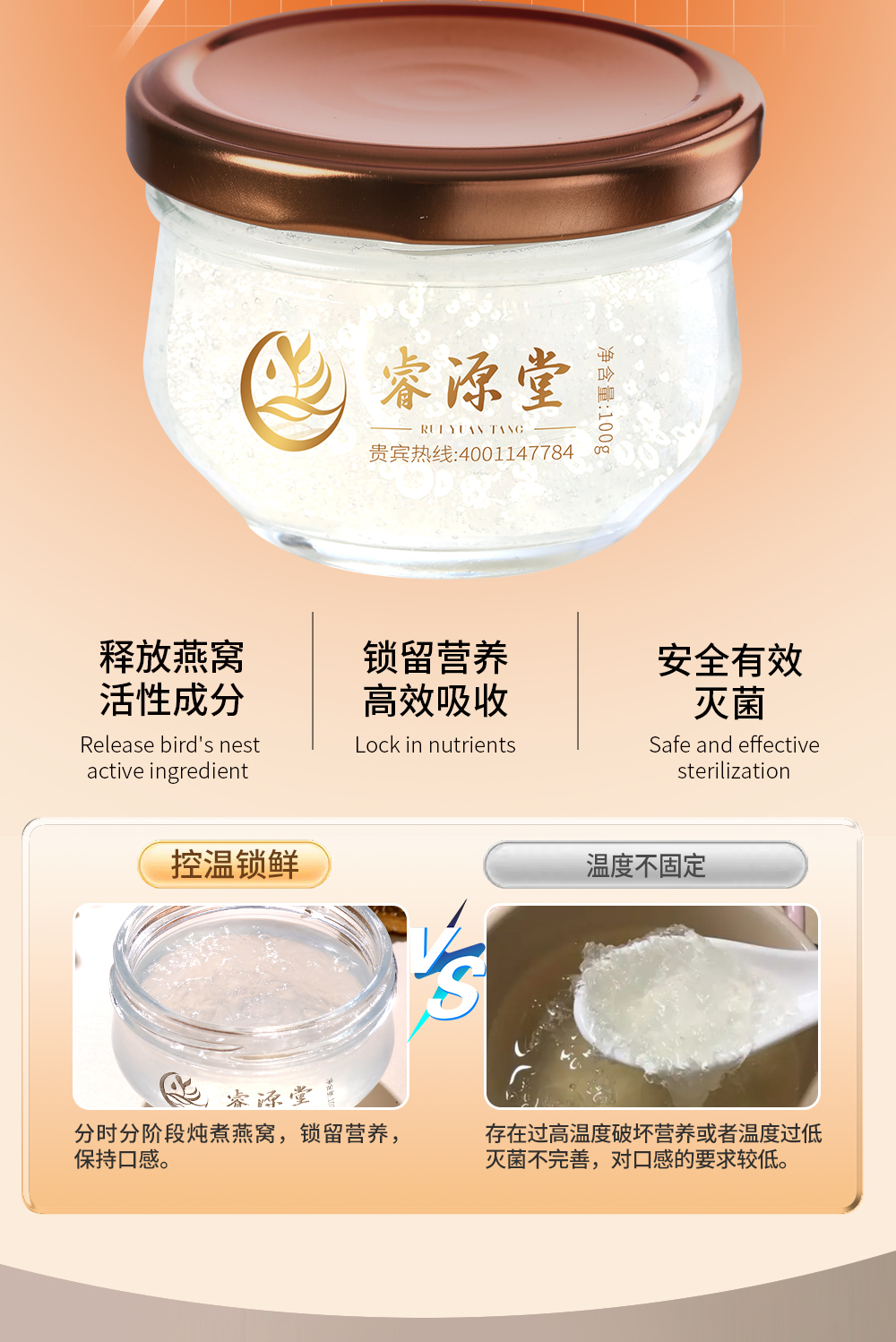 原材料使用印尼原盏燕窝,经过多道工序,然后选择炖煮的方法制作而成。为了保证燕窝口感最佳,如需自提请提前两天致电预定。