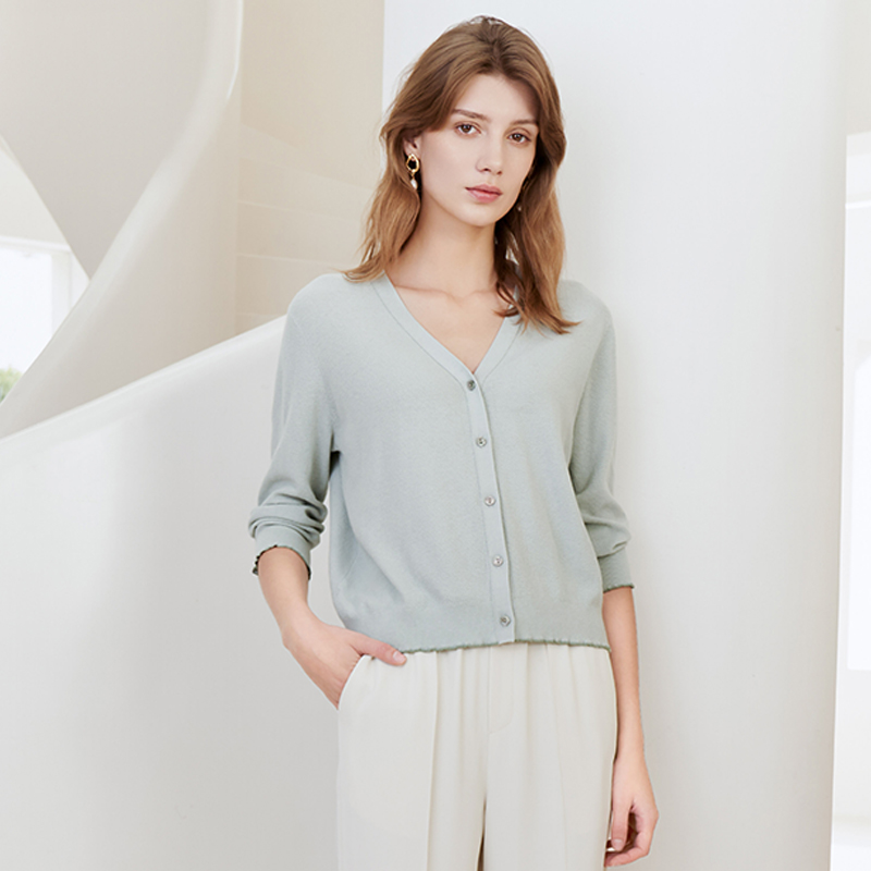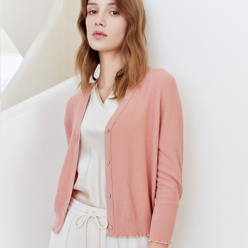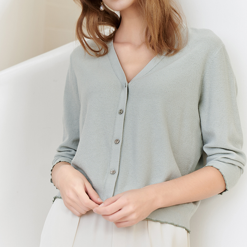 【棉+桑蚕丝V领针织开衫】23年春夏新品女士针织小外套时尚七分袖薄款上衣