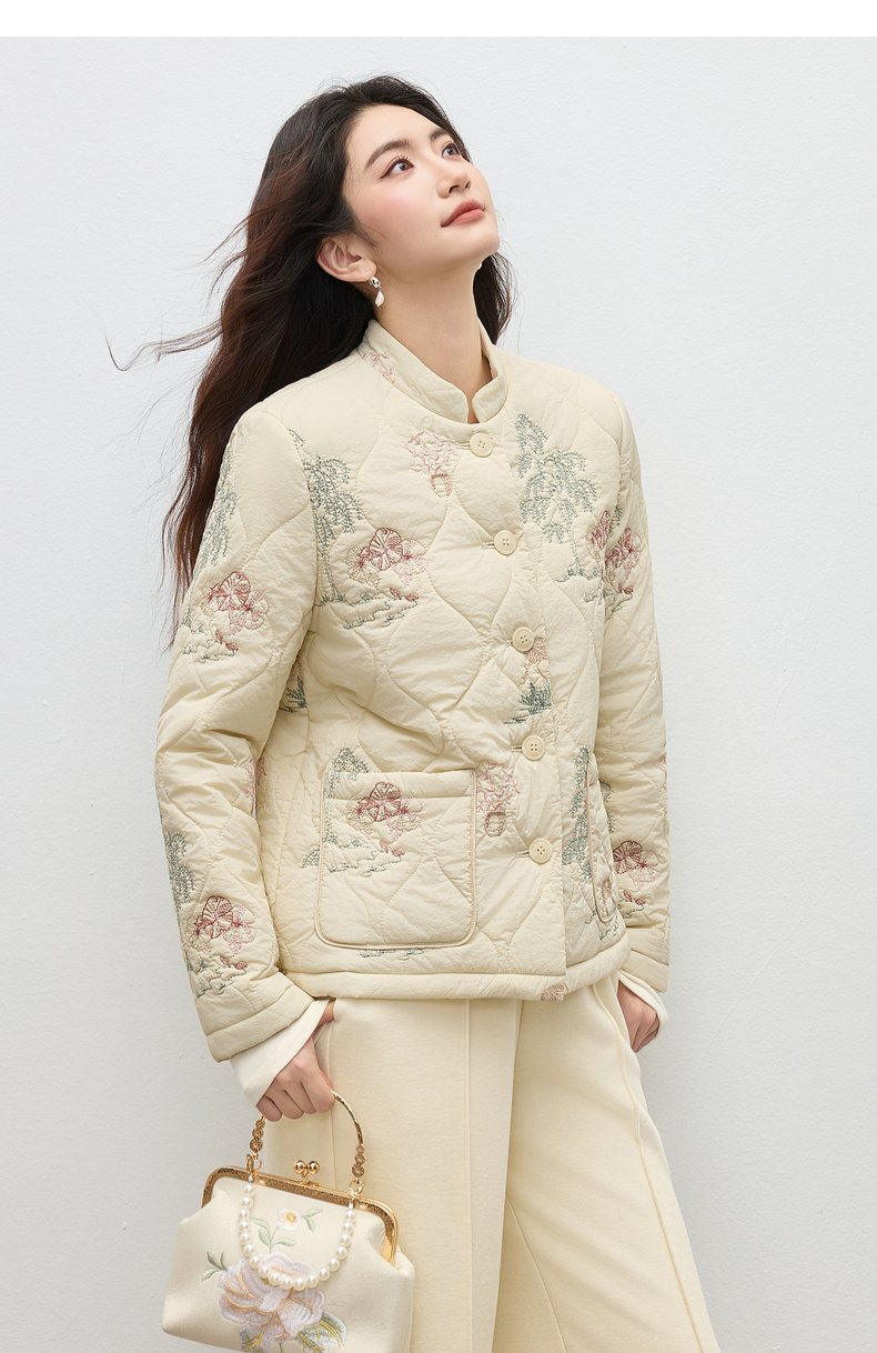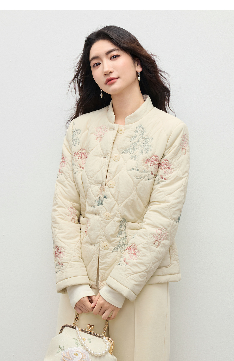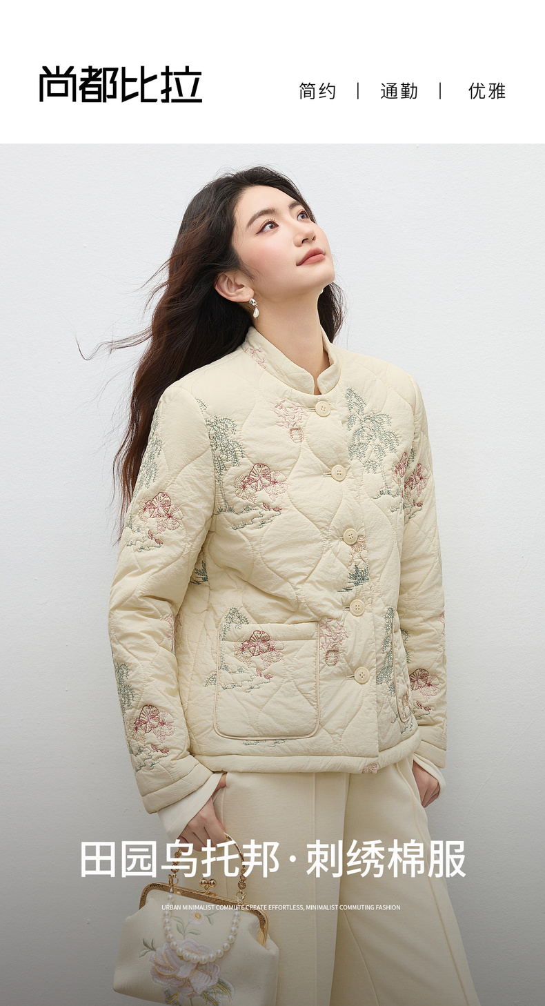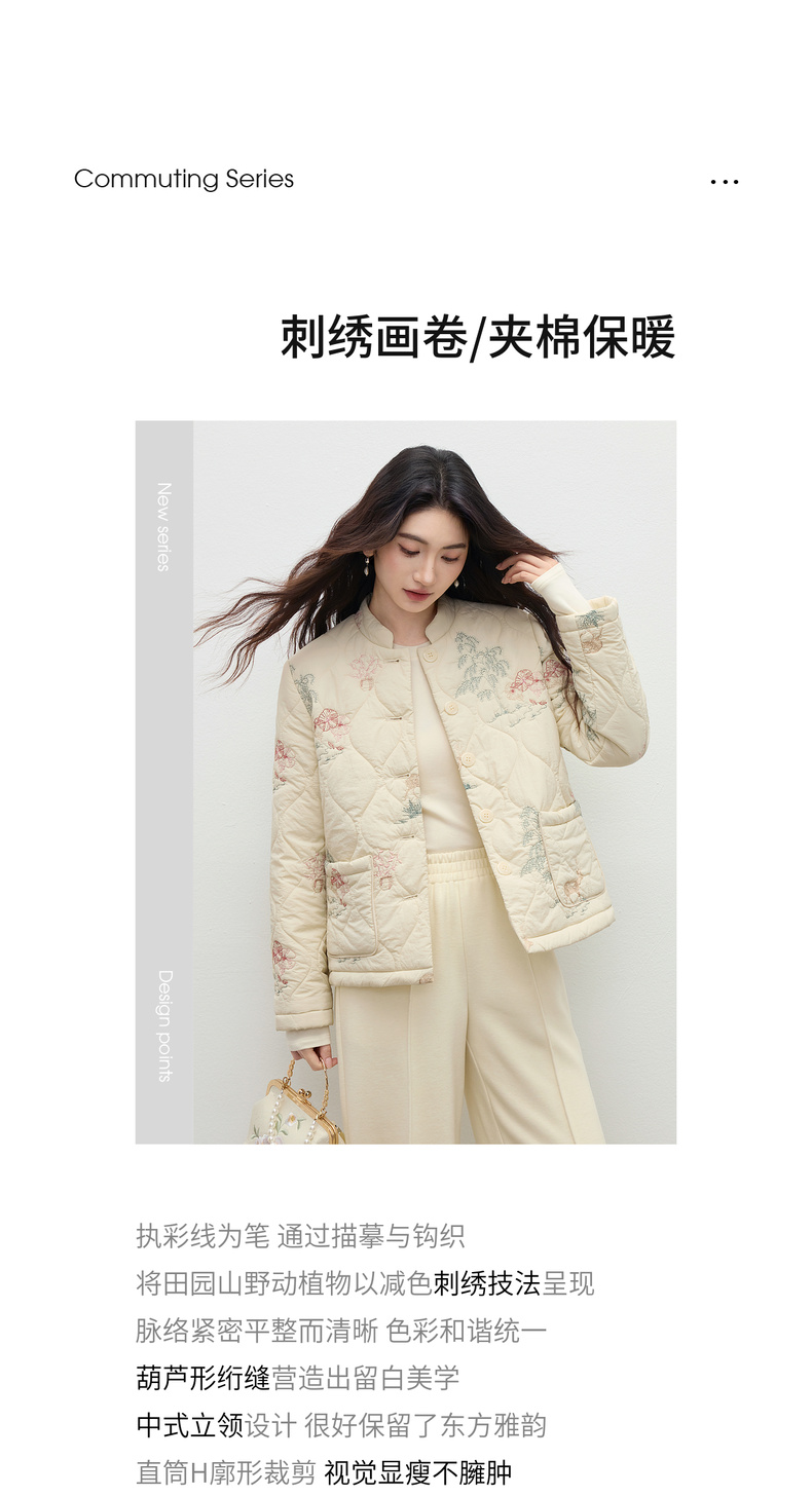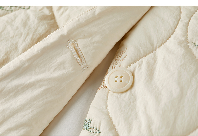 【内购】【夹棉保暖】优雅通勤立领单排扣撞色刺绣葫芦形绗缝不臃肿棉服-Q54ME4175