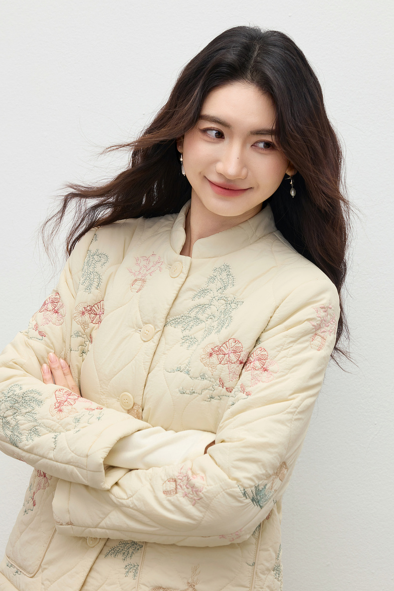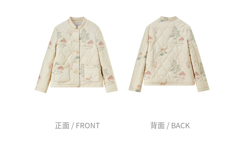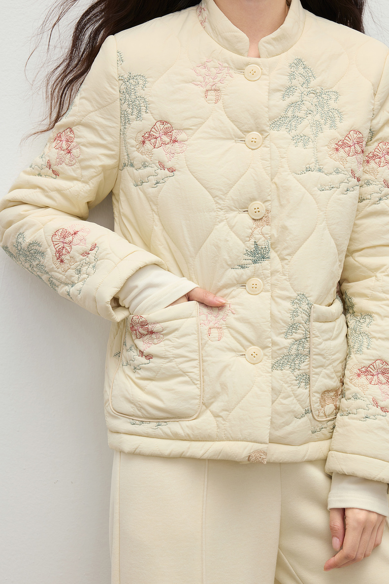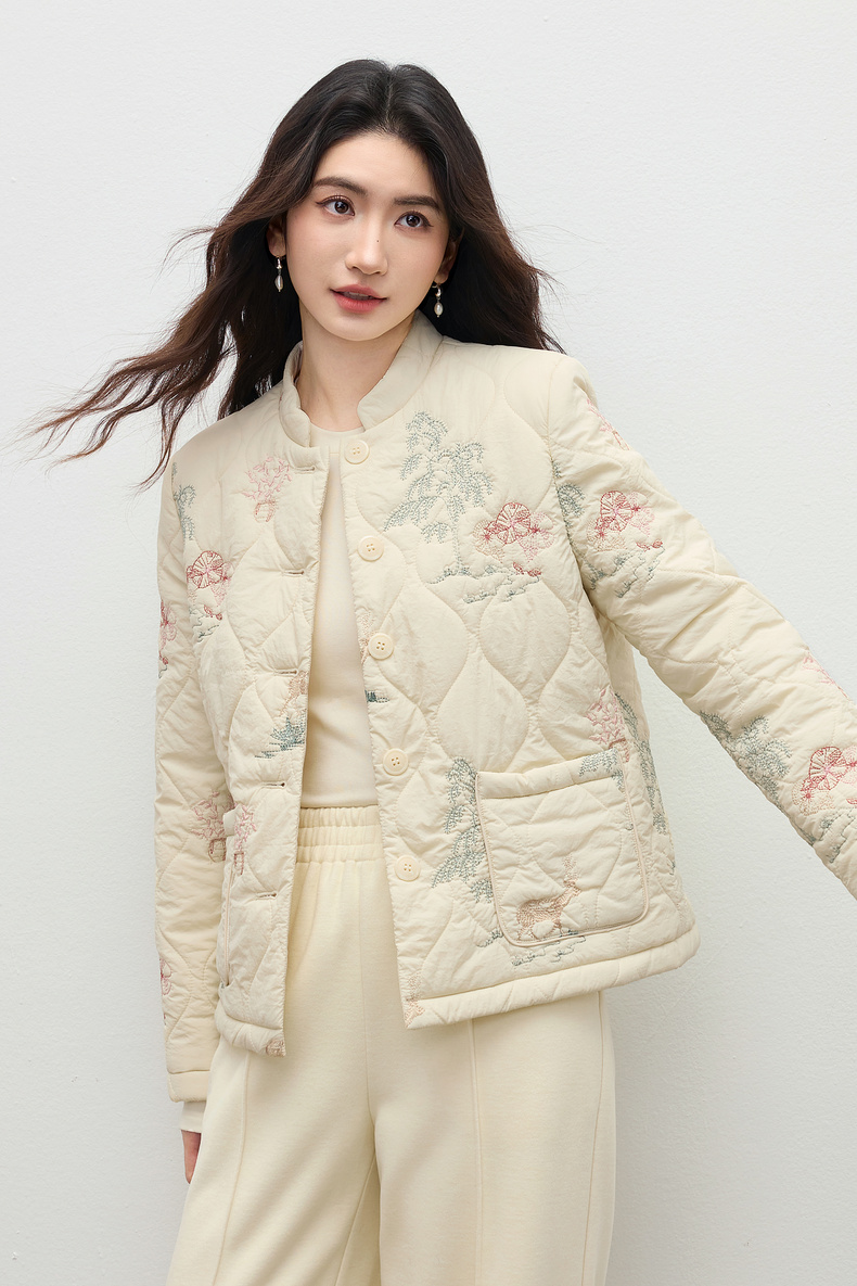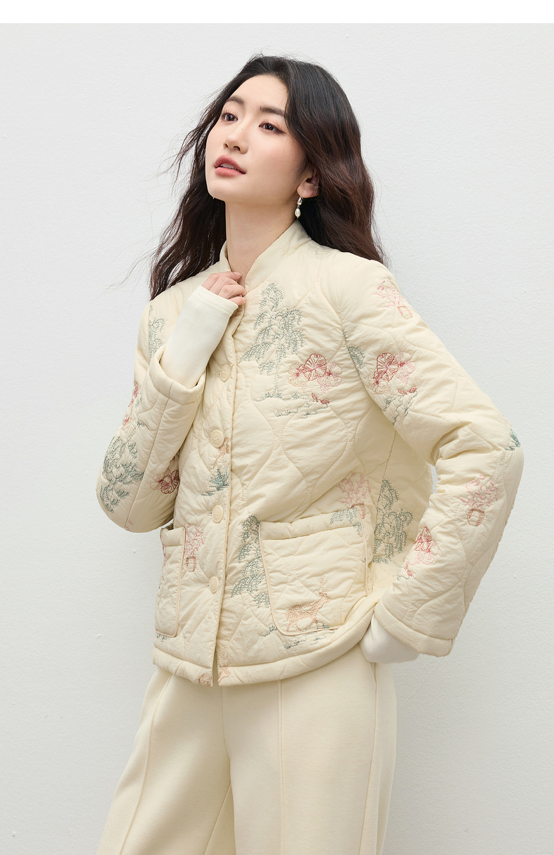 【内购】【夹棉保暖】优雅通勤立领单排扣撞色刺绣葫芦形绗缝不臃肿棉服-Q54ME4175