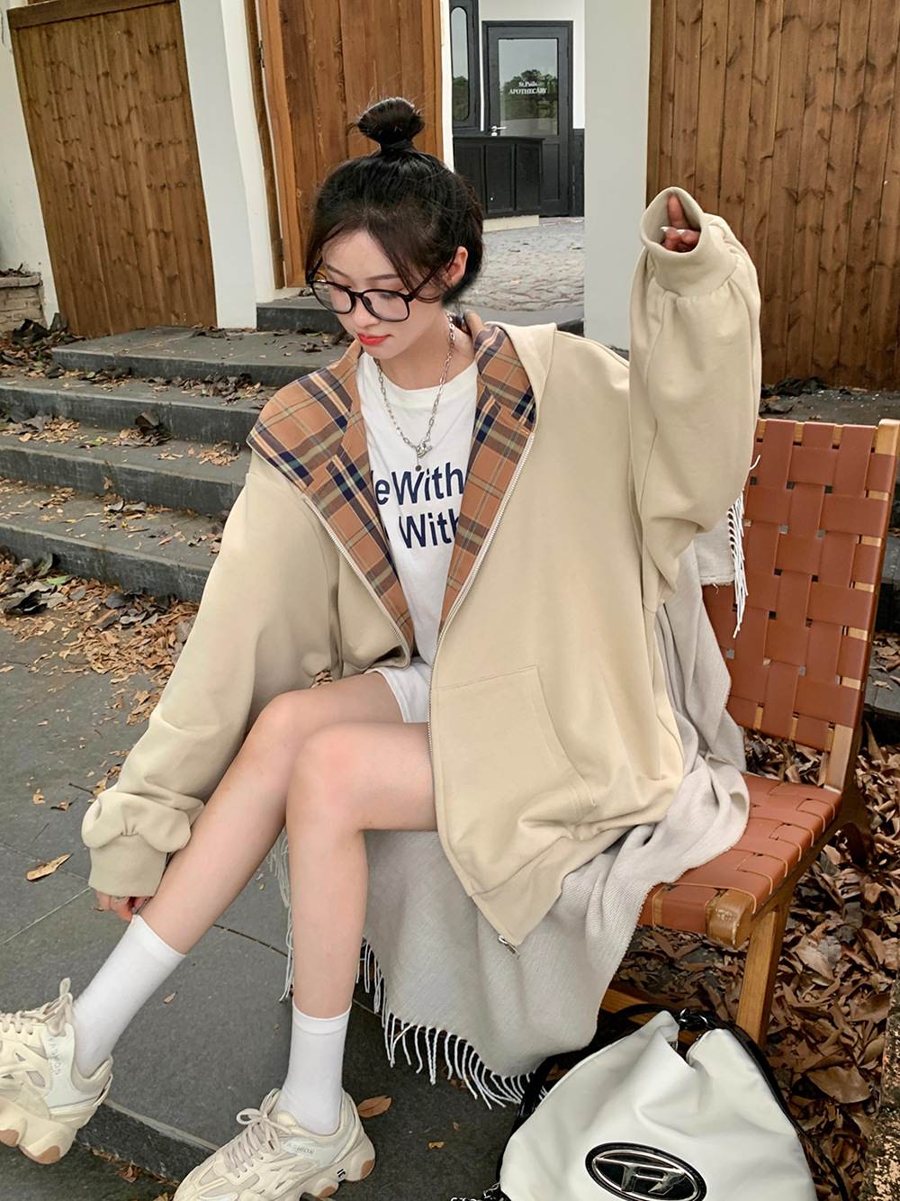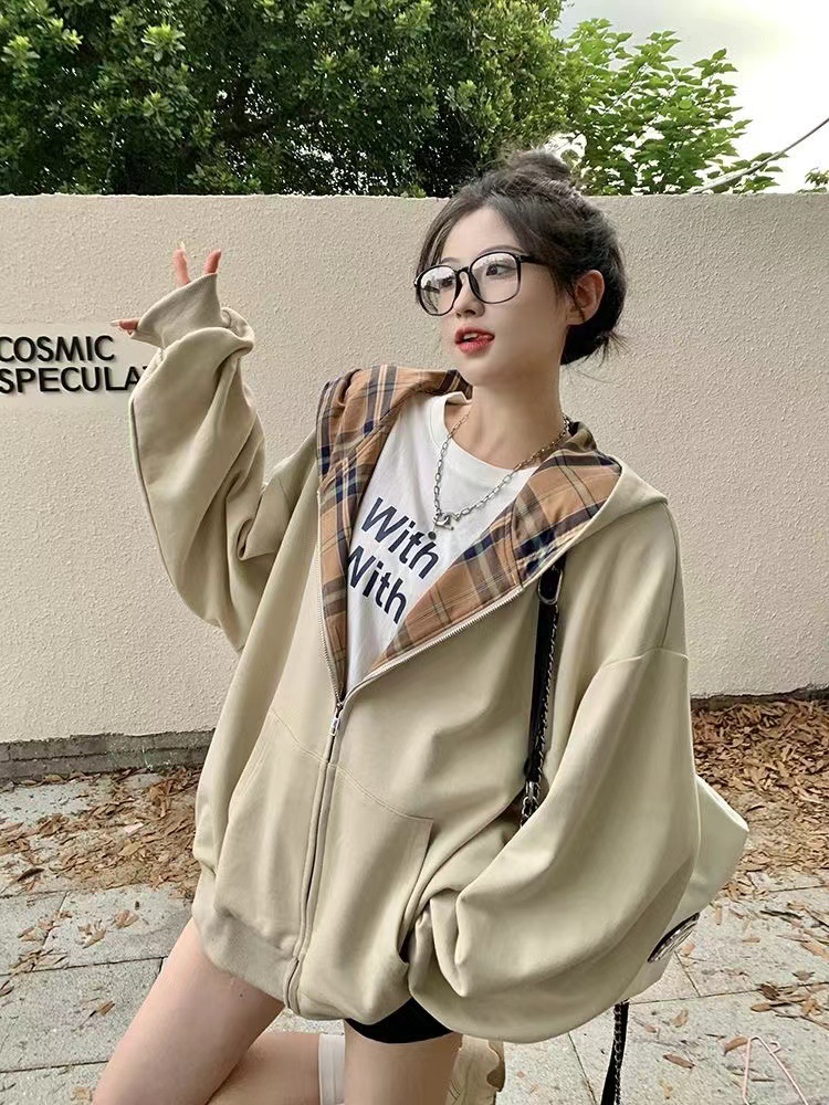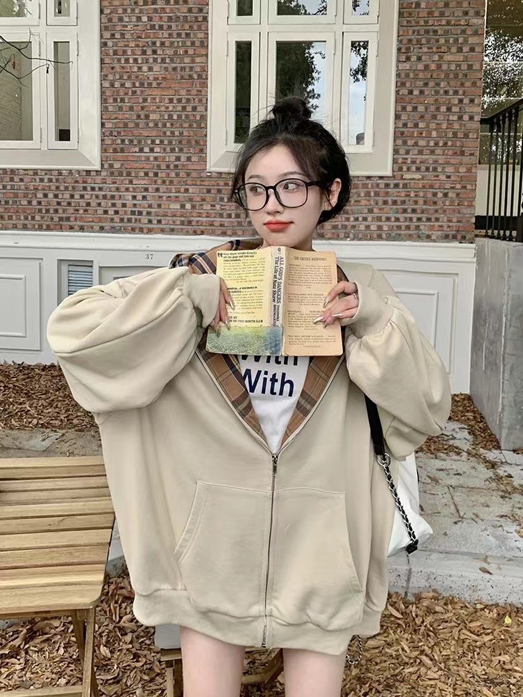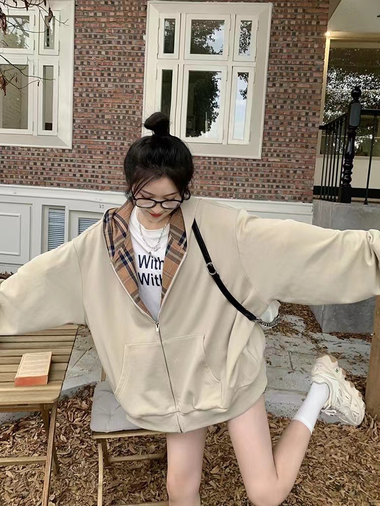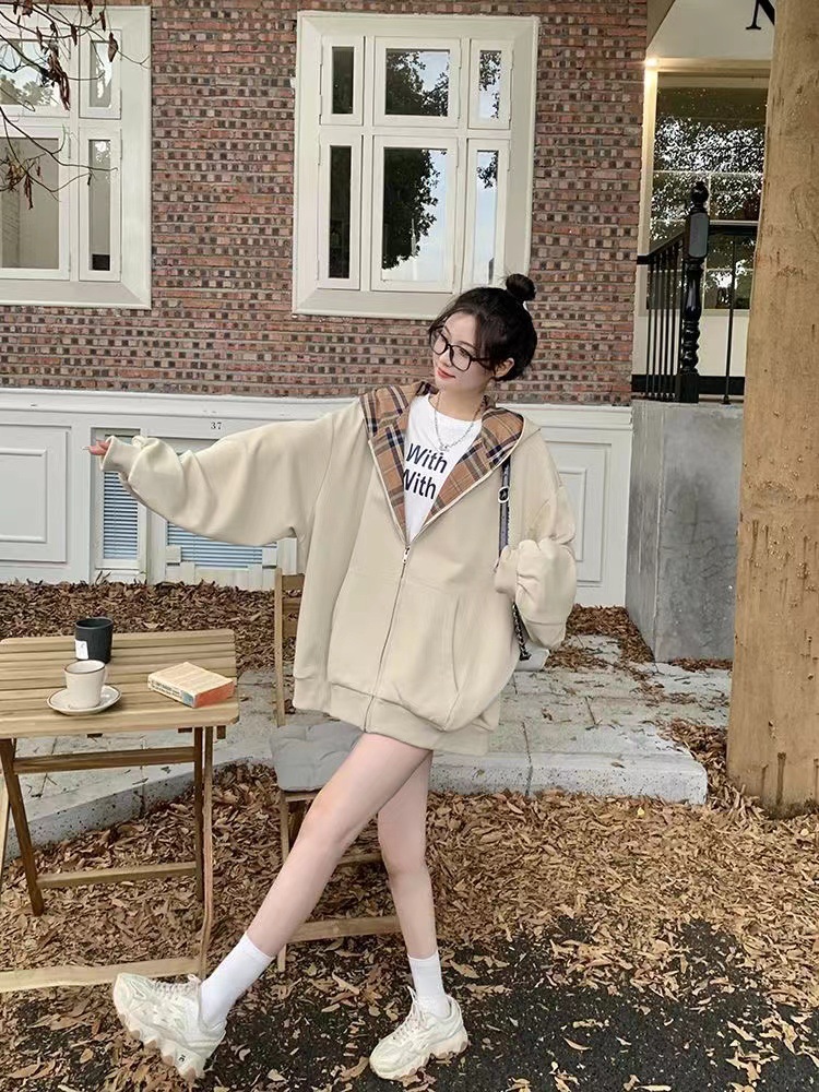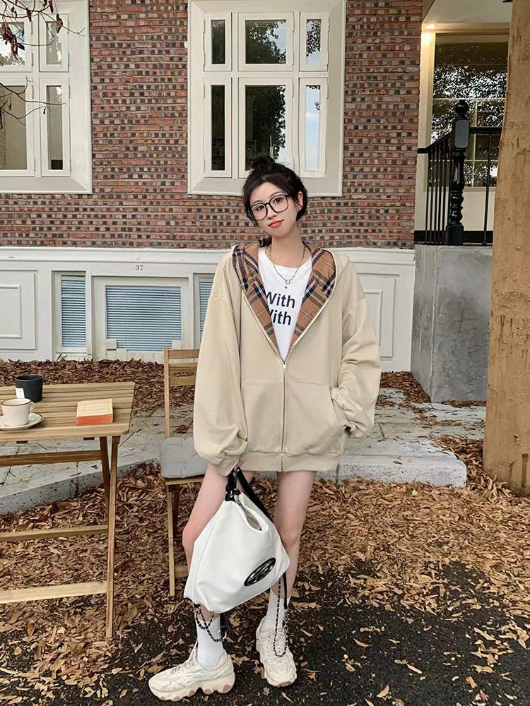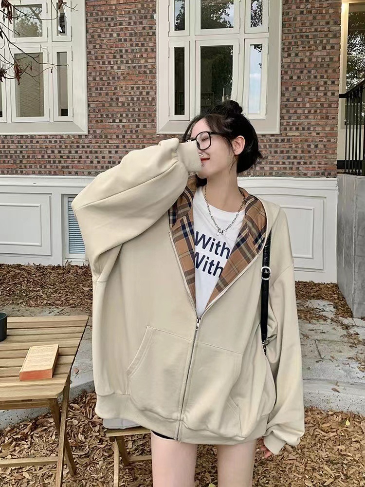 【格子拼接长袖连帽外套】慵懒风拉链加绒外套女 大码早秋宽松显瘦开衫上衣