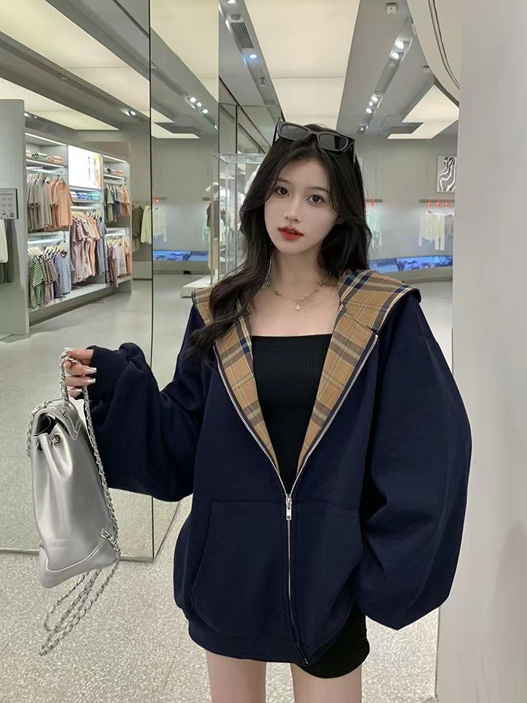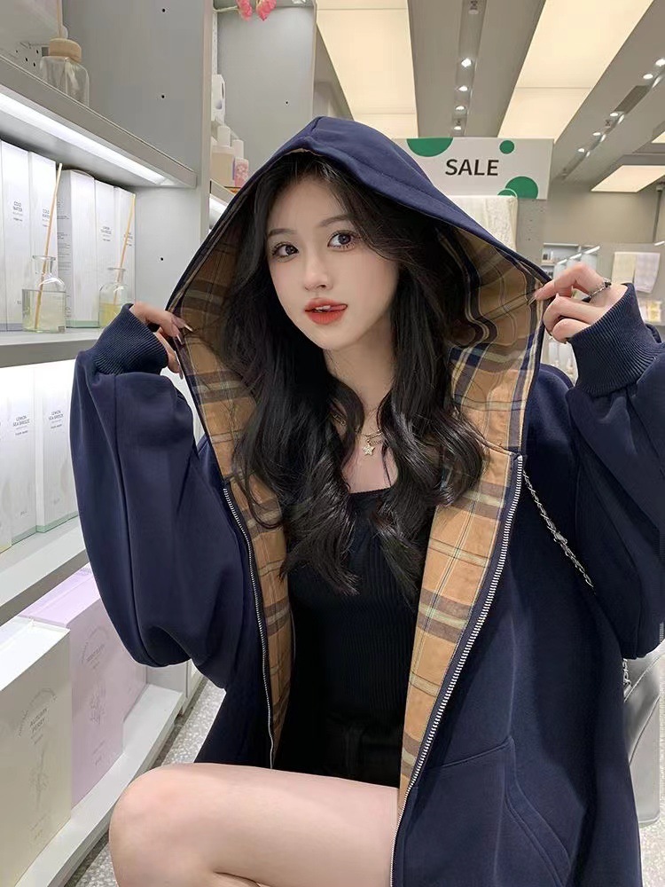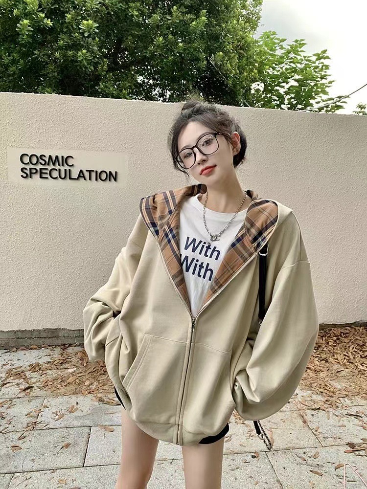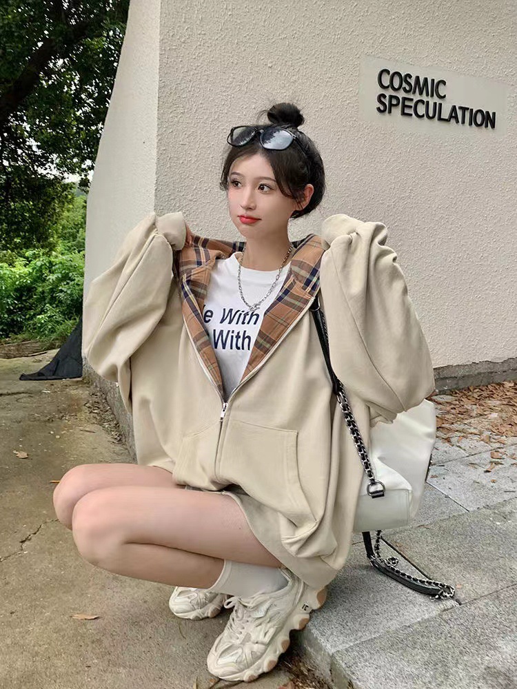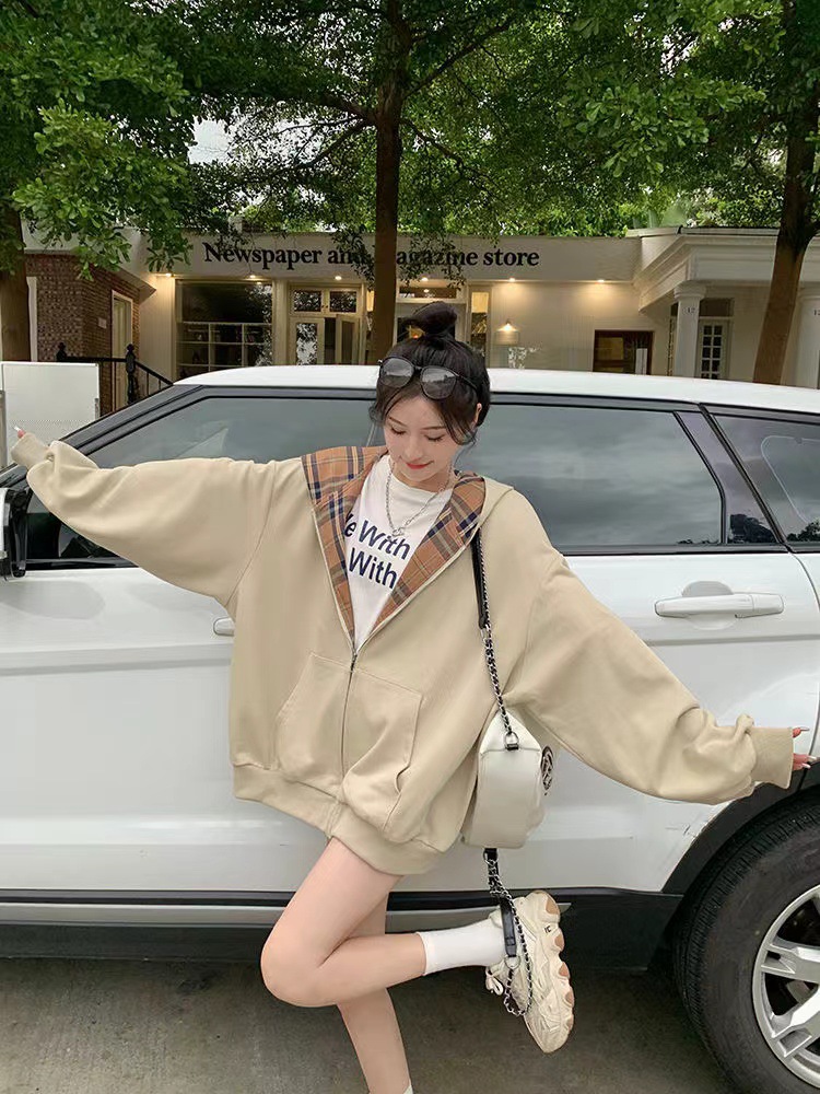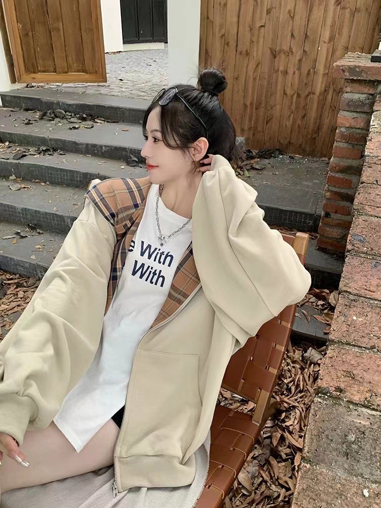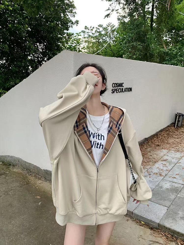 【格子拼接长袖连帽外套】慵懒风拉链加绒外套女 大码早秋宽松显瘦开衫上衣