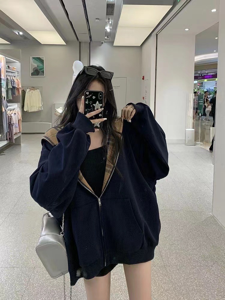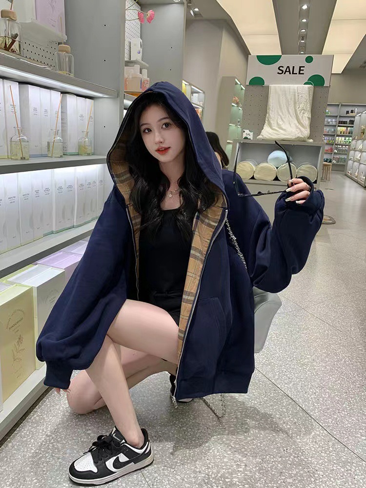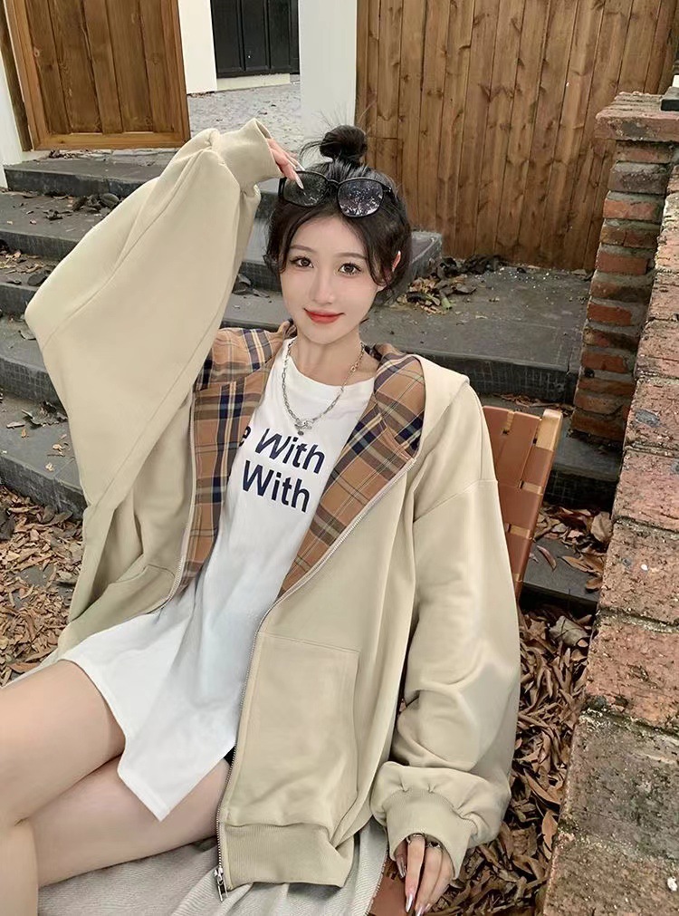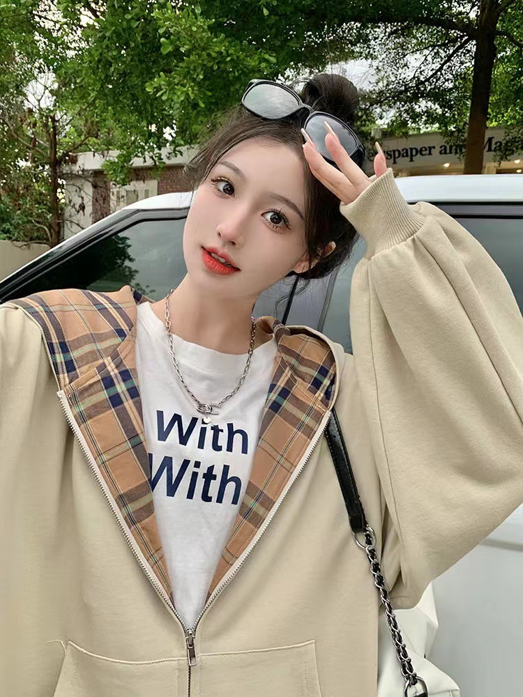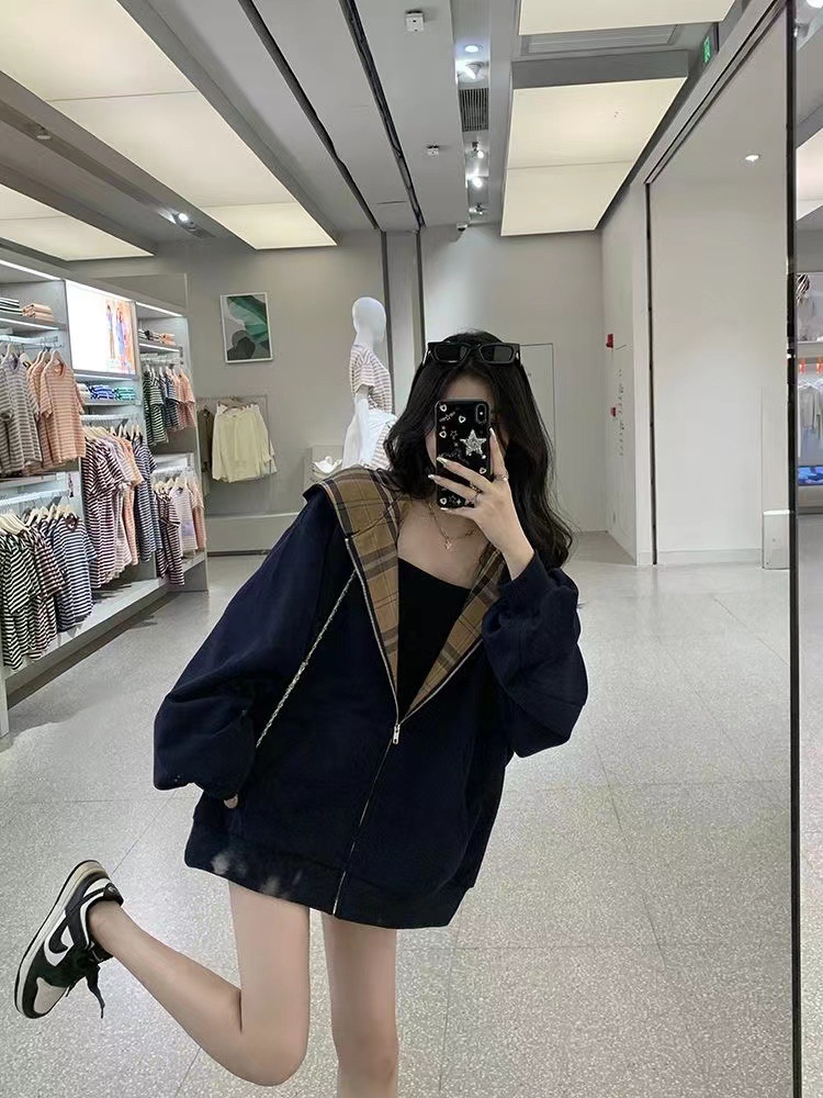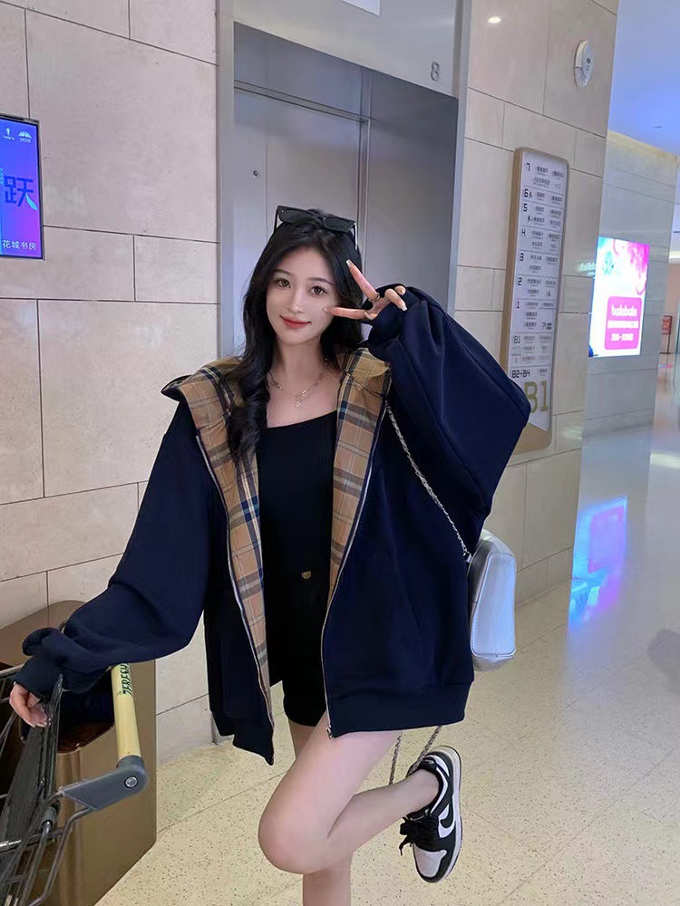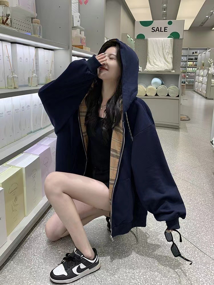 【格子拼接长袖连帽外套】慵懒风拉链加绒外套女 大码早秋宽松显瘦开衫上衣