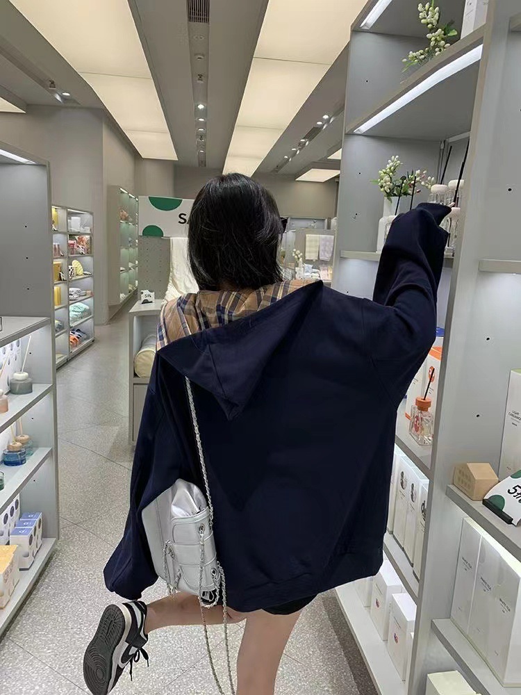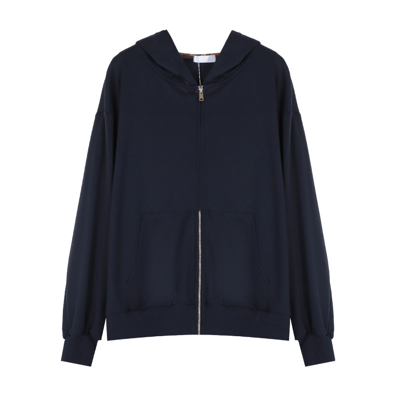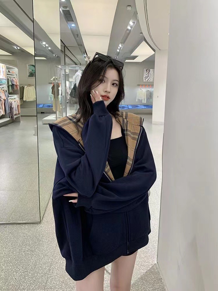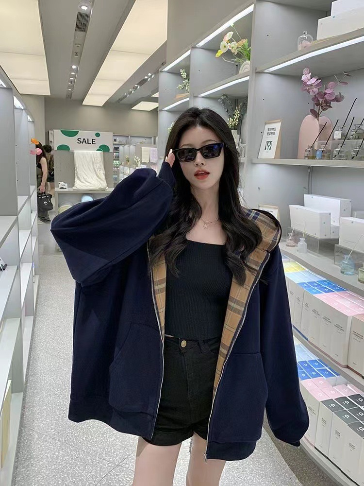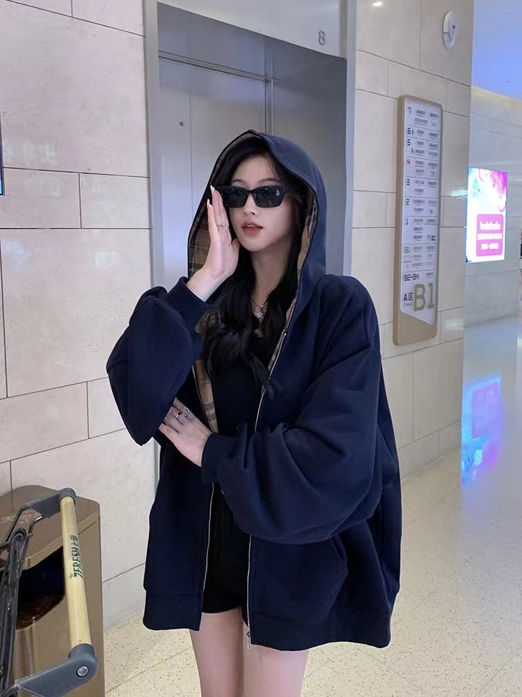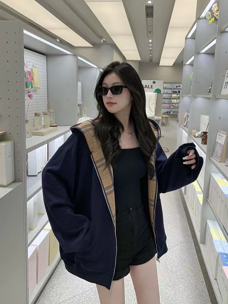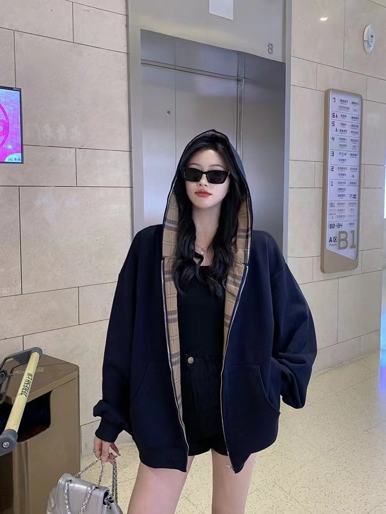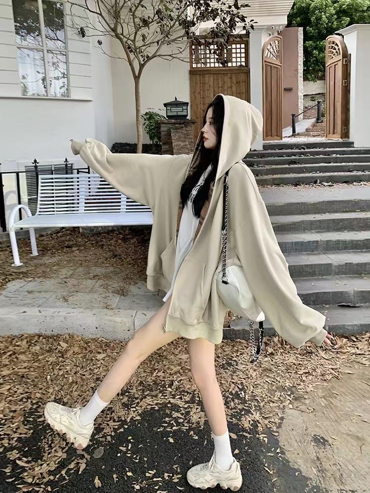 【格子拼接长袖连帽外套】慵懒风拉链加绒外套女 大码早秋宽松显瘦开衫上衣
