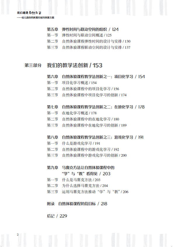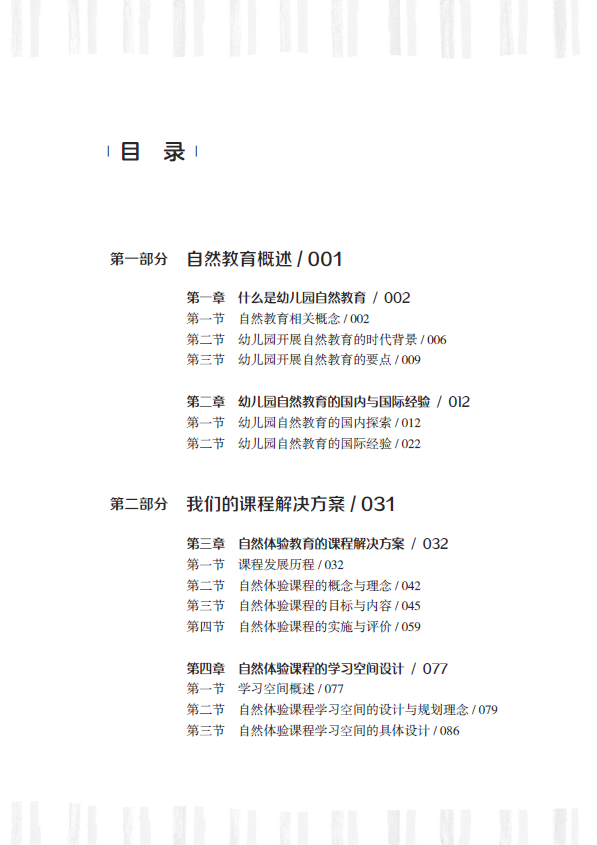 儿童与自然具有天然的联系,他们天生就对大自然具有强烈的好奇心和探索欲望,他们会通过观察、体验及与自然的互动来认识世界、发展自己。因此,大自然是孩子很好的课堂,幼儿园自然教育是促进幼儿发展的重要途径。本书是深圳市第九幼儿园多年的理论研究与实践探索成果的总结。九幼以自然教育为内容,通过系统改造学习空间、设计具有弹性的时间制度并将二者结合在一起,同时结合教学法的创新,打造了一个新的教学样态。这个新的教学样态名为“自然体验课程”,它以让儿童“认识自己”为课程起点,以“探索自然”为课程载体,以“创造世界”为课程归宿,旨在帮助幼儿形成正确的三观、养成良好的习惯、形成健全的人格、获得适应未来生活的能力,同时也为国家和社会培养能够面向未来的人才。