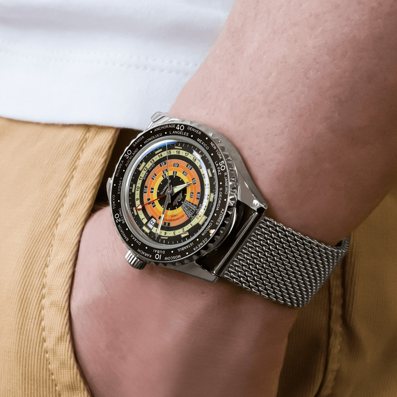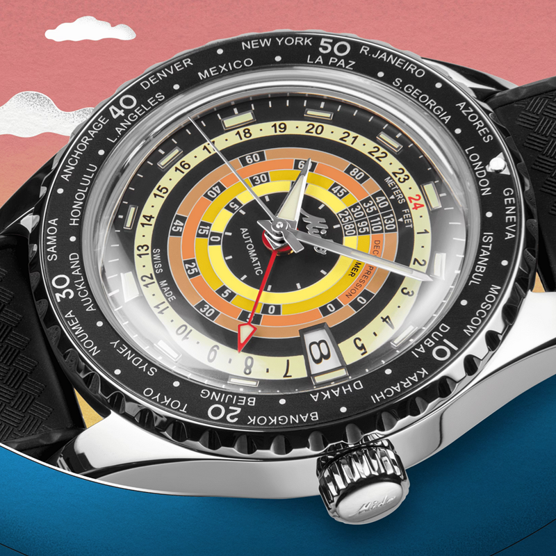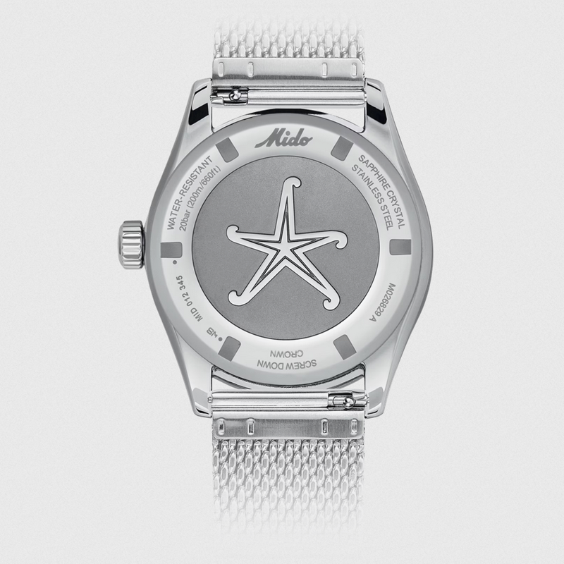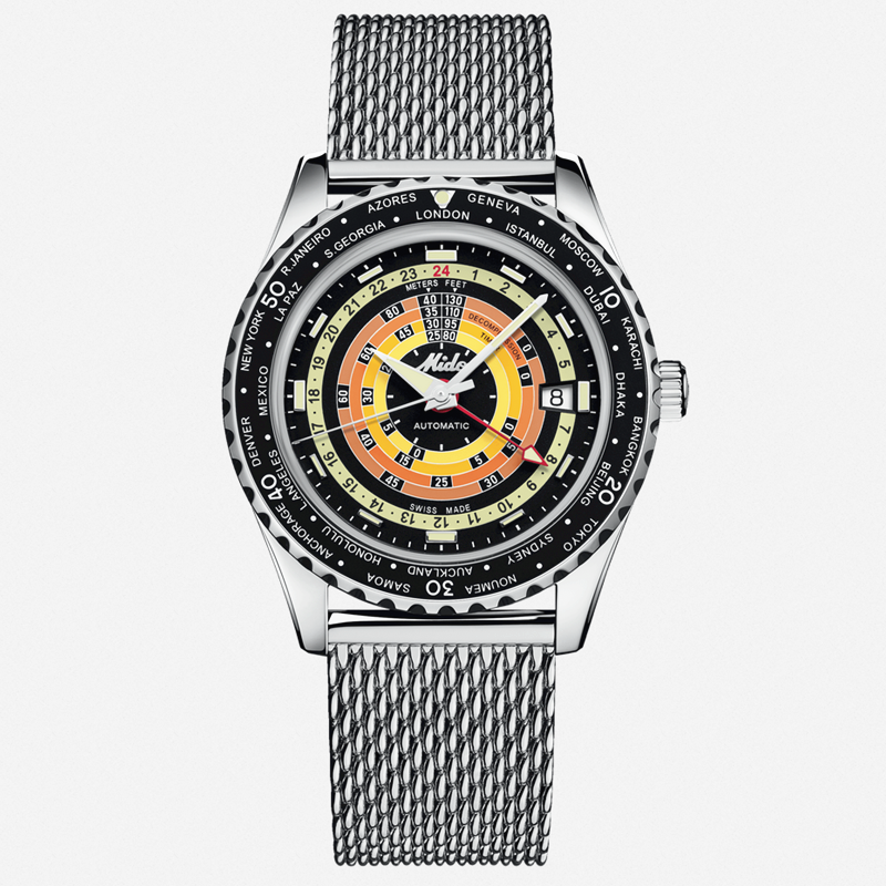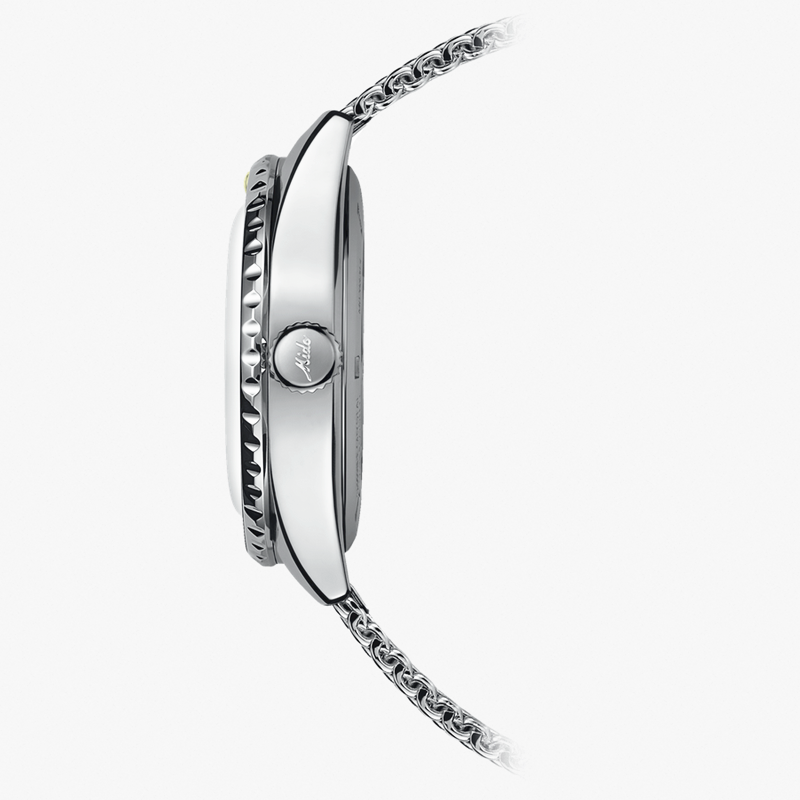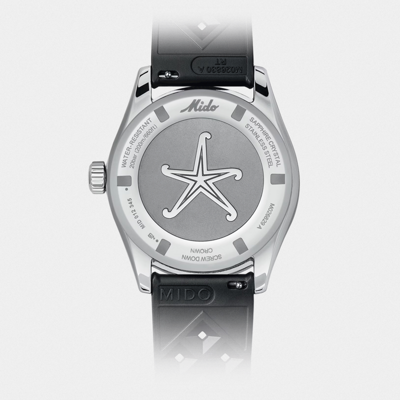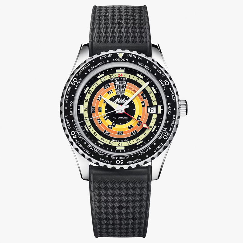 镜面 材质 | 盒型蓝宝石玻璃表镜 | 表盘 | 丝光打磨不锈钢表壳,黑色表盘,抛光刻度经Super-LumiNova®自然色夜光涂层处理,日期窗位于3点钟位置。饰有抛光MIDO斜体标志。减压等级由4个彩圈表示(由黄到橙的渐变色)。钻石切割时针和分针,经Super-LumiNova®自然色夜光涂层处理;钻石切割秒针,第二时区指针经过红色喷漆处理,并饰有自然色Super-LumiNova®夜光涂层。 带有黑色铝环和银色标记的双向旋转表圈 日期显示 GMT |