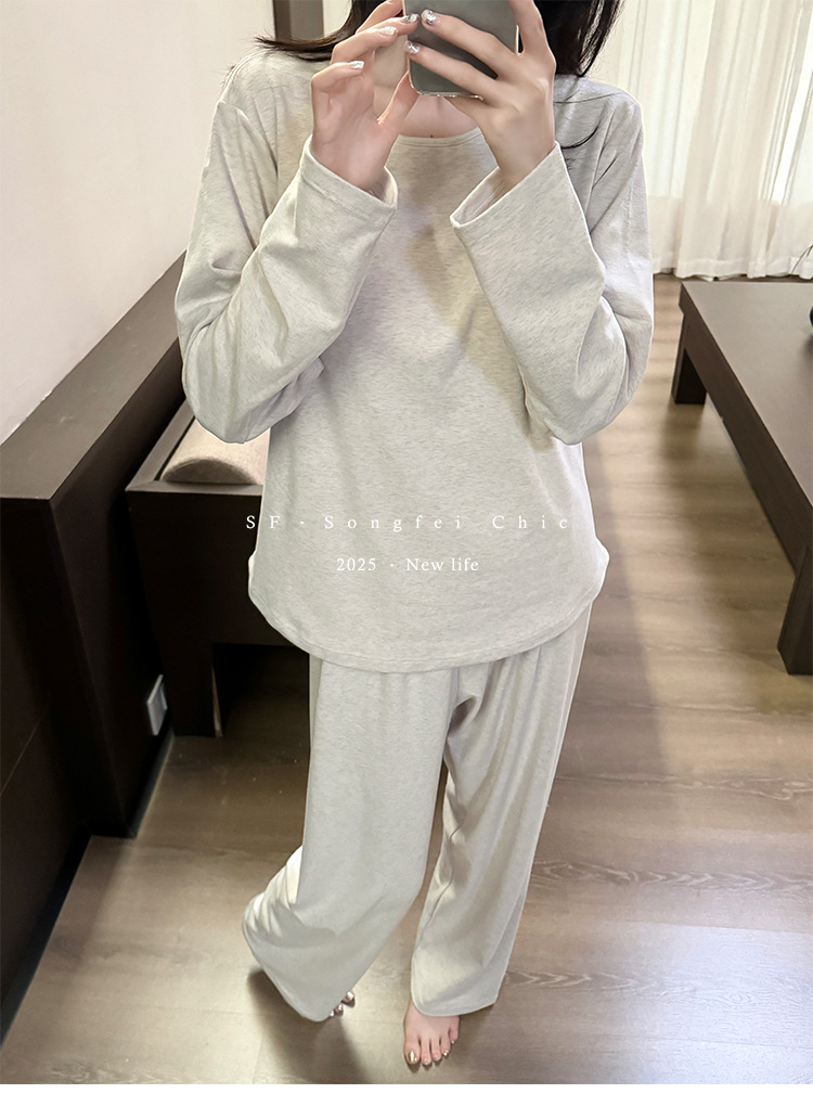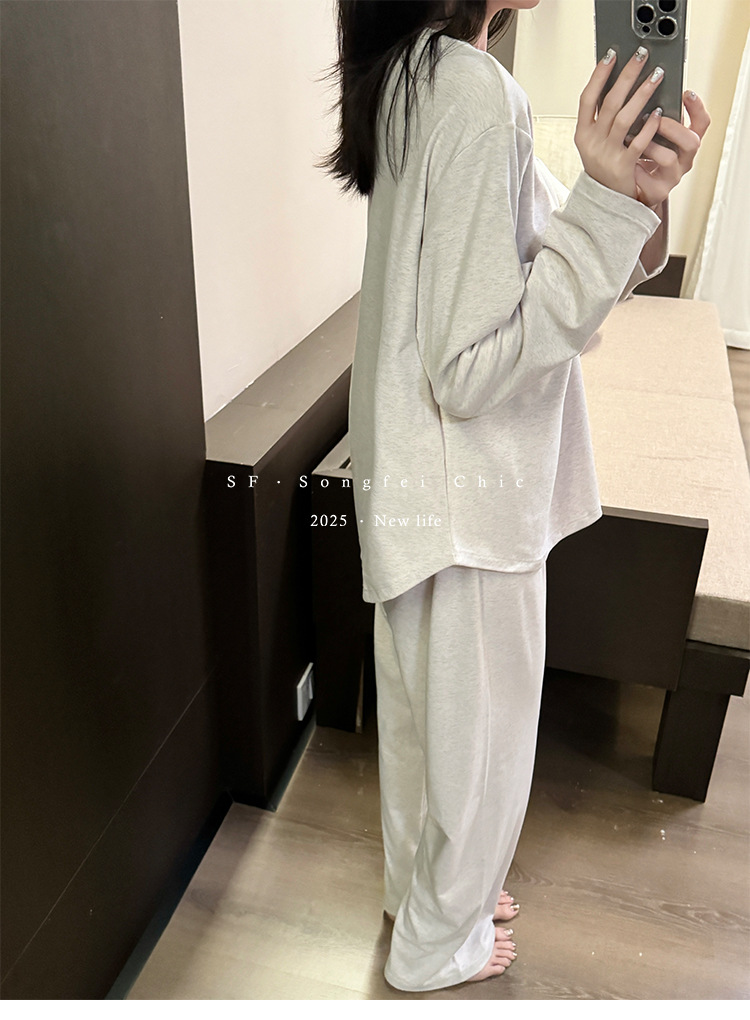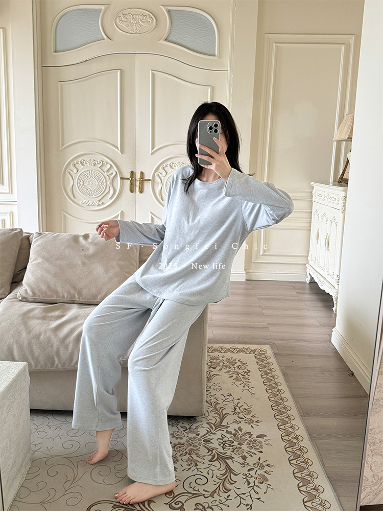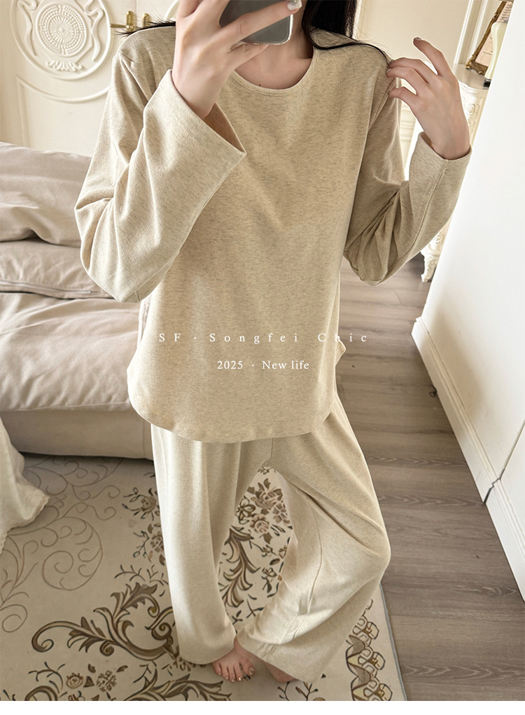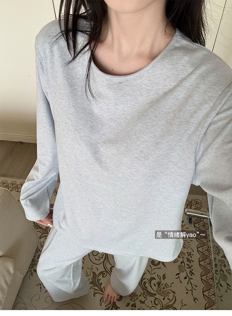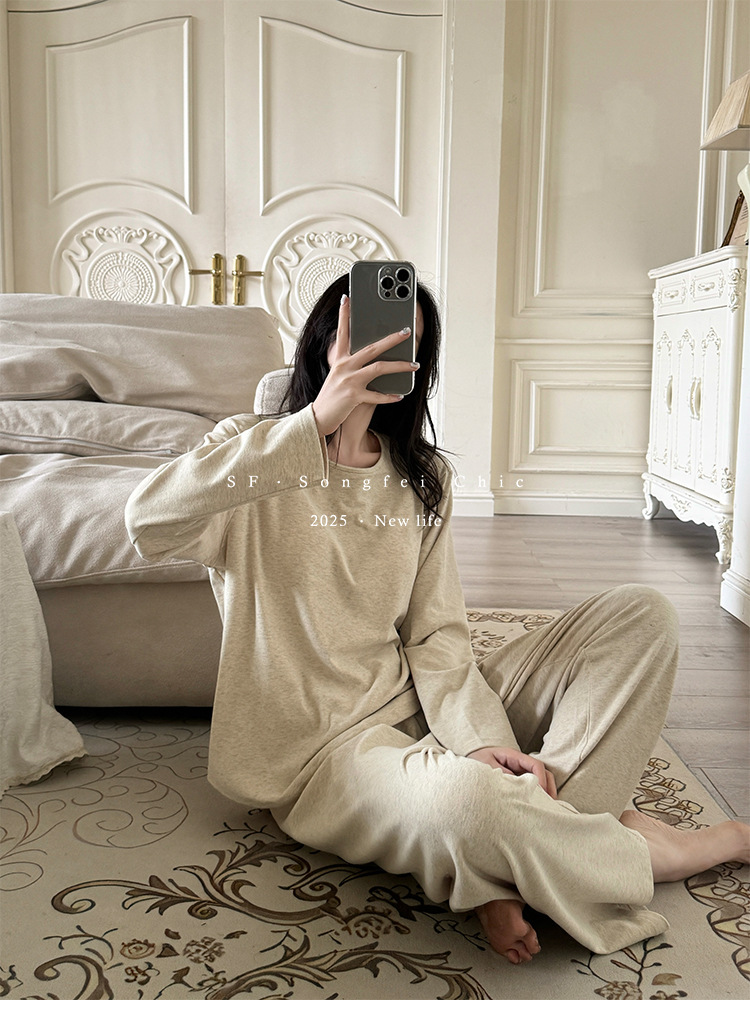 秋冬带胸垫磨毛加厚睡衣套装 可外穿宽松圆领套头显瘦女士家居服