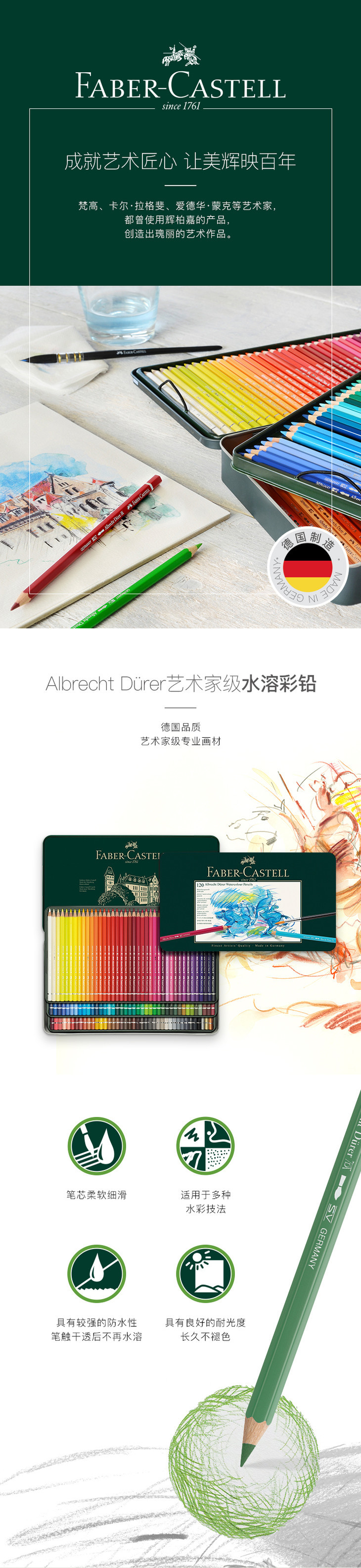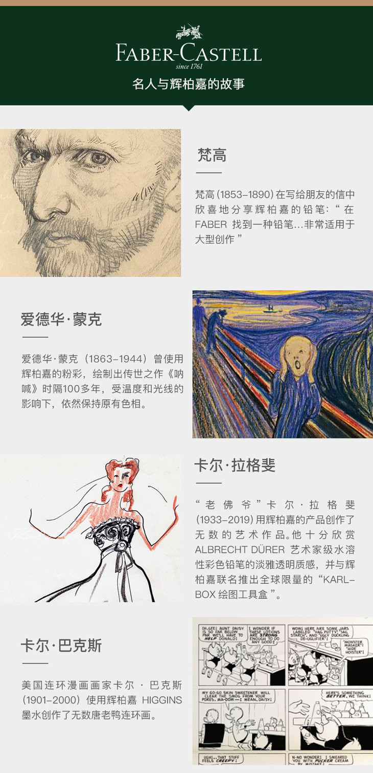 - 德国辉柏嘉,始创于1761年的家族品牌,历经259年岁月洗礼的制笔权威,一直致力于提供高品质书写及绘画艺术创作工具的专业制造商。
