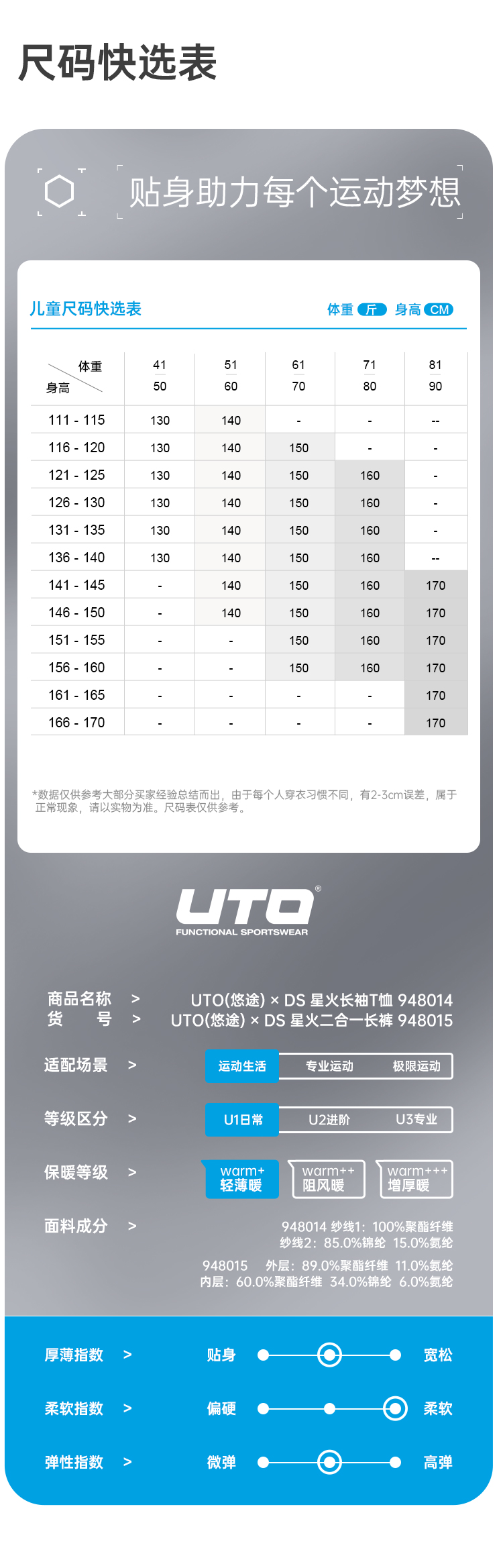 UTO悠途助能款儿童运动功能户外保暖内衣套装