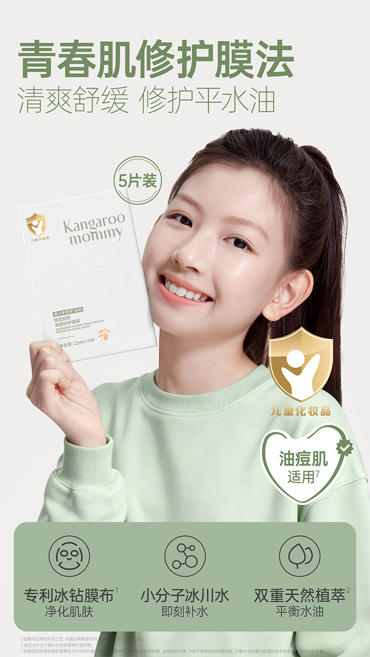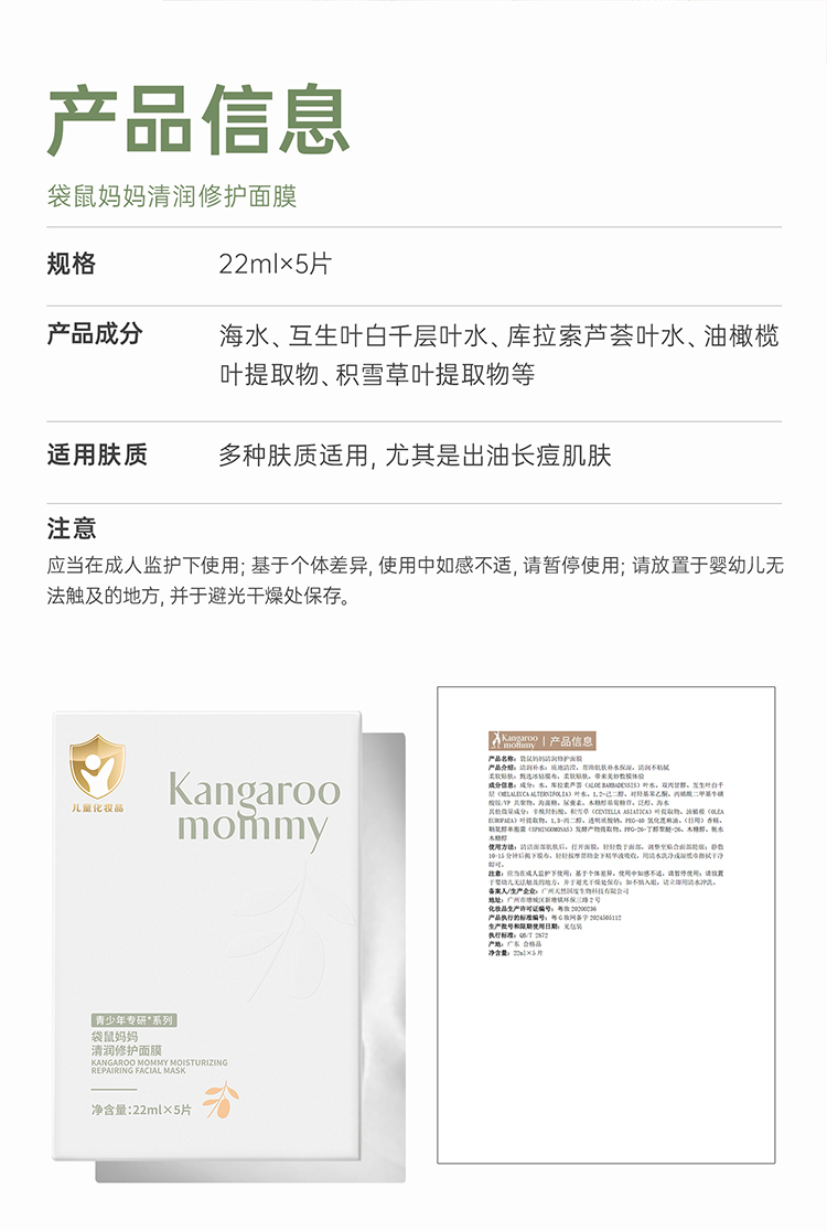 【青少年面膜】补水修护油痘肌 袋鼠妈妈清润修护面膜(5片/盒)