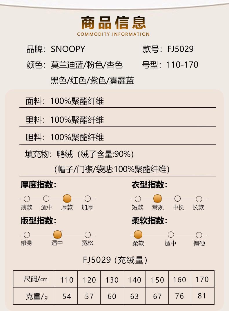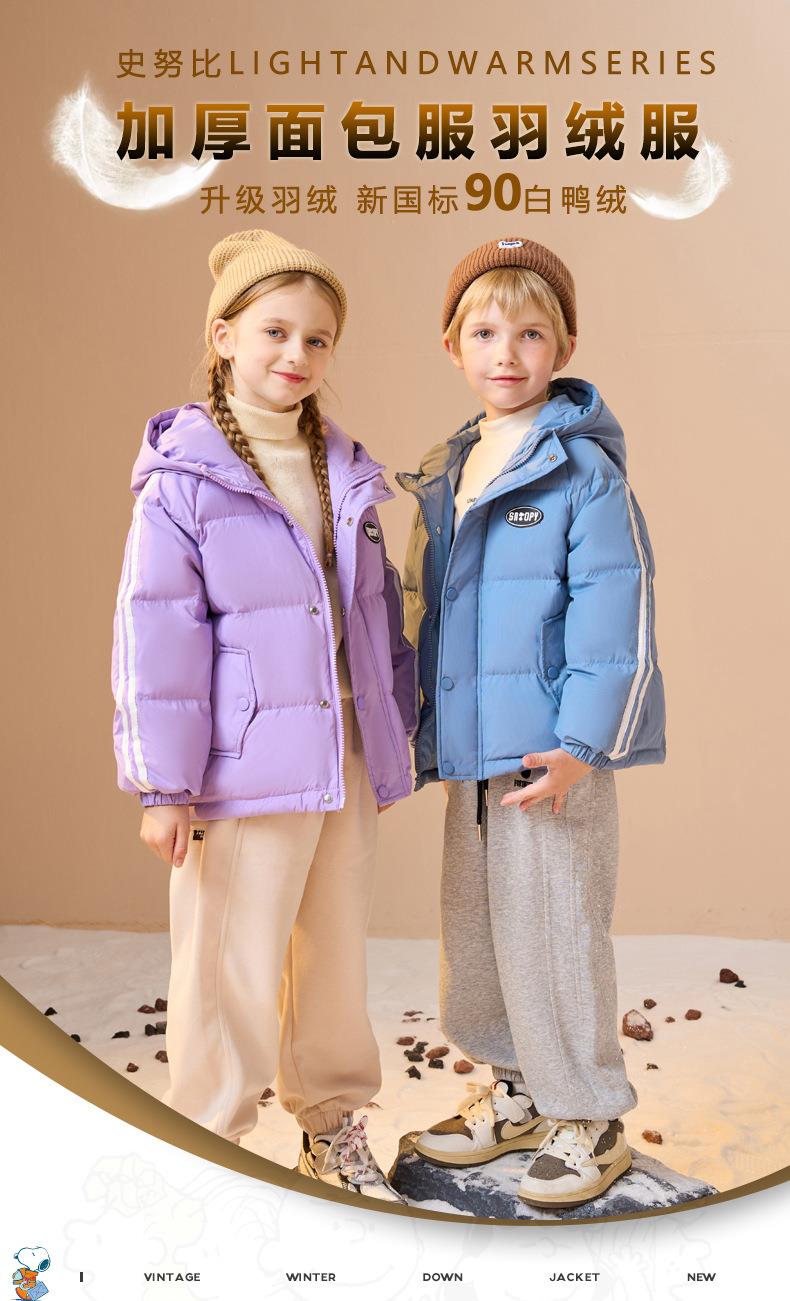 史努比儿童韩版面包服羽绒服男女童休闲外套连帽中大童儿童羽绒服