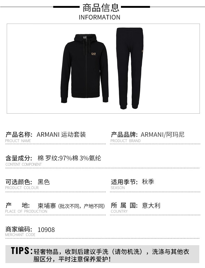 ARMANI EA7休闲运动系列男士带帽运动套装 10908
