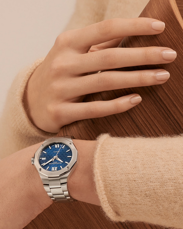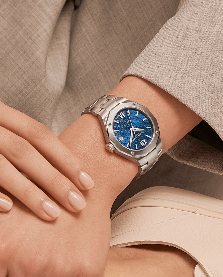 镜面材质 | 蓝宝石水晶玻璃 | 表盘 | 精钢表壳 饰有独特图案的蓝色表盘 四颗螺钉十二边形表圈 日期显示 |