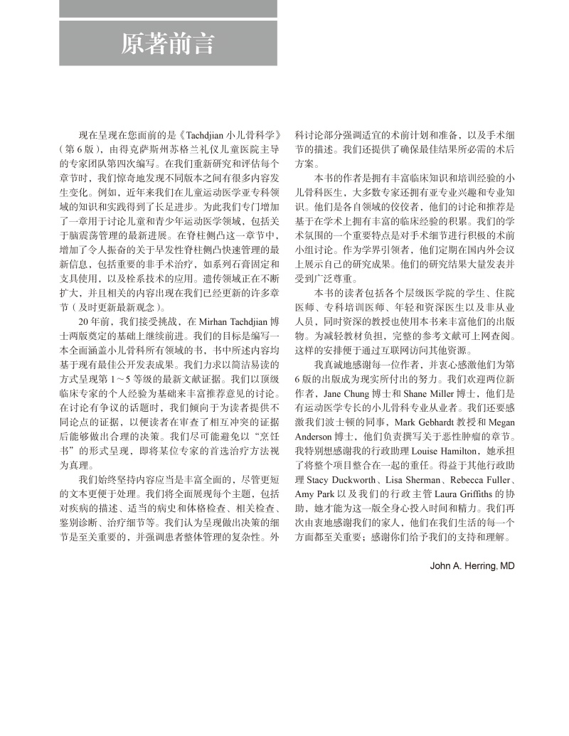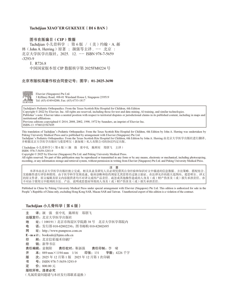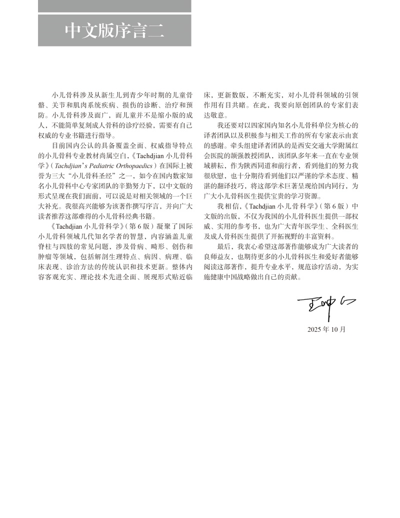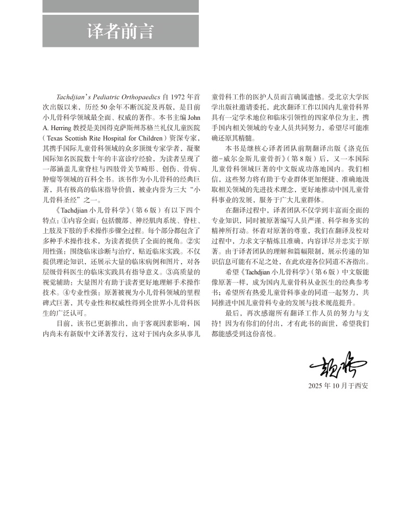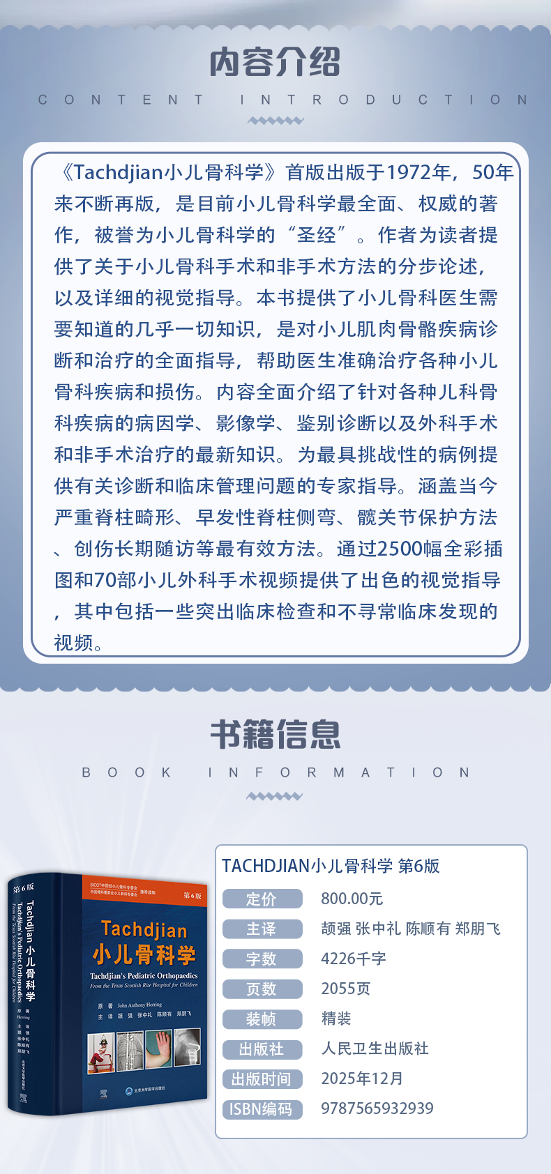《Tachdjian小儿骨科学》首版出版于1972年,50年来不断再版,是目前小儿骨科学最全面、权威的著作,被誉为小儿骨科学的“圣经”。作者为读者提供了关于小儿骨科手术和非手术方法的分步论述,以及详细的视觉指导。本书提供了小儿骨科医生需要知道的几乎一切知识,是对小儿肌肉骨骼疾病诊断和治疗的全面指导,帮助医生准确治疗各种小儿骨科疾病和损伤。内容全面介绍了针对各种儿科骨科疾病的病因学、影像学、鉴别诊断以及外科手术和非手术治疗的最新知识。为最具挑战性的病例提供有关诊断和临床管理问题的专家指导。涵盖当今严重脊柱畸形、早发性脊柱侧弯、髋关节保护方法、创伤长期随访等最有效方法。通过2500幅全彩插图和70部小儿外科手术视频提供了出色的视觉指导,其中包括一些突出临床检查和不寻常临床发现的视频。