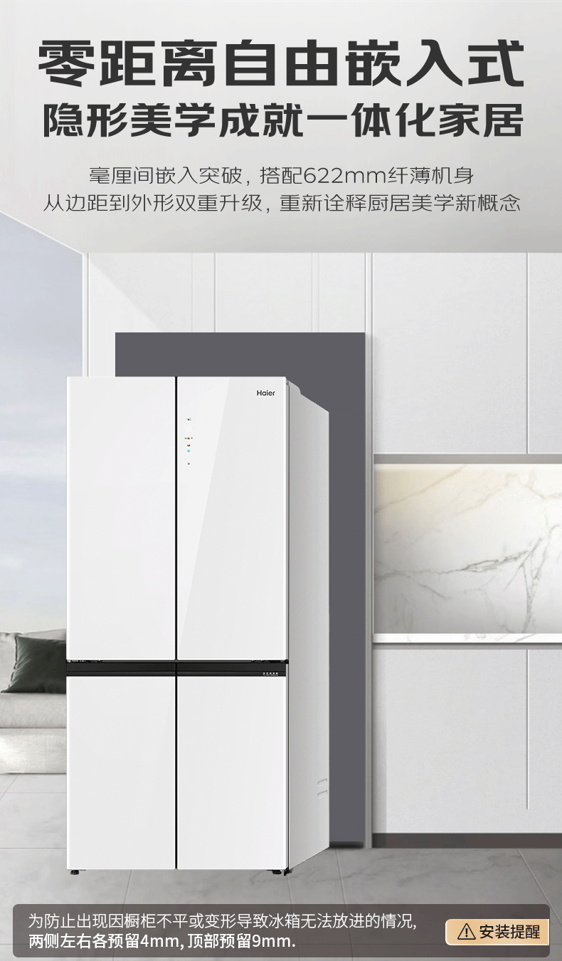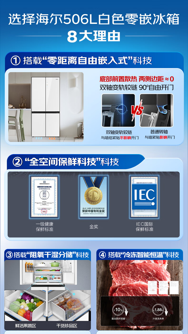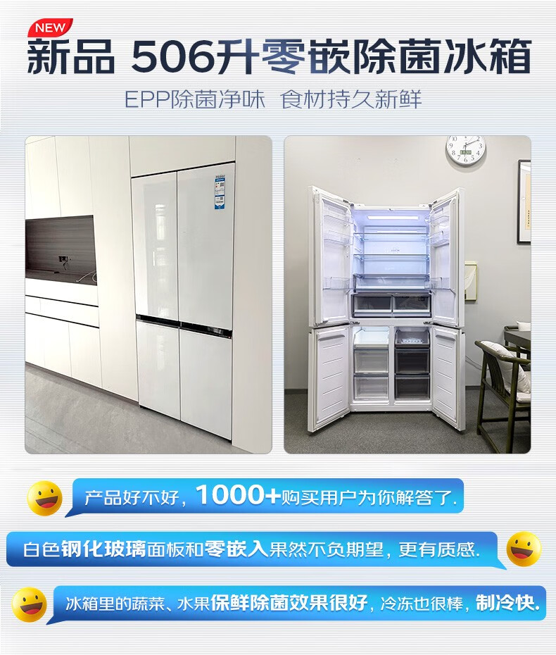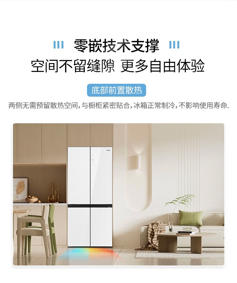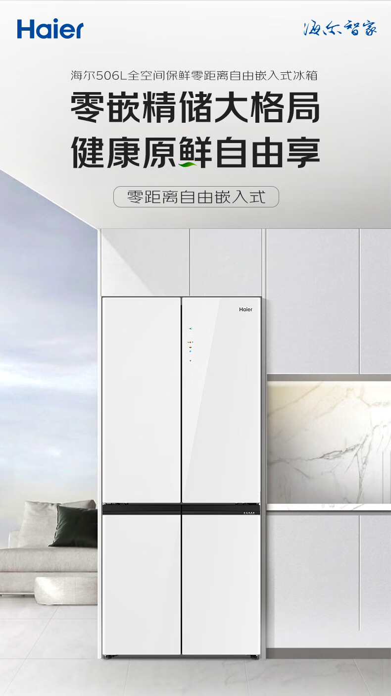 海尔(Haier)冰箱零距离嵌入式全空间保鲜 四开门十字对开门一级双循环风冷无霜家用超薄零嵌除菌净味白色冰箱 506L全空间保鲜+EPP除菌净味+零嵌+底部散热