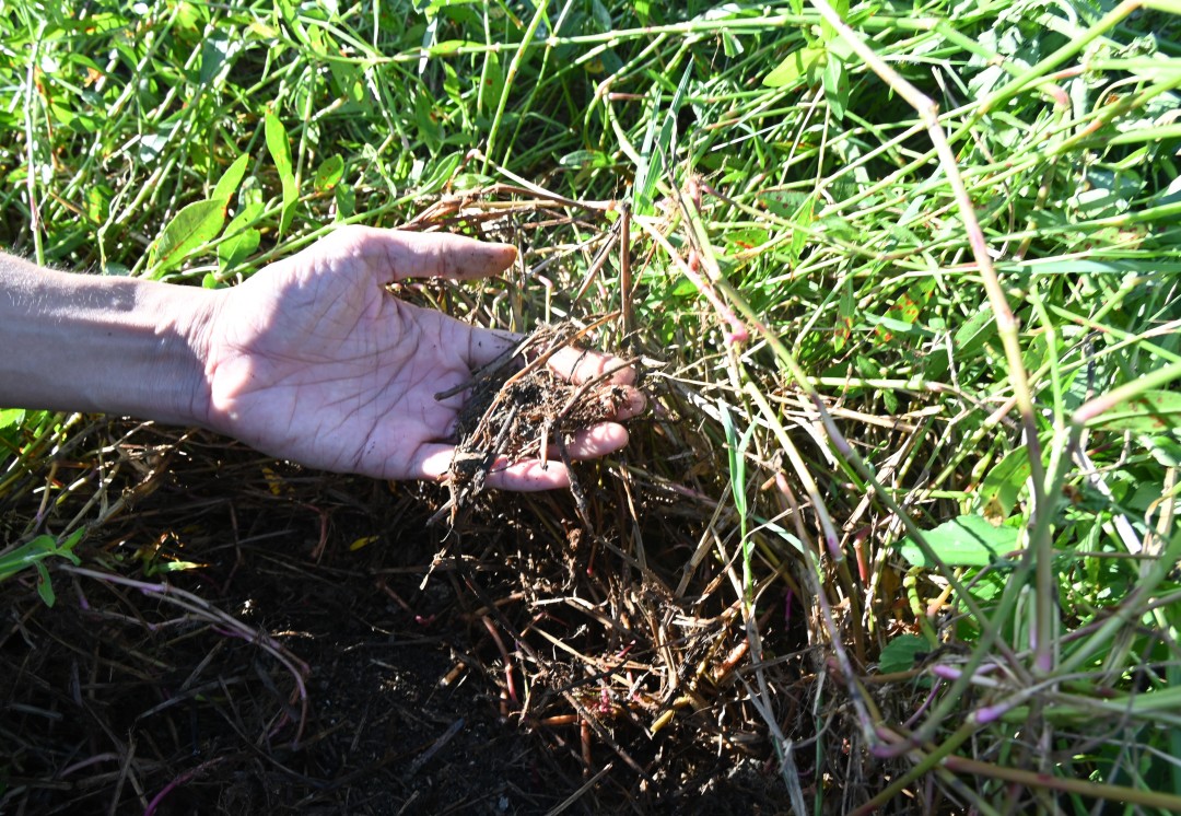 果园杂草共生,动植物丰富多样,在高温天气进入果园也能感受到清凉舒适的感觉,拔开杂草后观察植物根系发达,土地的保湿效果很好,大量杂草腐烂后转化为丰富的腐殖质。