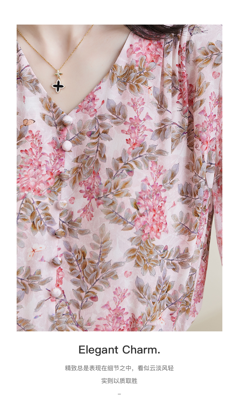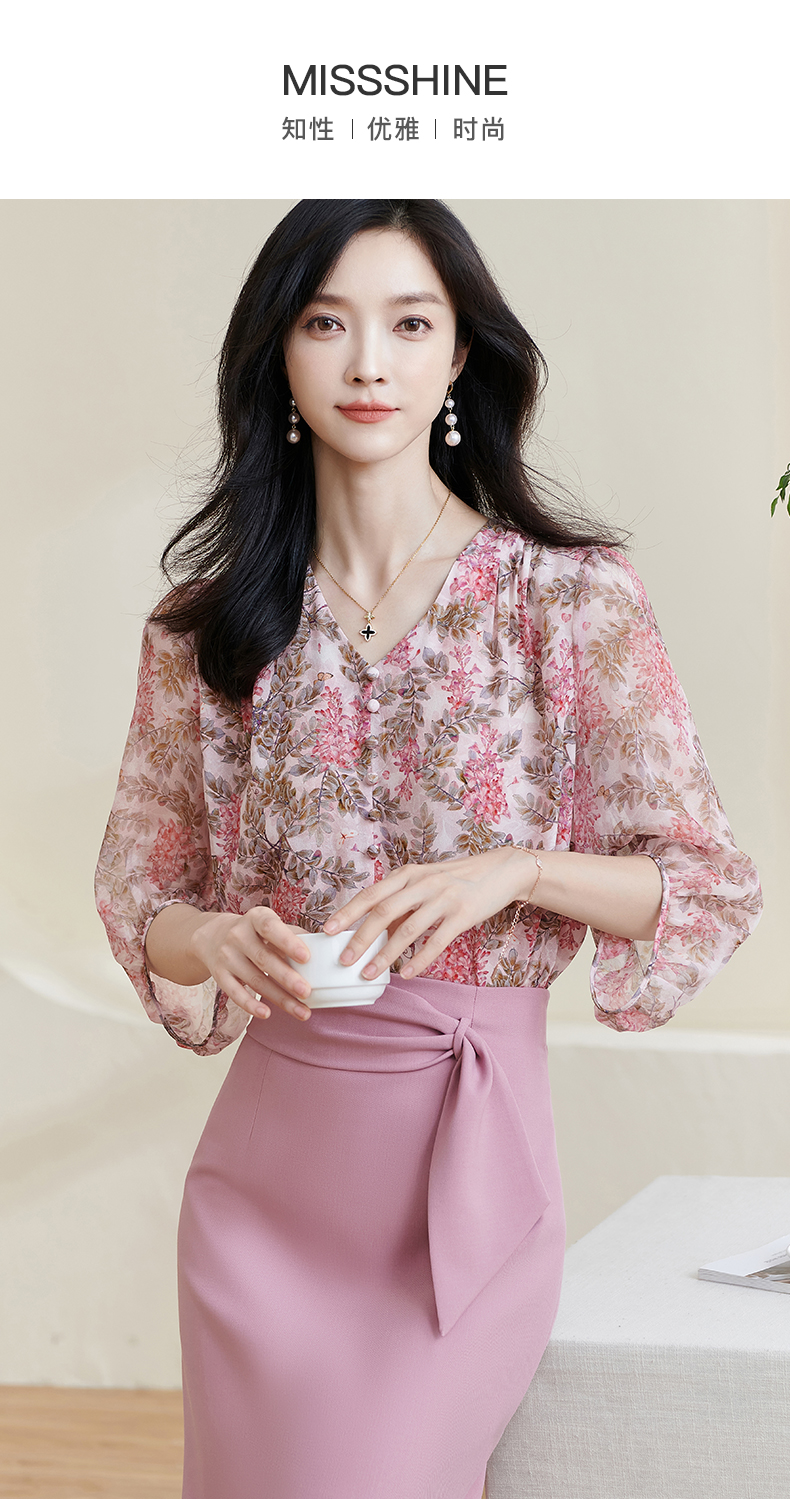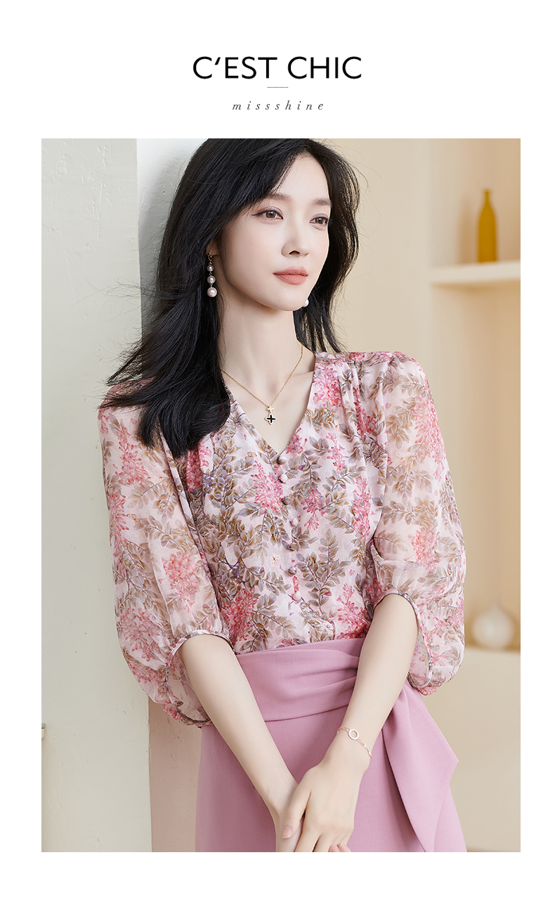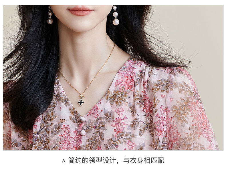 米思阳2026夏季新款100%桑蚕丝淑女粉色衬衫泡泡袖碎花上衣女1330/1059