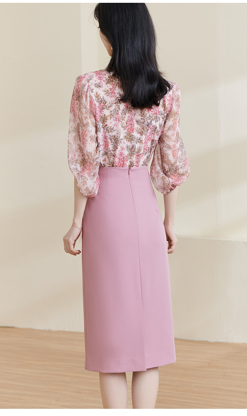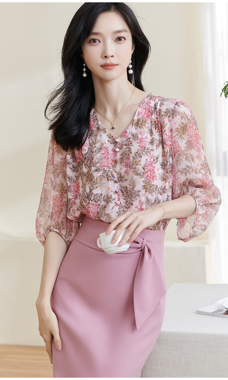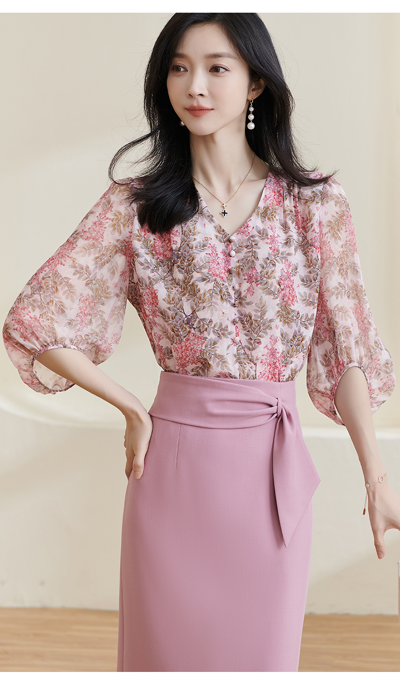 米思阳2026夏季新款100%桑蚕丝淑女粉色衬衫泡泡袖碎花上衣女1330/1059