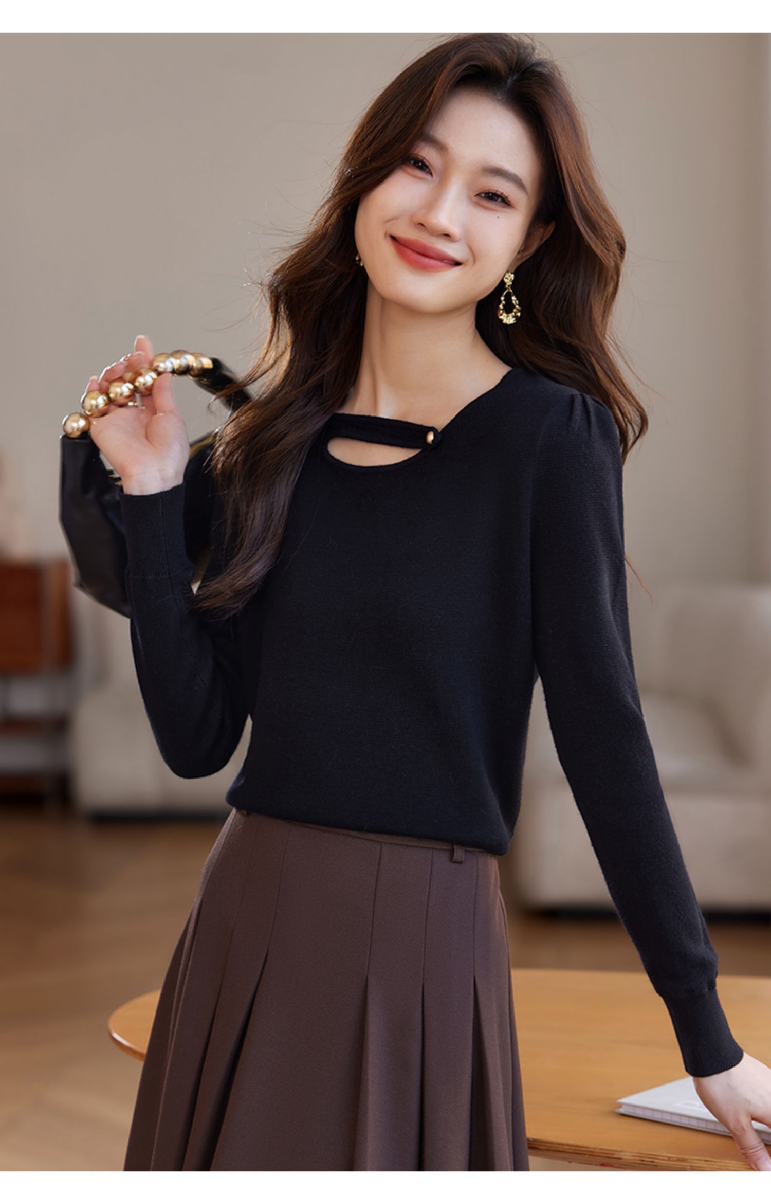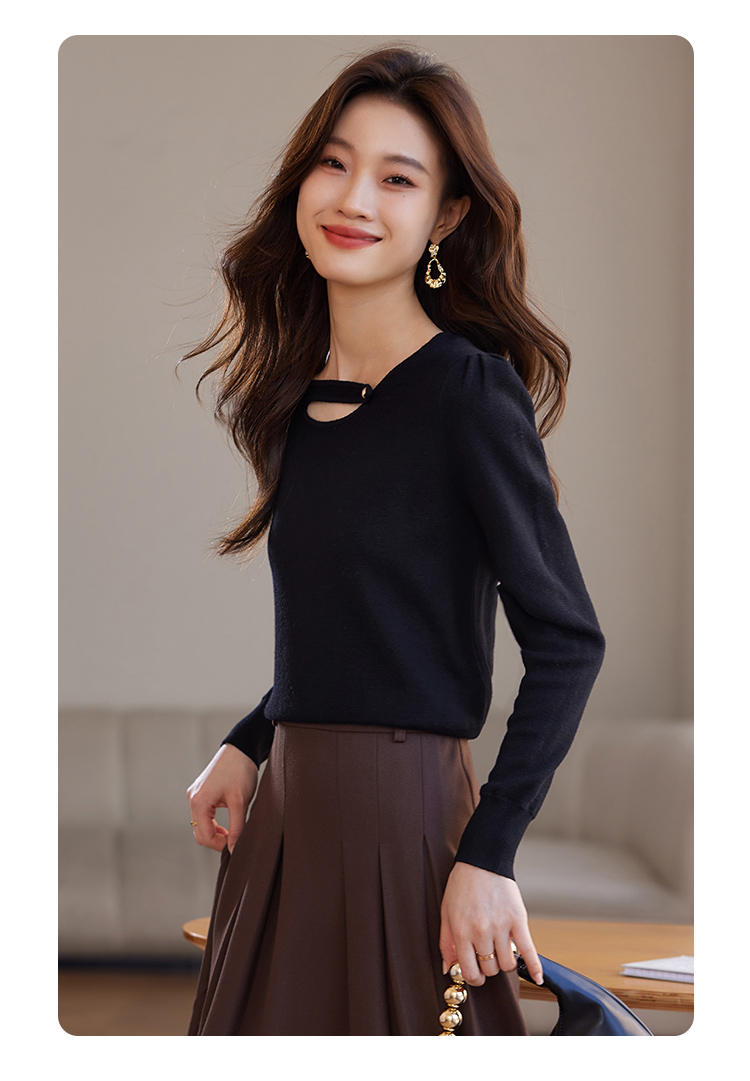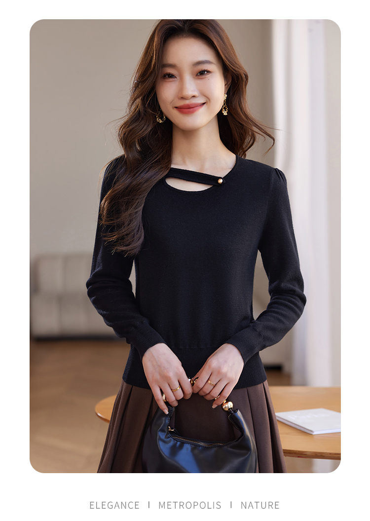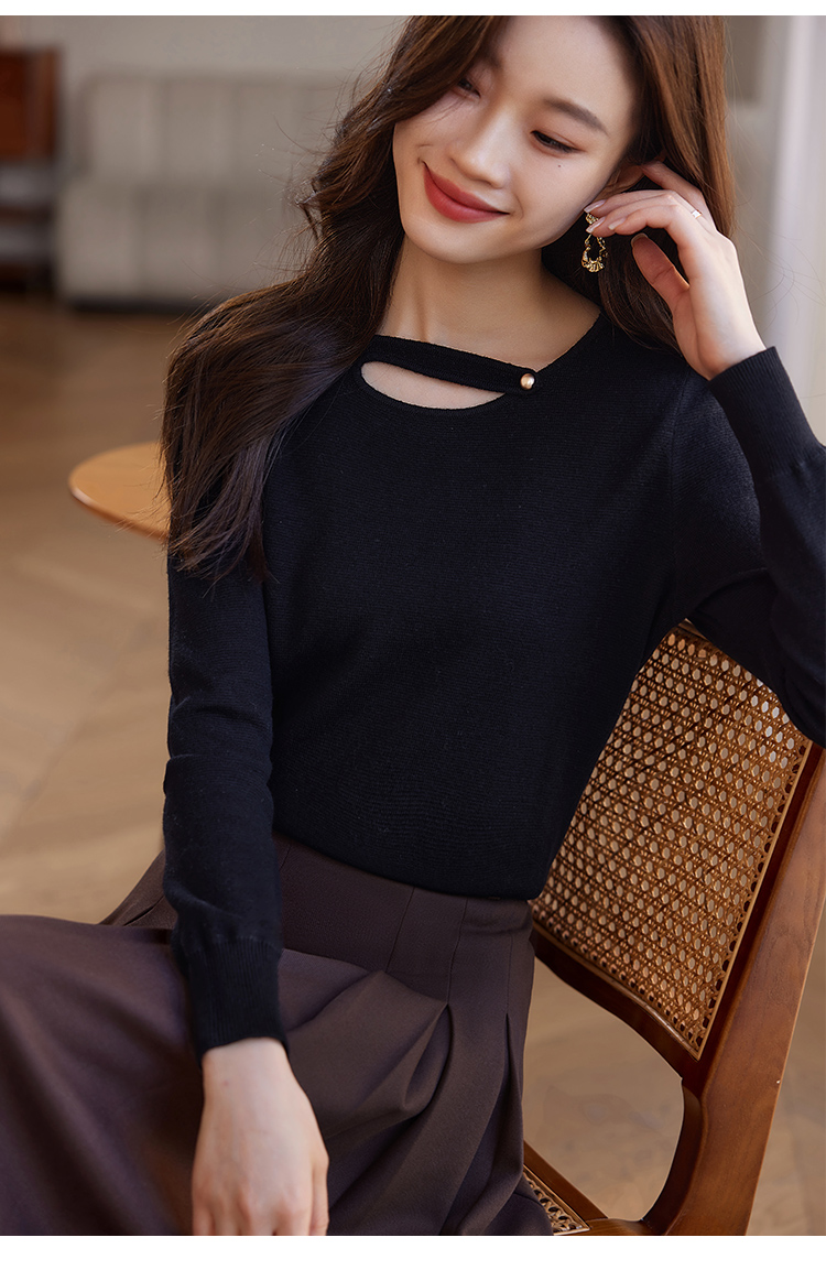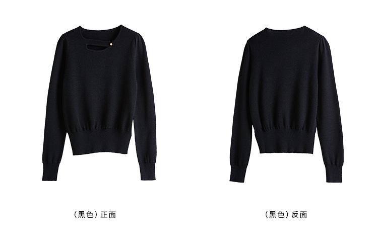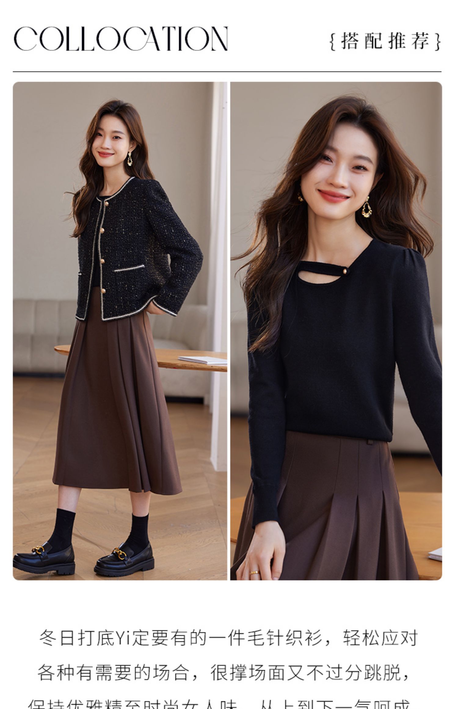 【年终特卖】熙世界黑色时尚针织打底衫女秋冬设计感圆领宽松软糯风内搭毛衣