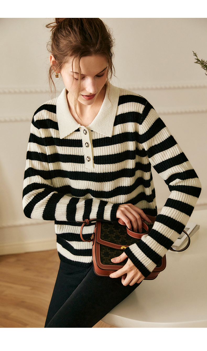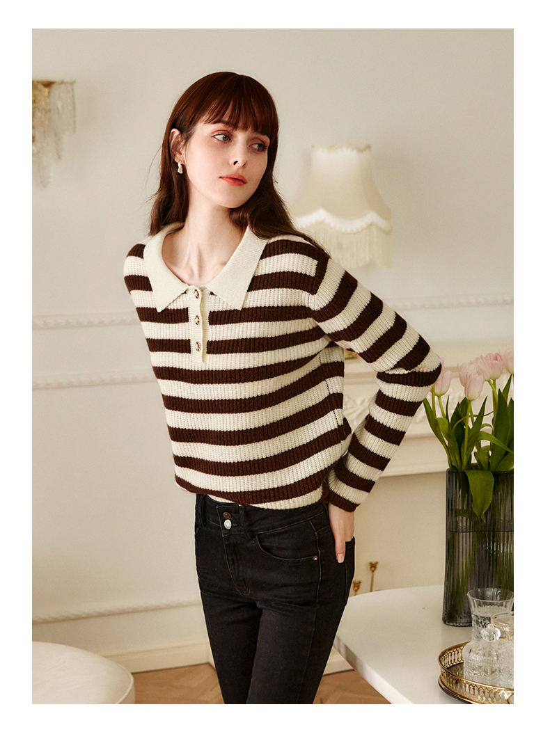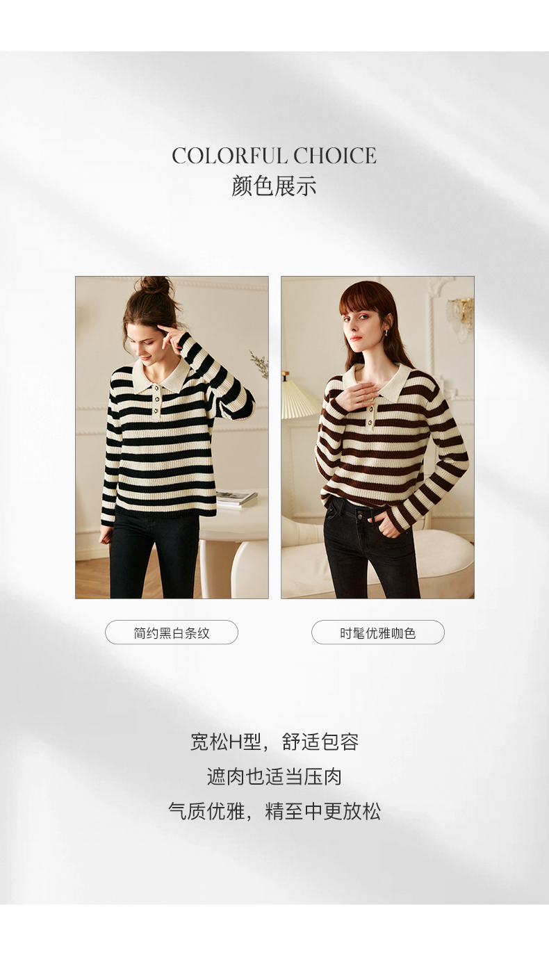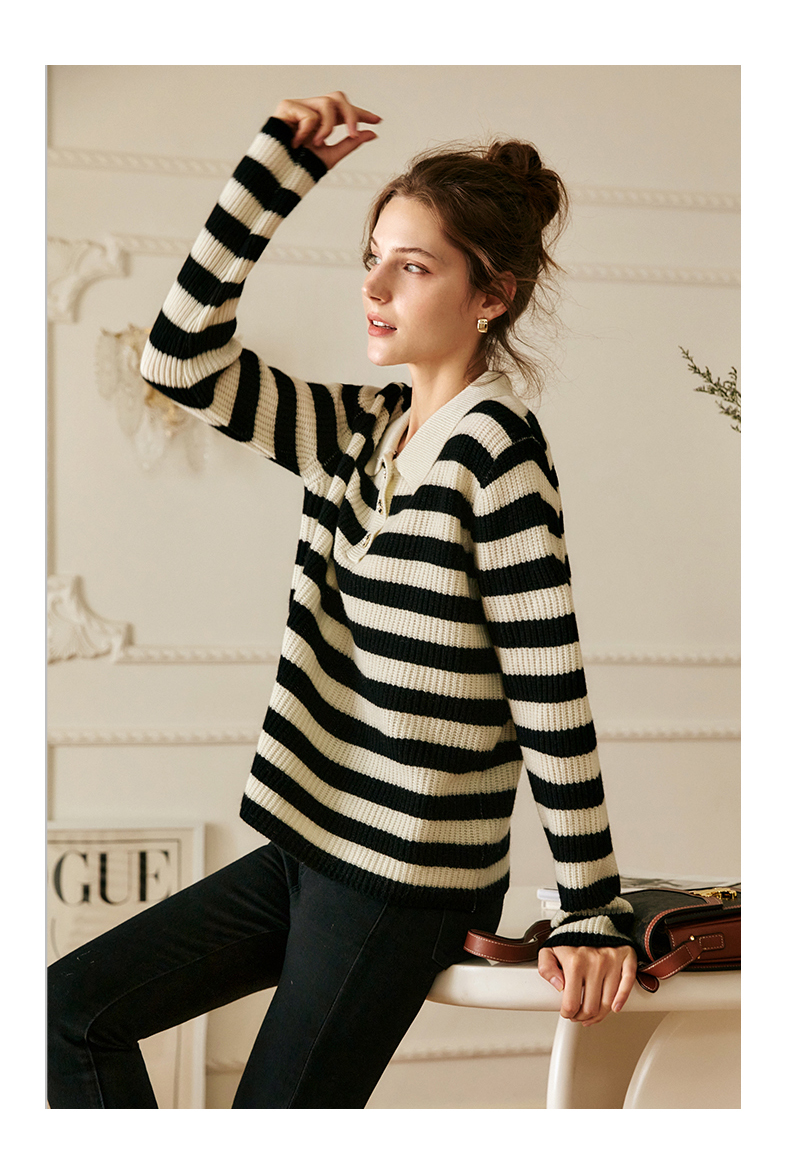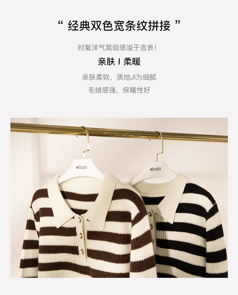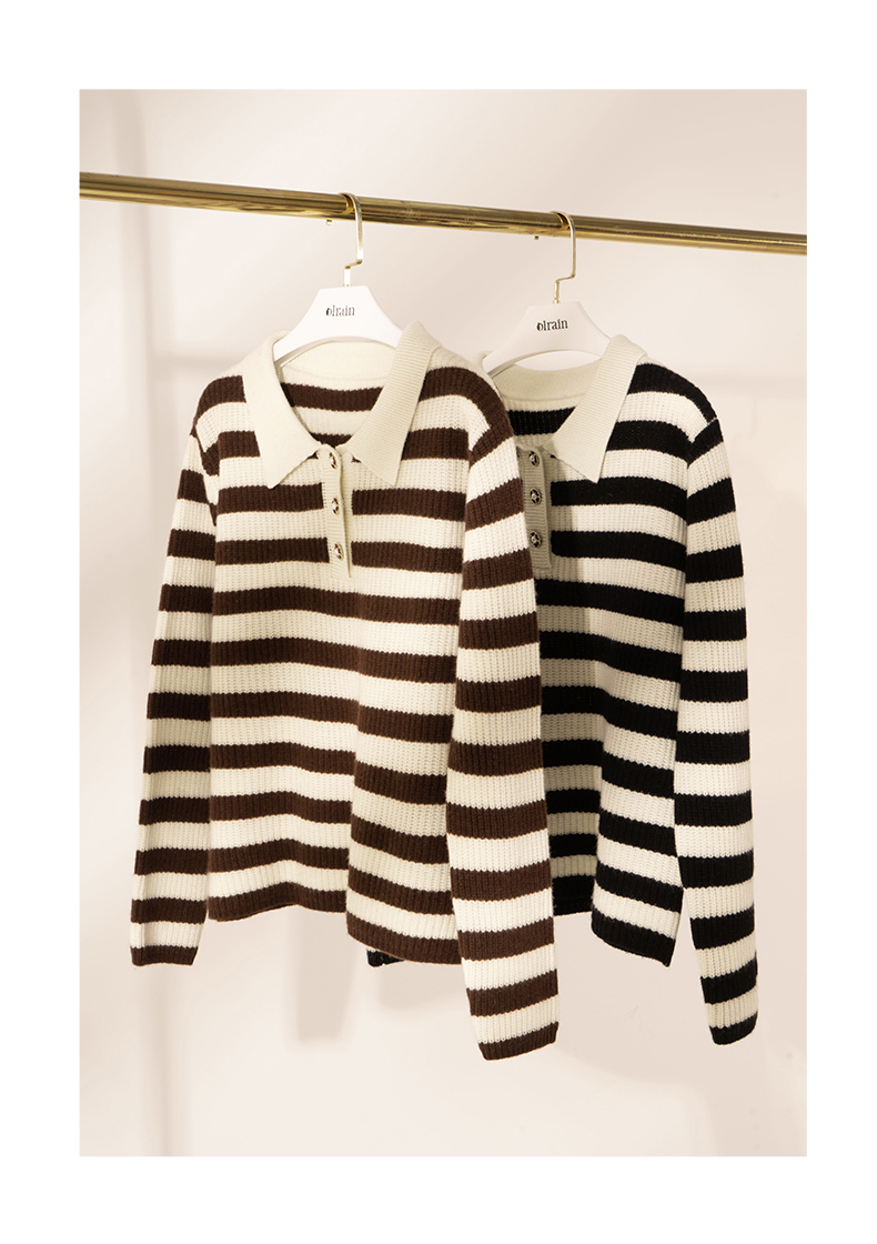 OLrain欧芮儿条纹针织衫女冬2025新款法式宽松显瘦POLO领长袖上衣