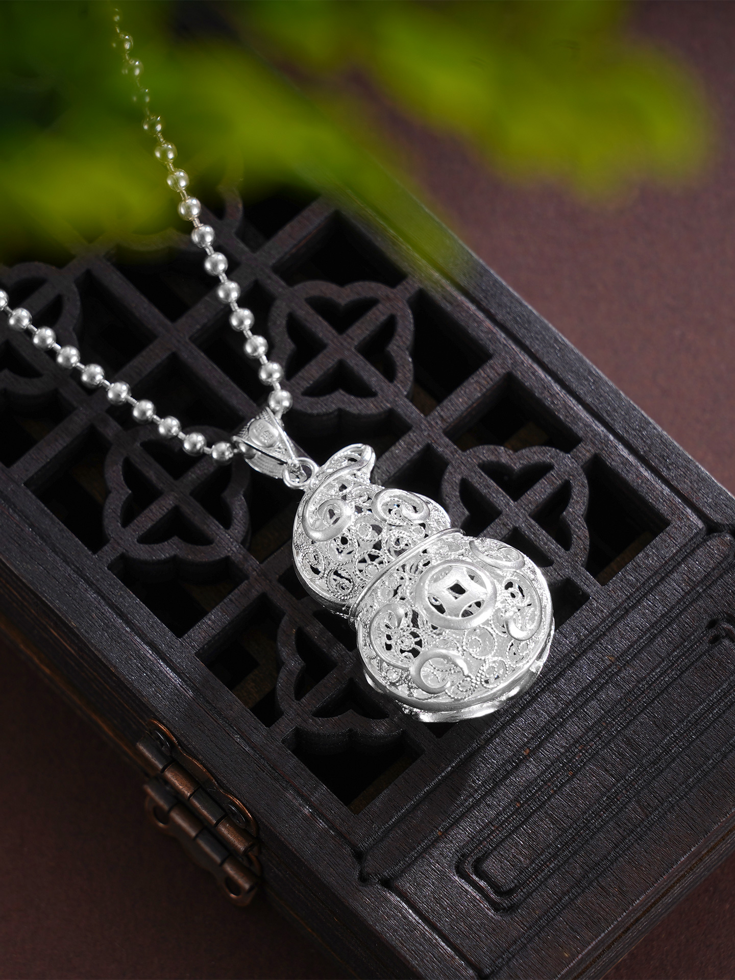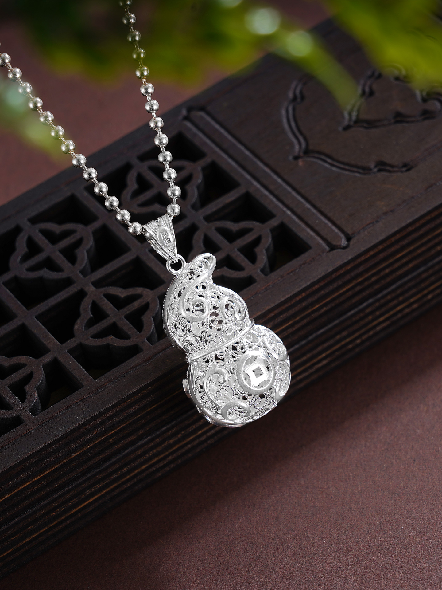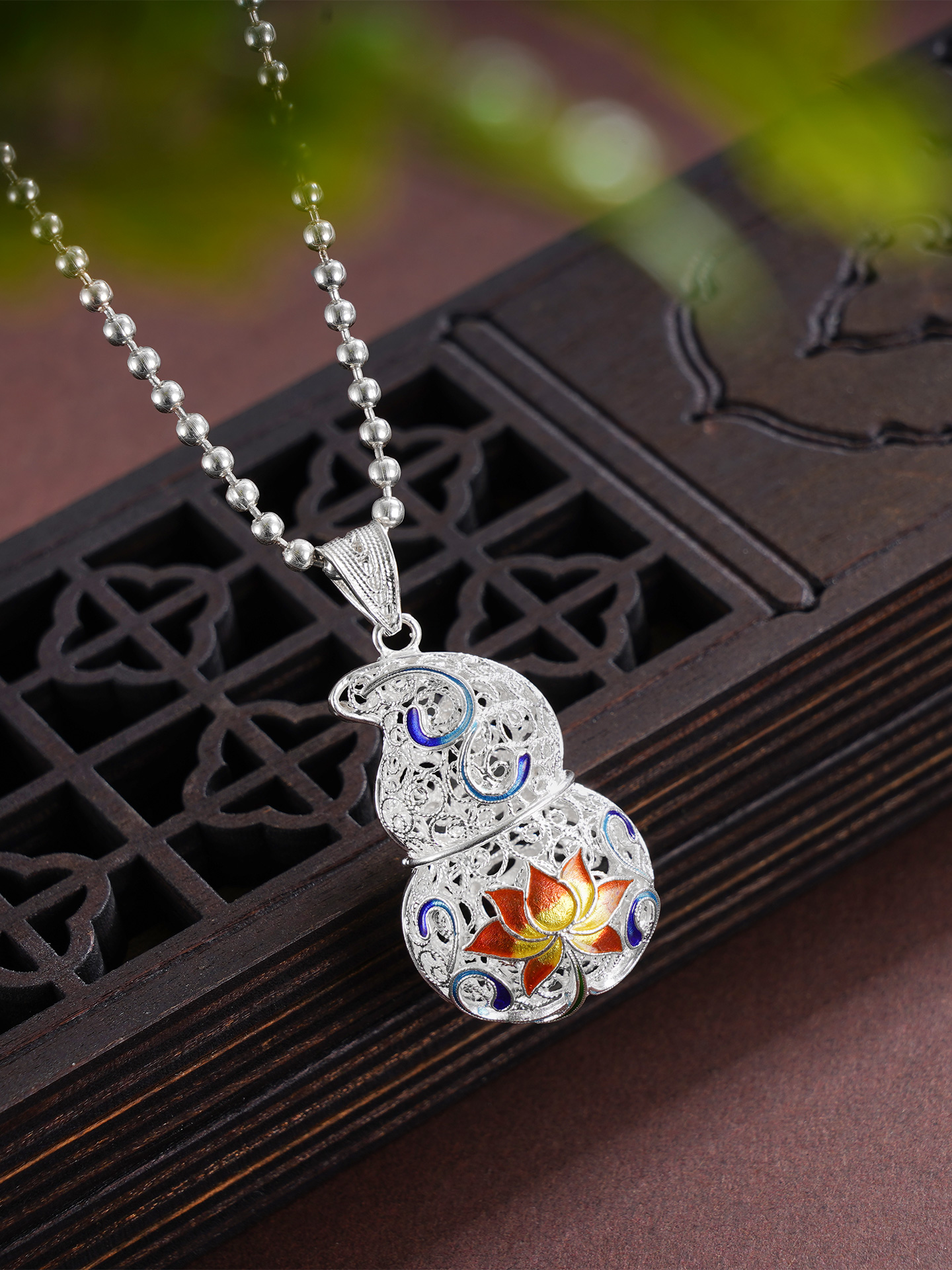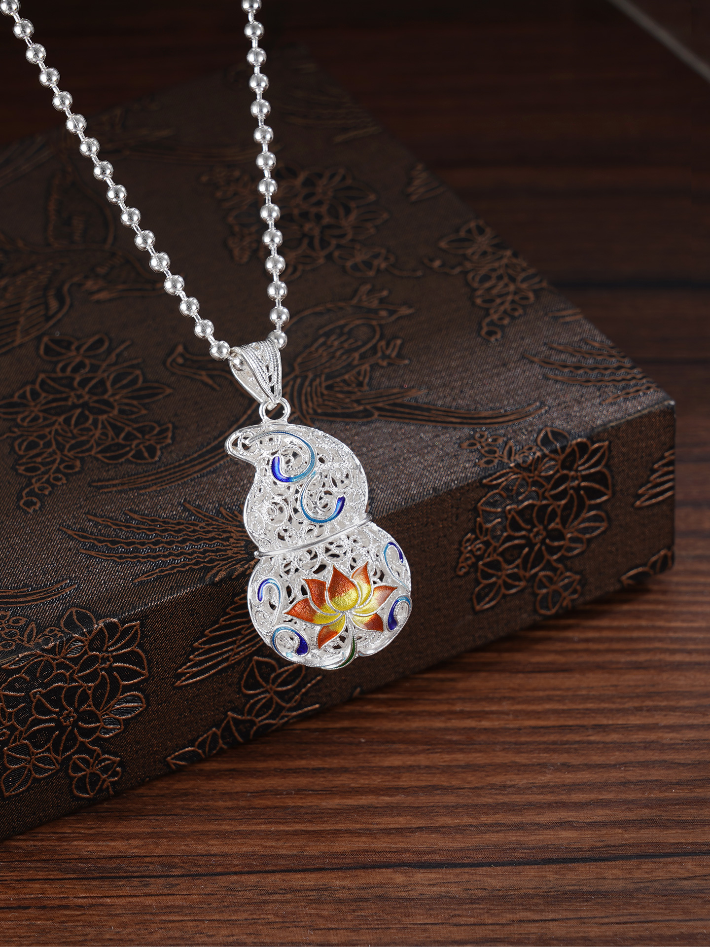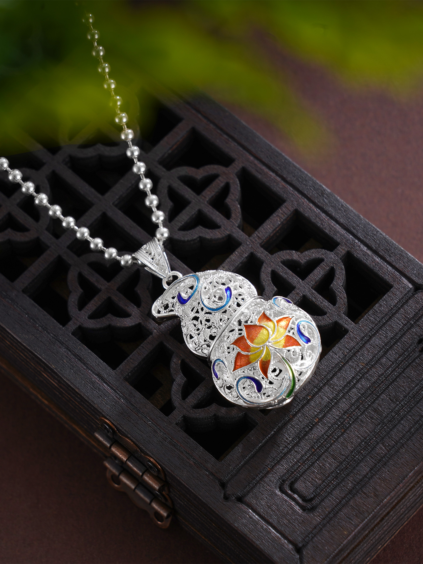 【寓意】:作品以葫芦为灵感设计,应用银花丝工艺编织,辅以珐琅工艺着色渲染。明丽绚烂,质感满满。寓意福莲花开,福气自来。