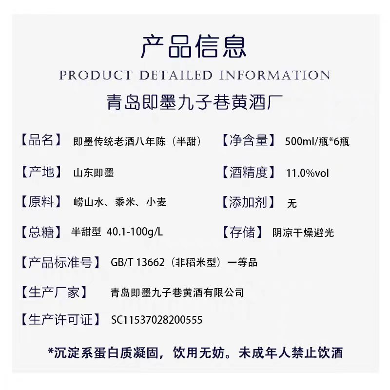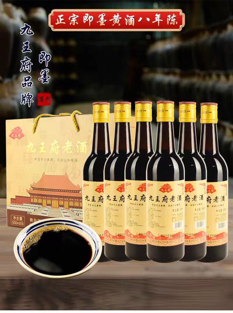 自营(九王府)-山东即墨黄酒手工老酒八年陈酿原浆500ml 6瓶礼盒纯粮0添加无焦糖半甜型