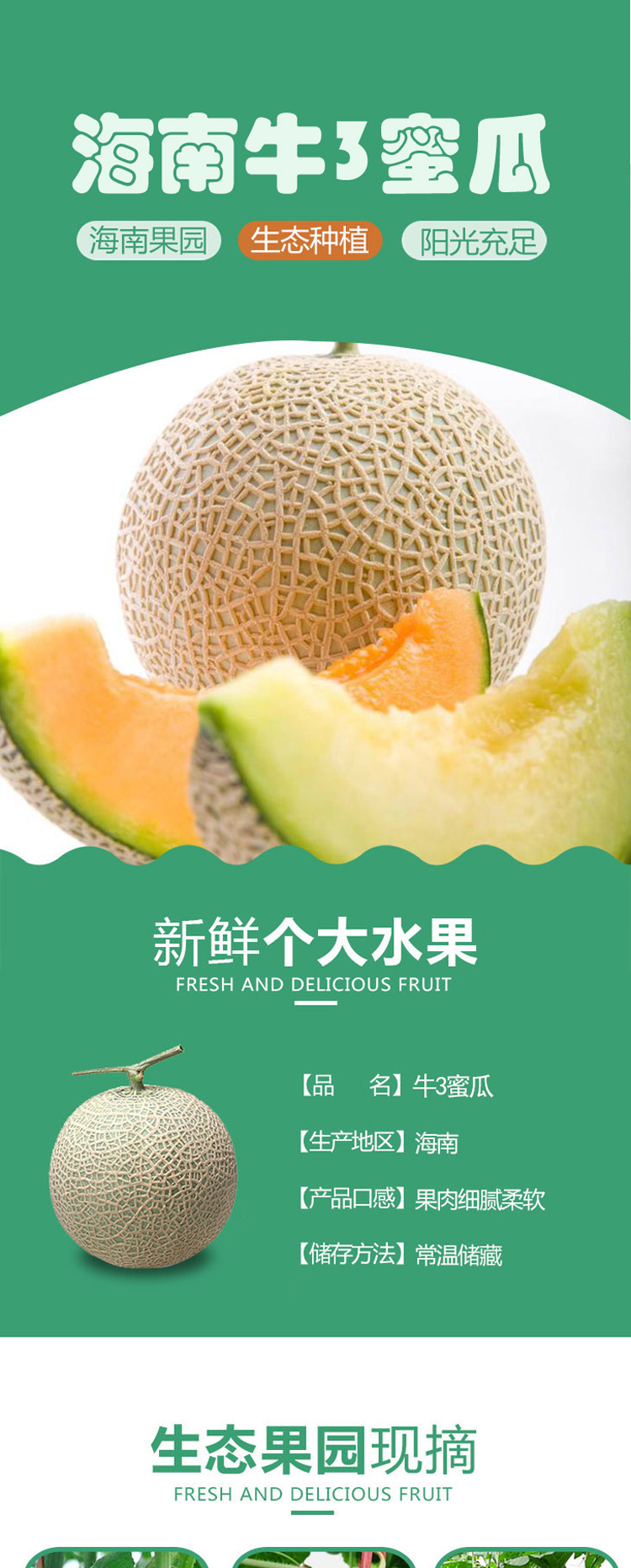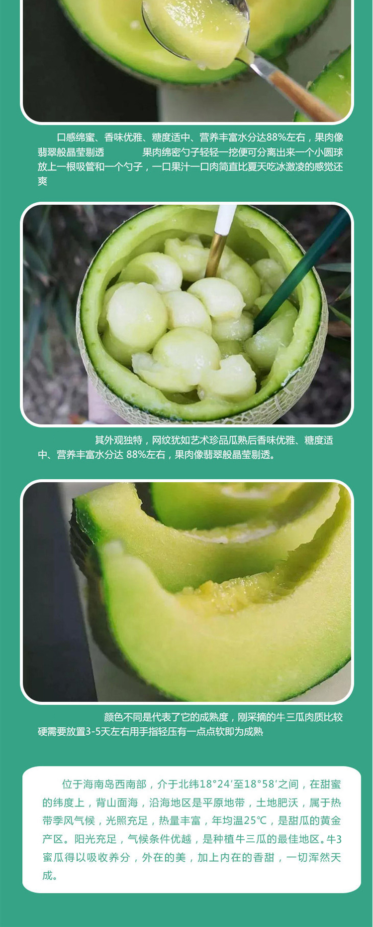 【温馨提示】判断牛3蜜瓜生熟的方法是,用力按压瓜蒂部位,手感发软即可食用;手感偏硬时,可以将蜜瓜再放一放。
