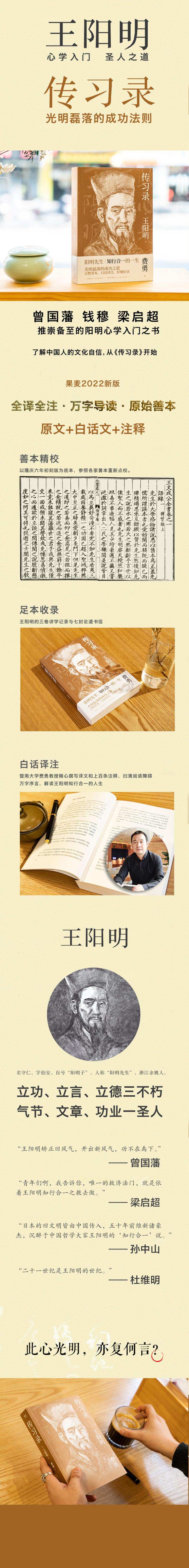 "·知行合一的生活哲学读本""。 ·传世经典:心学入门之书,儒家经典之作,曾国藩、钱穆、梁启超推崇备至。 ·简明好读,详尽导读,译文在前,原文在后,扫清阅读障碍,一本书读懂《传习录》。 ·版本可靠:以隆庆六年谢廷杰刻本为底本,考以嘉靖本、四库全书文渊阁本、施邦曜辑评本重新点校。纠正现有版本的数十处错误。 ·译文严谨:暨南大学博导费勇教授在潜心研究《传习录》及阳明心学后精译全文并做万字序言。 " · 传世经典:心学入门之书,儒家经典之作,曾国藩、钱穆、梁启超推崇备至。 · 简明好读:全译全注,详尽导读,译文在前,原文在后,扫清阅读障碍,一本书读懂《传习录》。 · 版本可靠:以隆庆六年谢廷杰刻本为底本,考以嘉靖本、四库全书文渊阁本、施邦曜辑评本重新点校。纠正现有版本的数十处错误。 · 译文严谨:生活榜创始人、暨南大学博导费勇教授在潜心研究《传习录》及阳明心学后精译全文并做万字序言。"