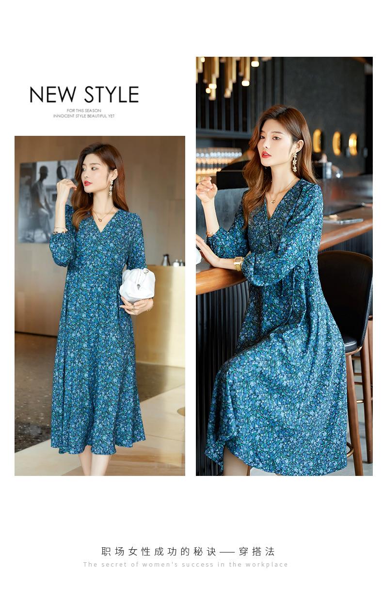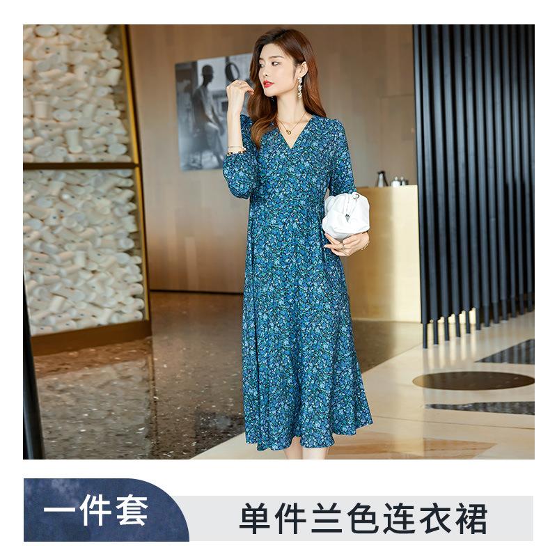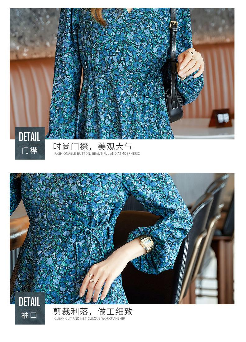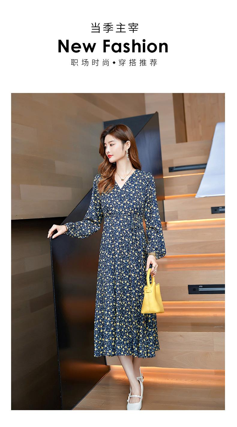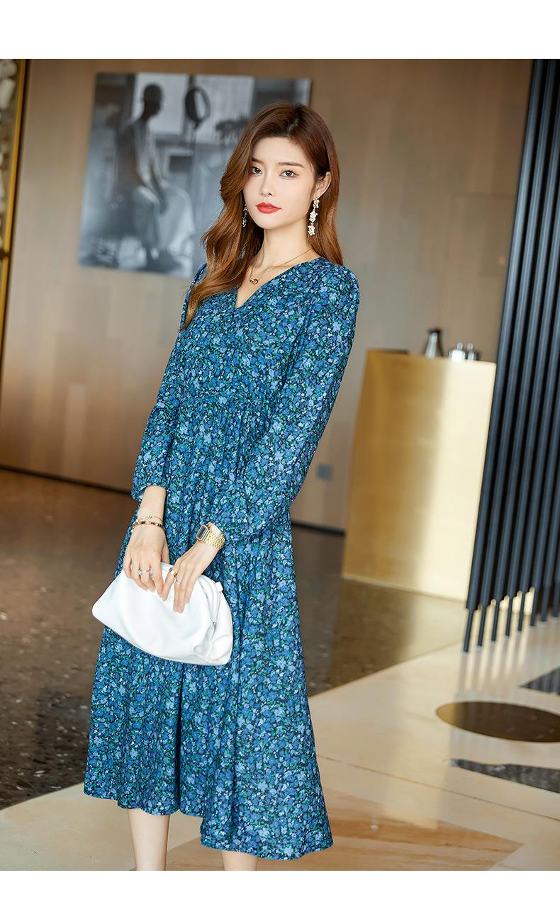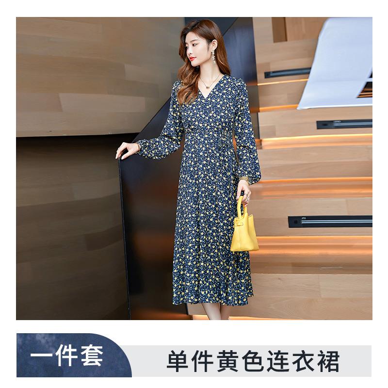 娜璐多 碎花连衣裙女2023春秋V领气质复古度假风宽松显瘦长袖雪纺长裙女