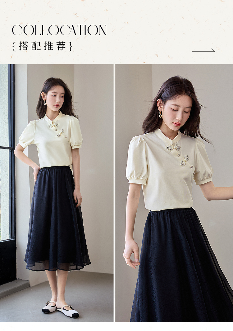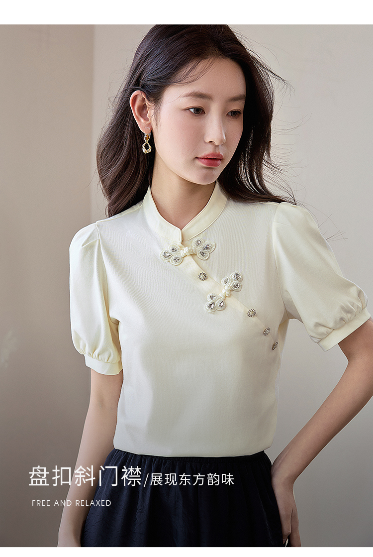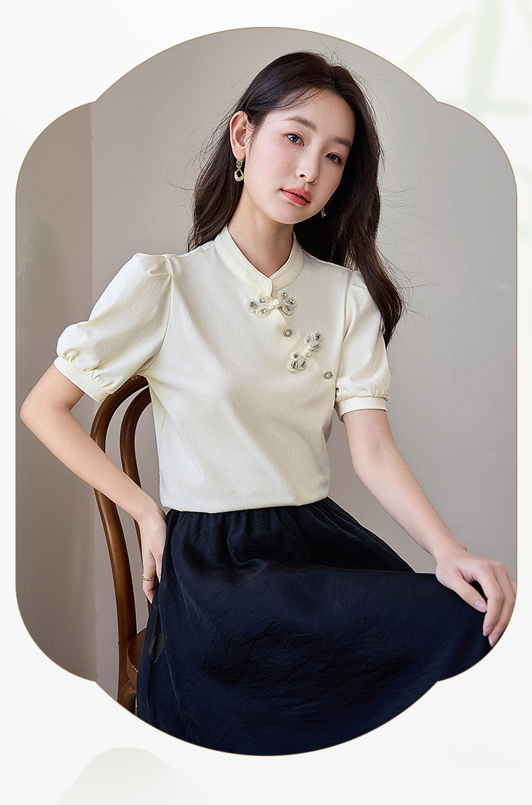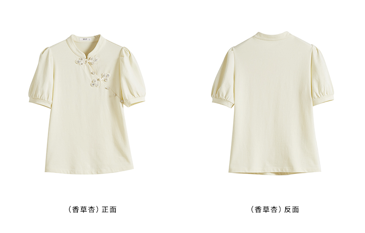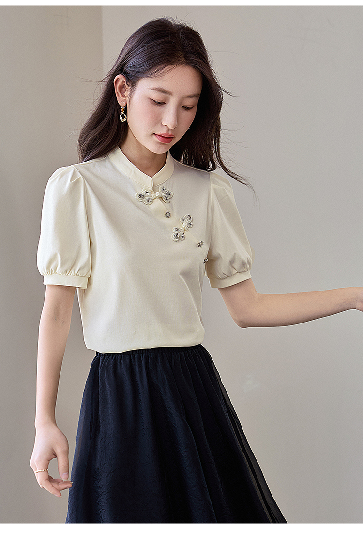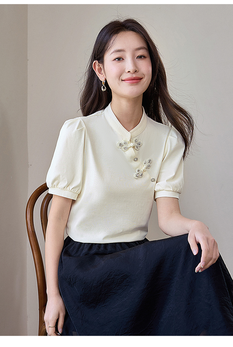 【专属特价】熙世界2025夏装新款新中式盘扣T恤上衣国风立领法式泡泡袖小衫