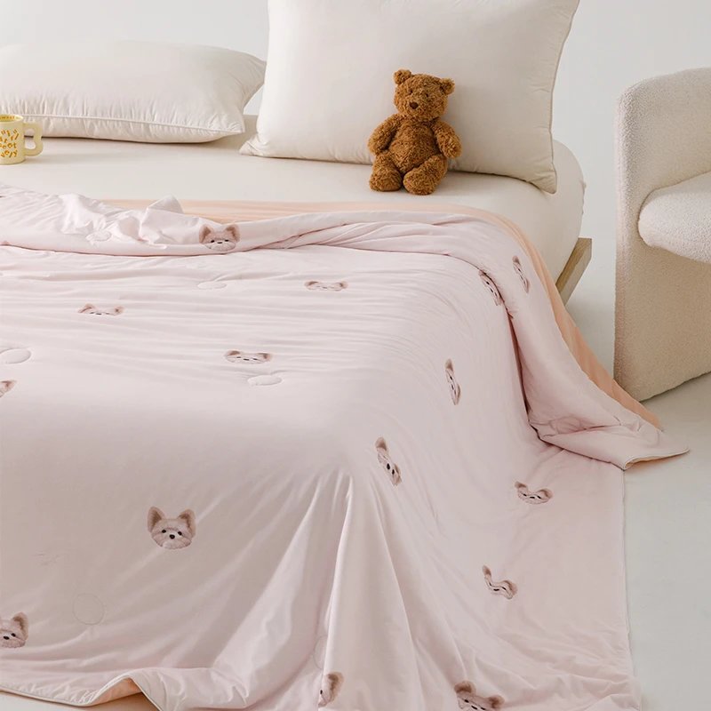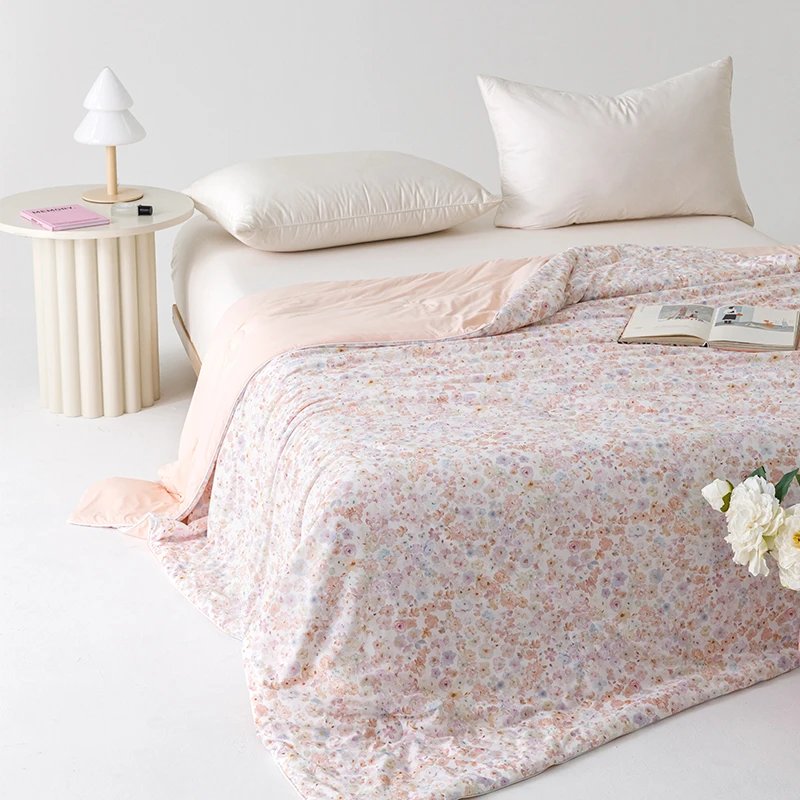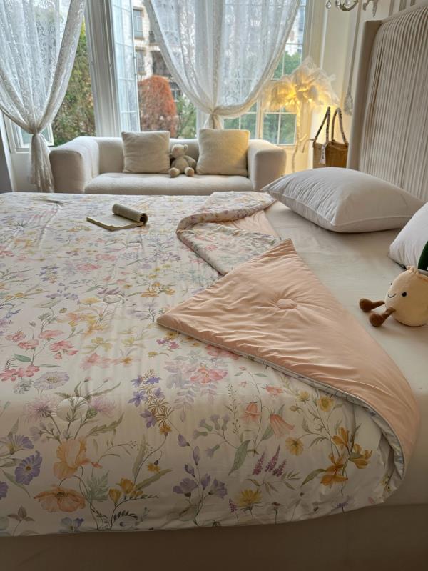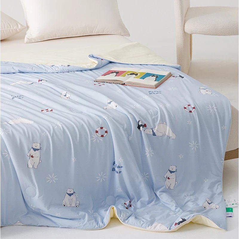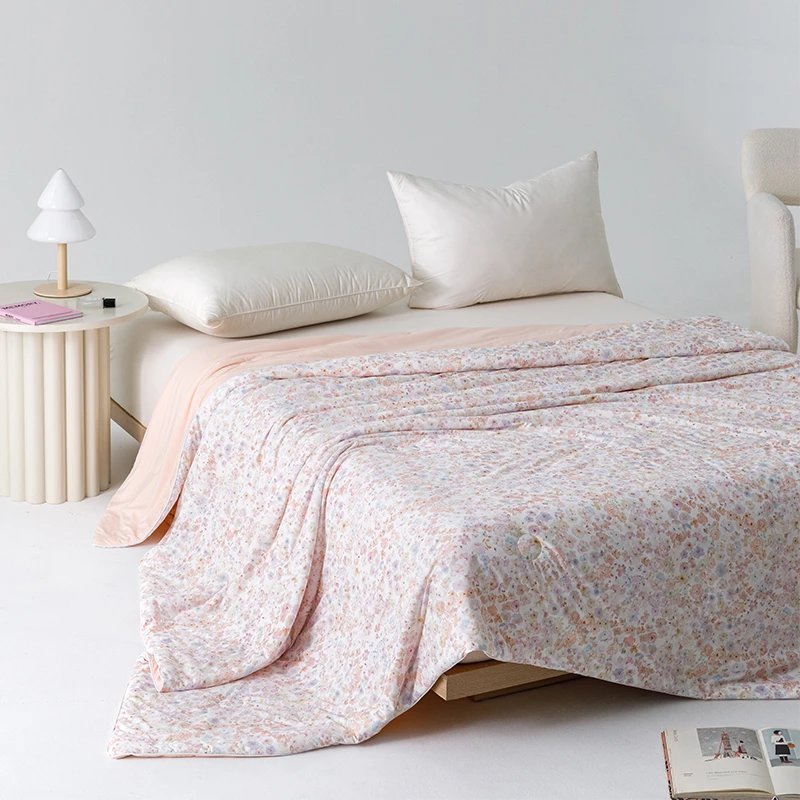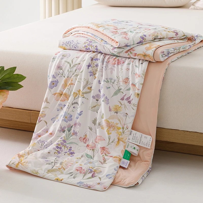 童趣花型,夏日氛围拉满 被子上的花型充满童趣,各种可爱的图案就像夏日里的欢乐元素齐聚一堂。清新的色调、俏皮的模样,仿佛将夏日的热闹与美好都融入其中,一看到这花型,夏天的氛围感瞬间爆棚,感觉整个人都沉浸在快乐的夏日时光里。