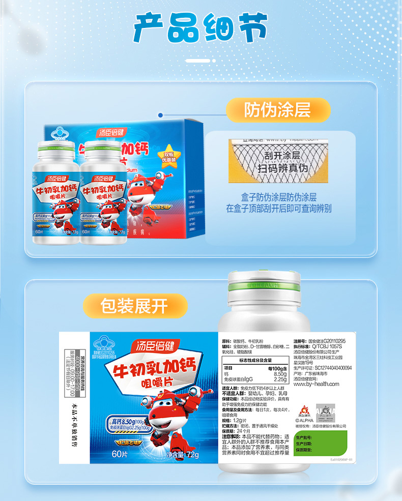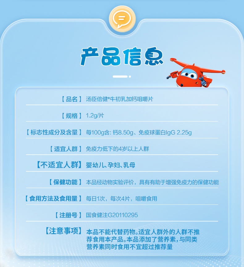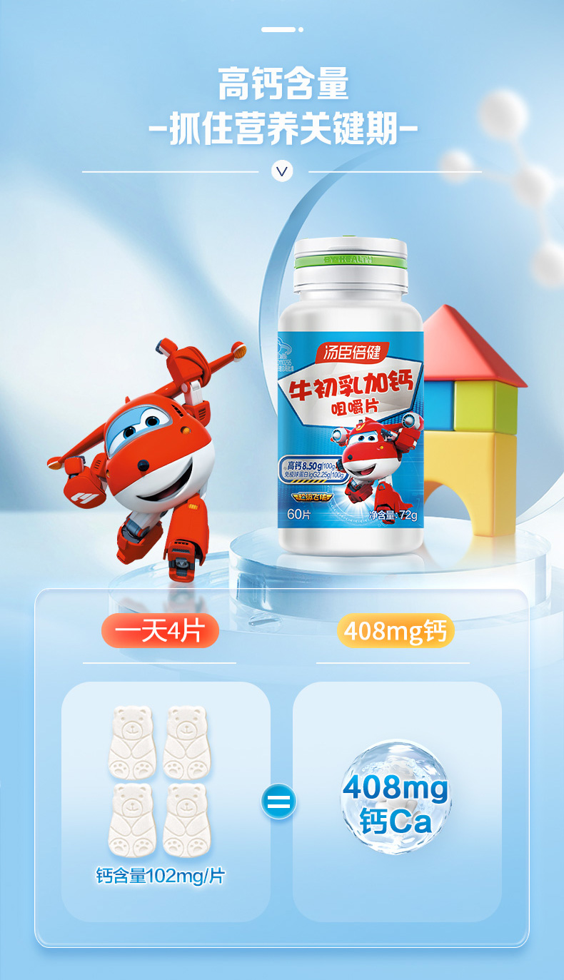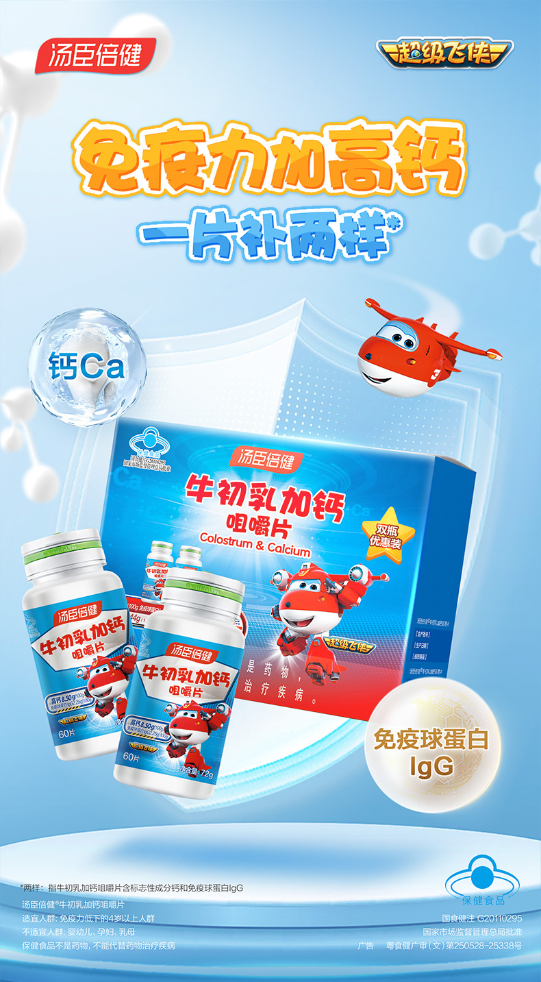 孩子补充钙助力骨 汤臣倍健牛初乳加钙咀嚼片优惠装(60片×2)-超级飞侠装