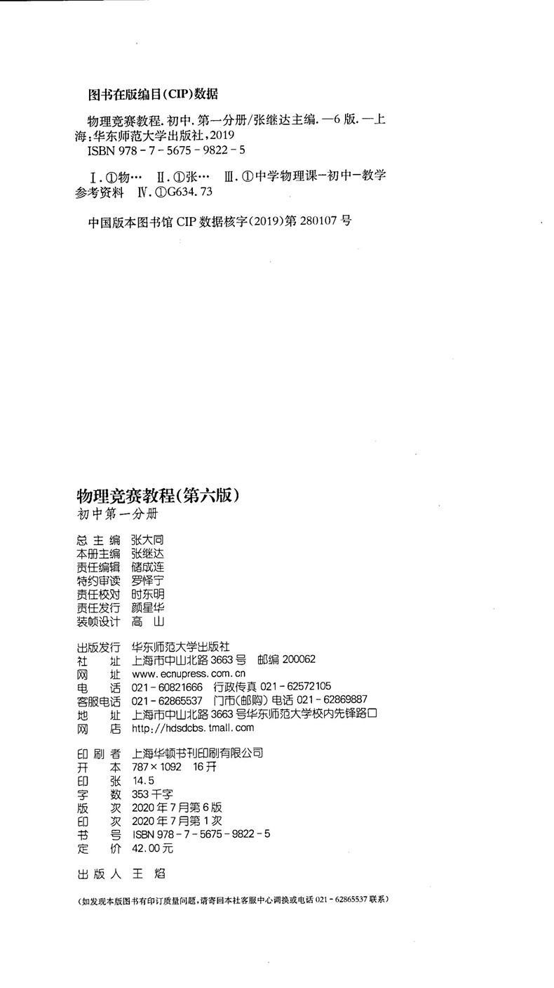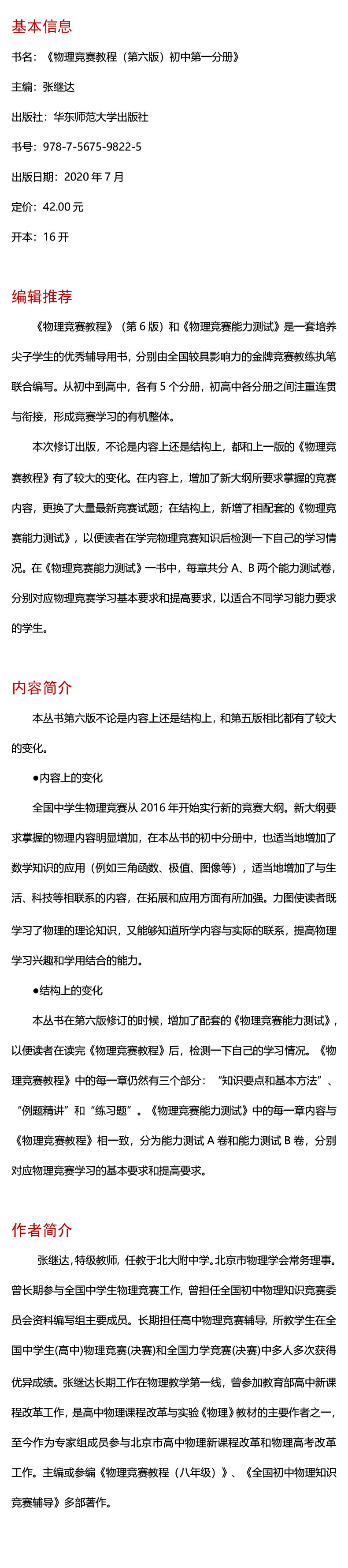 (仓发) 物理竞赛教程—初中第一分册(第六版)/华东师范大学出版社/张继达/9787567598225