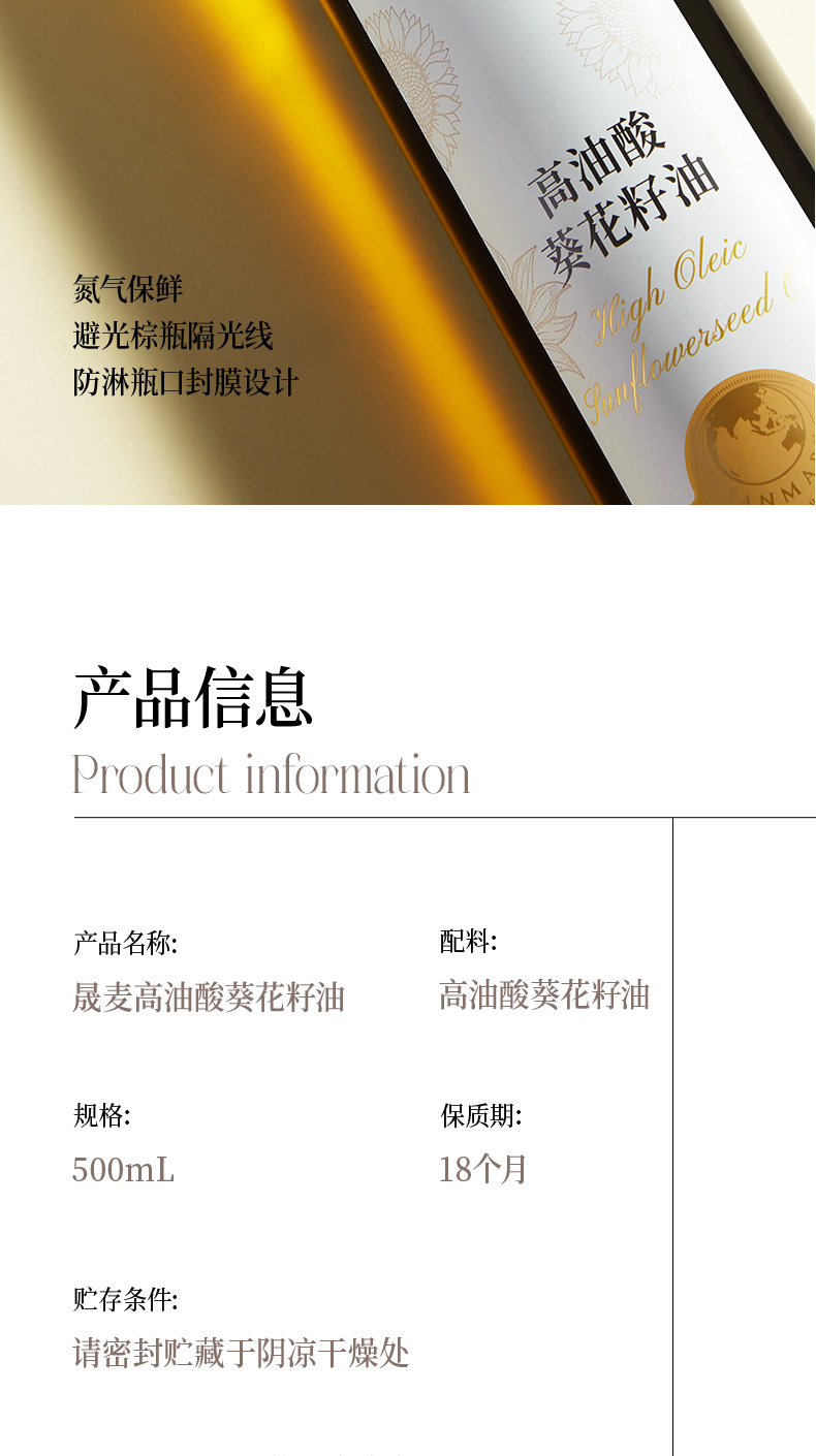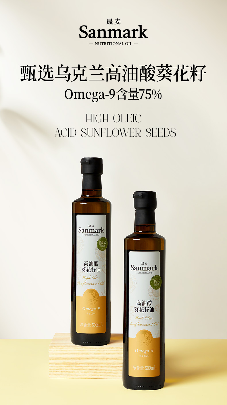 晟麦高油酸葵花籽油 500ml 0 反式脂肪酸含 Omega-9 乌克兰黑土原料 煎炸少烟清爽口感