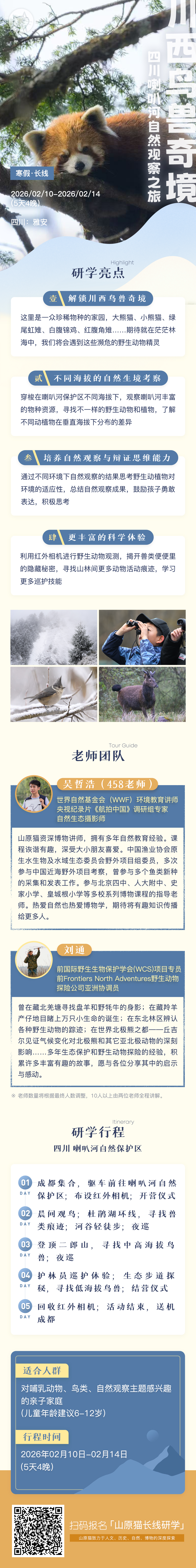 五天行程中,大小朋友们走进大熊猫国家公园,行走不同海拔,感受自然生境的变化与生物多样性,并寻找小熊猫的身影。与巡护员同行,倾听珍稀物种保护与保育的故事,思考人与自然和谐共生的方式。