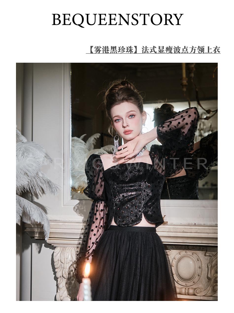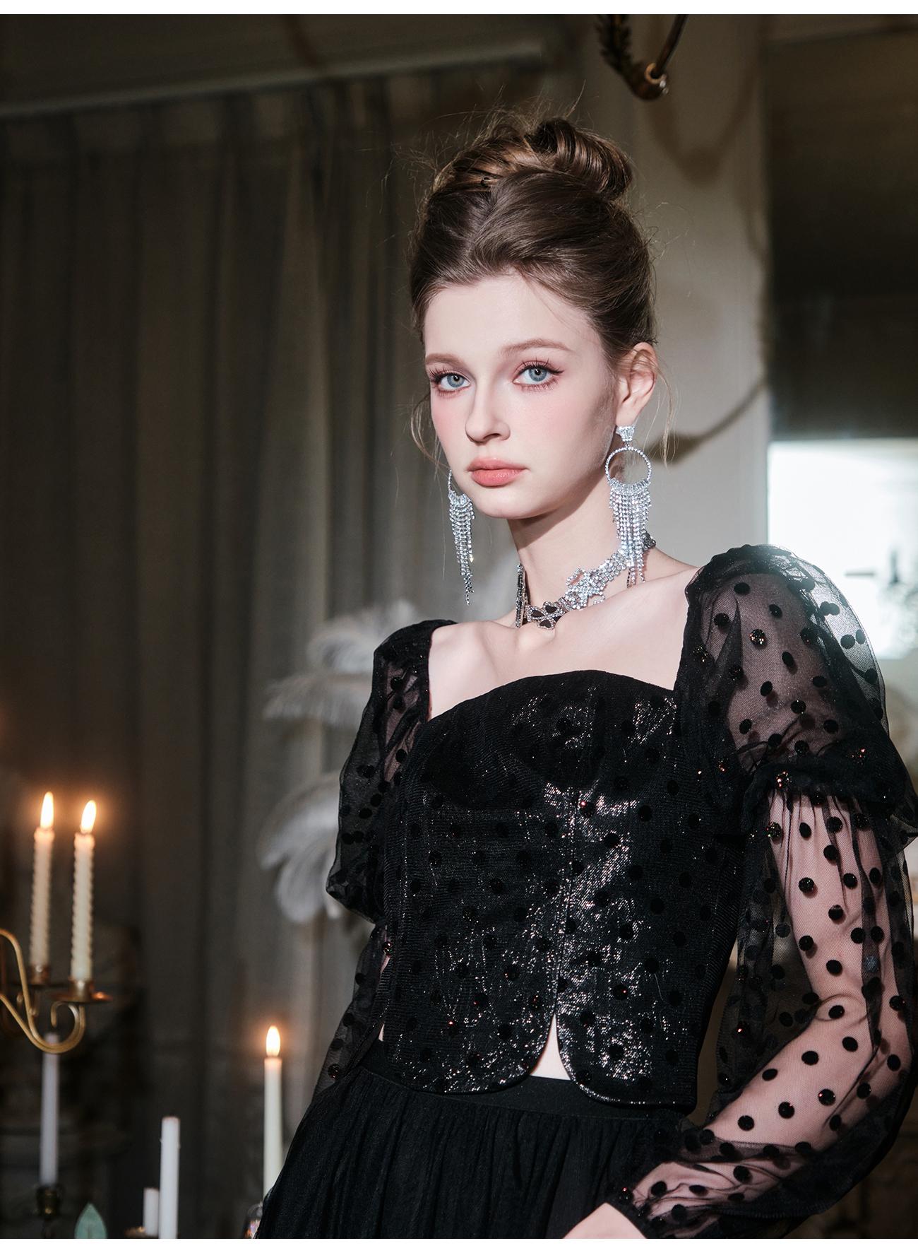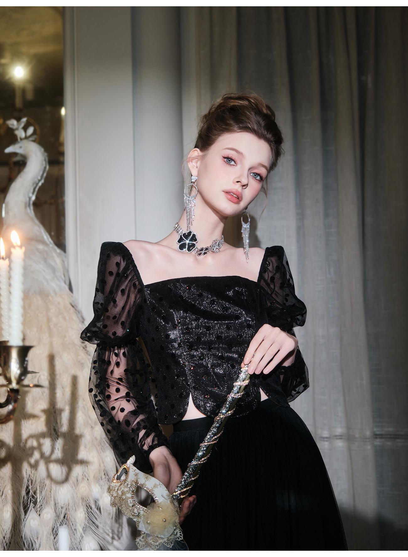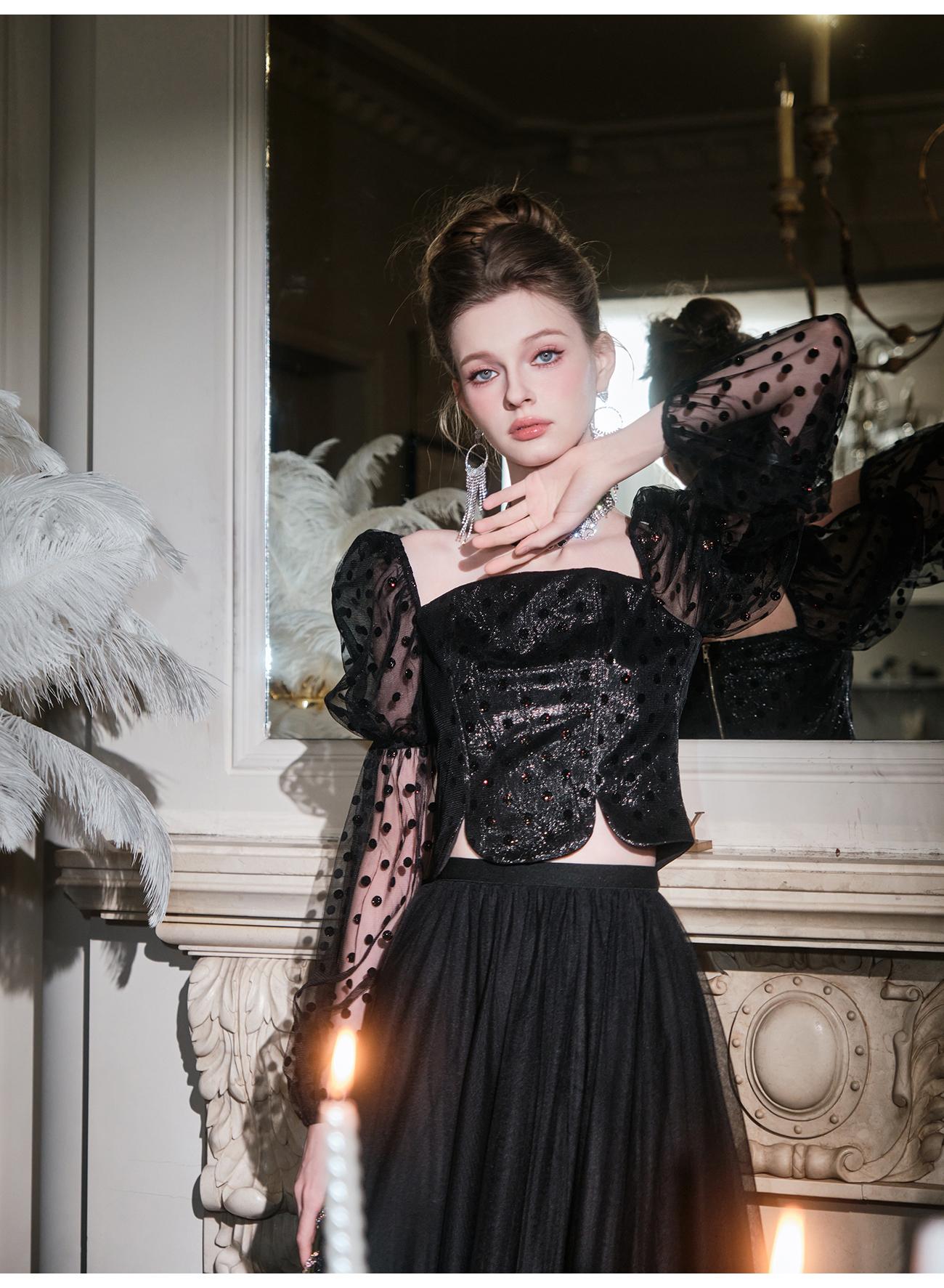 【孤品样衣,不退不换】【雾港黑珍珠】法式植绒波点复合网纱含金银丝上衣