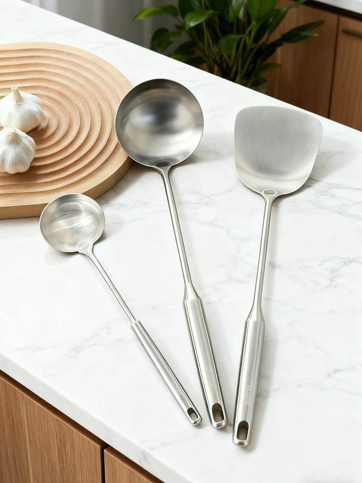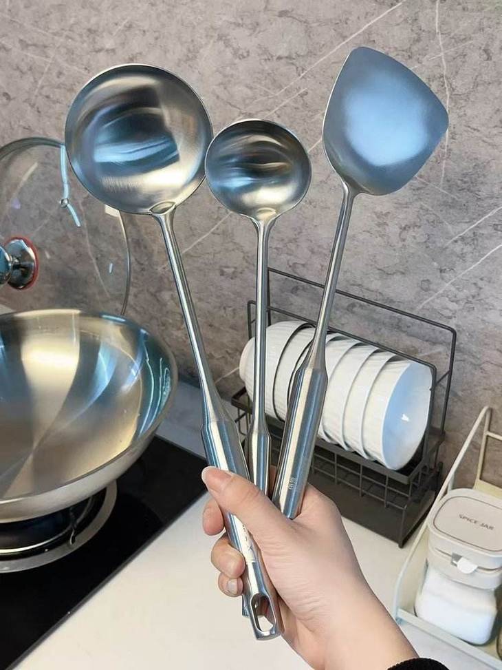 『厨房有这一套,再也不用凑工具了🍳』 ❌以前做饭总被厨具逼疯——炒个菜翻不动,盛个汤洒一地,想舀点酱料还得翻箱倒柜找工具,台面堆得乱七八糟,做饭的好心情全没了!👉直到入手这套不锈钢三件套,直接把“实用”焊在厨房上!炒勺+炒铲+小汤勺,一套刚好覆盖所有日常烹饪,再也不用单独凑买! 🔴早餐做蛋炒饭:炒铲是贴合锅型的斜坡设计,颠勺翻炒超丝滑,鸡蛋和米饭裹得均匀,完全不会撒到灶台外,直接舀起装盘,大小刚好不烫手,连摆盘都省事~ 🔴中午炖排骨汤:炖好后用小汤勺盛汤,加深弧形勺头容量超大,满满一勺直接倒进碗里,不会洒得满桌都是,连锅里的骨头都能轻松舀出来,不用再找漏勺兜底~ 🔴晚上炒青菜+调酱汁:炒铲翻炒时能牢牢“抓住”食材,快速颠勺锁鲜,青菜脆嫩不软烂;调酱汁时用炒勺舀生抽、蚝油,用量精准不浪费,小汤勺还能用来搅拌均匀,一套工具全搞定~