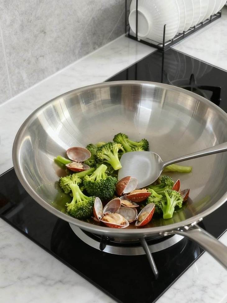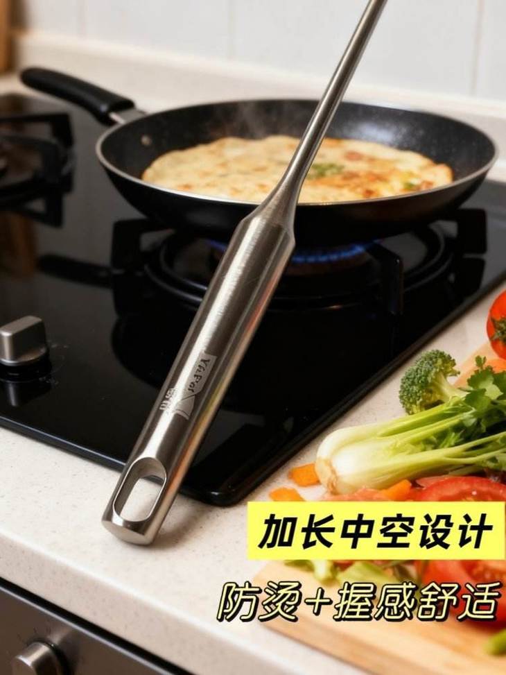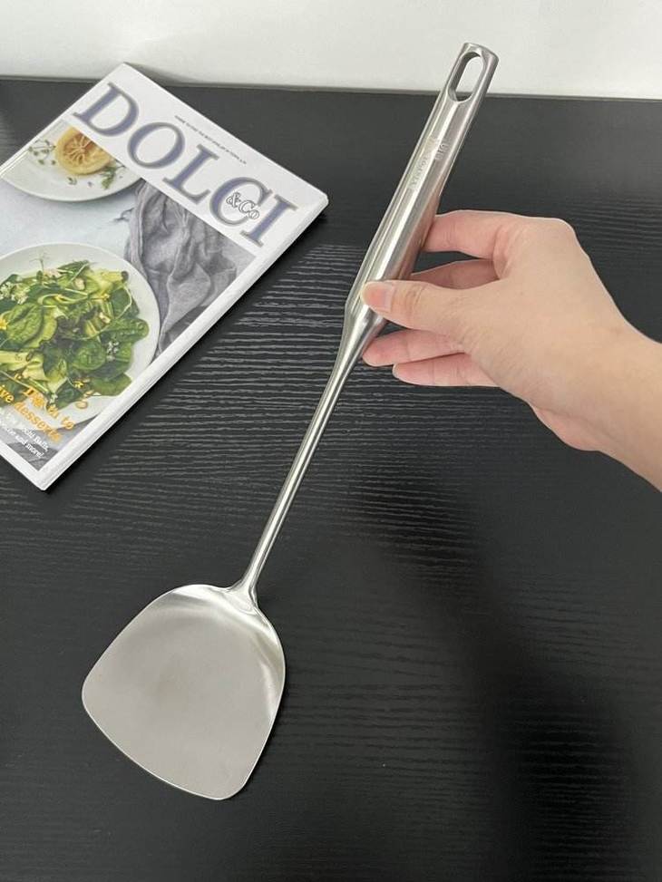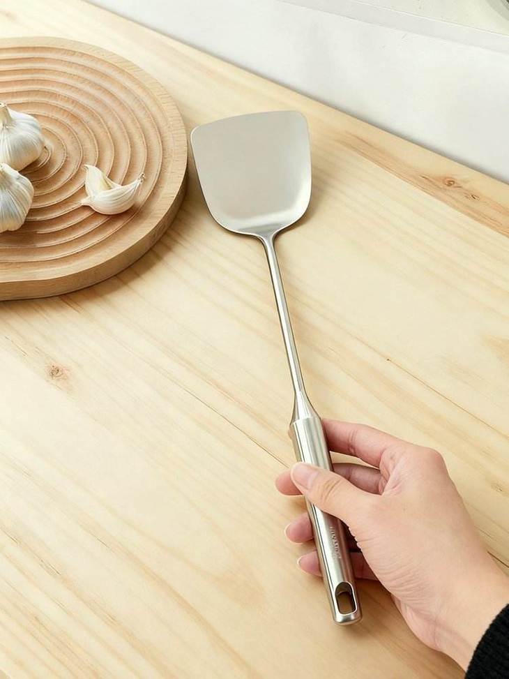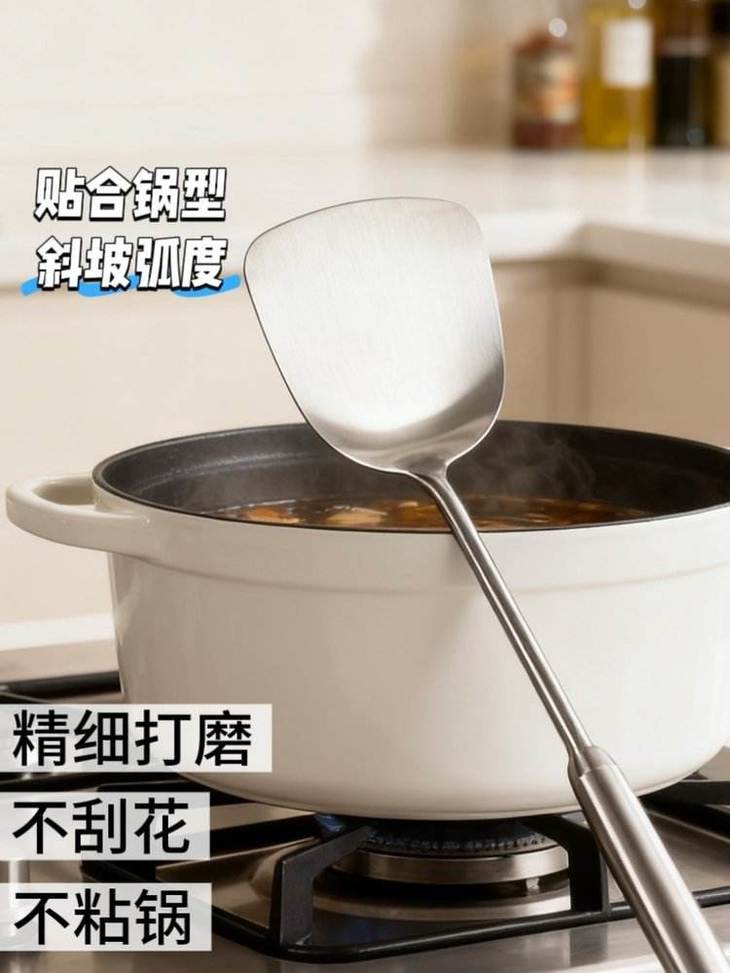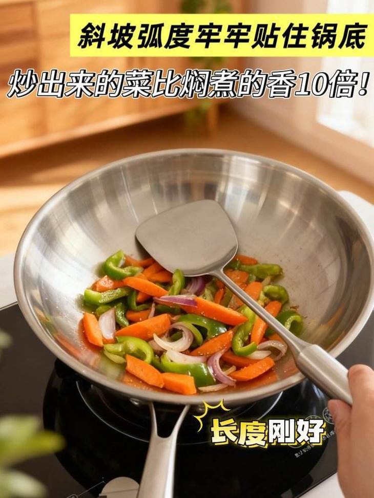 『这把不锈钢炒铲+炒菜技巧,新手也能炒出餐馆味🍲』 ❌以前用的炒铲要么太轻颠勺没劲儿,要么边缘锋利刮花不粘锅,要么手柄烫手不敢握…👉直到挖到这把不锈钢炒铲,直接把“炒菜顺手”焊在我的厨房! 🔴铲头:是贴合锅型的斜坡弧度,不管是圆底锅还是平底锅,都能牢牢贴住锅底,翻炒时不会“空铲”。颠勺时先把食材用铲头拢到中间,手腕轻轻向上发力,利用铲头的弧度“兜住”食材,再顺势回拉,食材在锅里翻滚一圈,汤汁完全不会洒出来,还能快速受热锁鲜,炒出来的菜比焖煮的香10倍! 🔴铲面宽度刚好:一次能炒够2人份~先烧锅至冒烟(热锅冷油),倒入青菜后用炒铲快速翻炒15秒,然后用铲头把青菜向锅边拨,中间留空淋1勺料酒+少许盐,再翻炒10秒,最后用炒铲拢起青菜颠一下出锅,青菜脆嫩翠绿,完全没有软塌感🥬 🔴精细打磨:铲头边缘做了圆滑打磨,没有一点毛刺,摸起来滑溜溜的,用不粘锅的时候完全不用担心刮伤涂层,终于能放心大胆翻炒了!!
