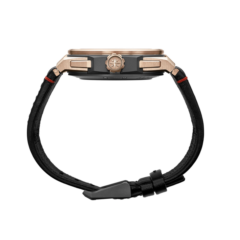 镜面材质 | 蓝宝石水晶玻璃 | 表盘 | 18K玫瑰金/瓷化钛金属表壳 18K玫瑰金表圈,配有八颗固定螺丝 黄铜表盘经电镀处理,压印从鹰眼虹膜汲取灵感的劲黑色放射状图案 黑色计时盘,带白色移印元件(计时盘边缘以镀金装饰) 镀金镶贴时标和数字,覆有Super-LumiNova® Grade X1荧光涂层 黑色表缘和计时盘 镀金棒形时针和分针,覆有Super-LumiNova® Grade X1荧光涂层 镀金箭形秒针,带红色针尖和鹰羽形配重 镀金计时指针,针尖为红色 日期显示 计时 飞返/逆跳 |