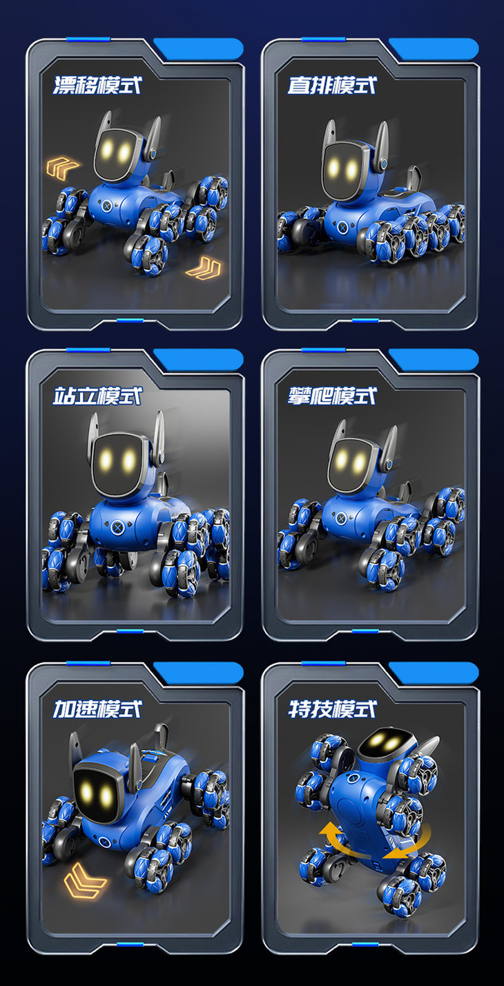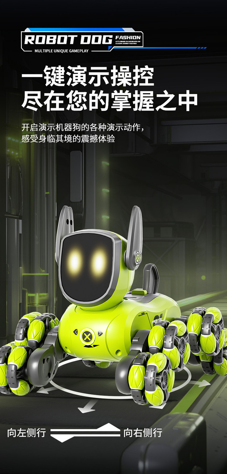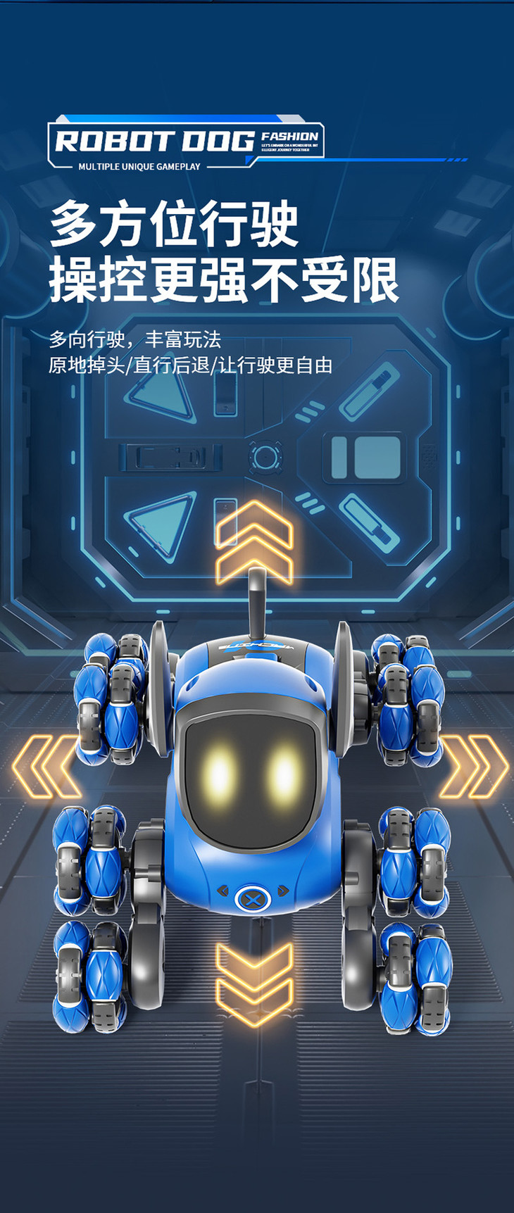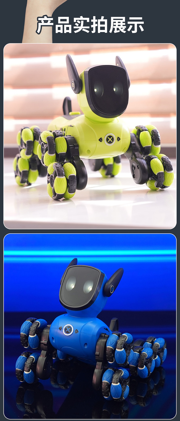 绝对的颜值与实力并存,科技感十足的小狗造型,酷炫好看 ✨2.4G无线超远距离遥控 ✨8个耐磨灵活的麦克纳姆轮,抗撞抗摔! 家里、小区、公园、适应各种场景,凹凸路面都能稳稳越过,操控性能以及脱困能力max ❗ ❗ 👐多方向行驶|前后臂翻越|旋转爬坡|高姿巡逻|低趴潜行 各种花式炫酷玩法,一切行动由你指挥 简直就是男孩子的梦中情车呀🏎