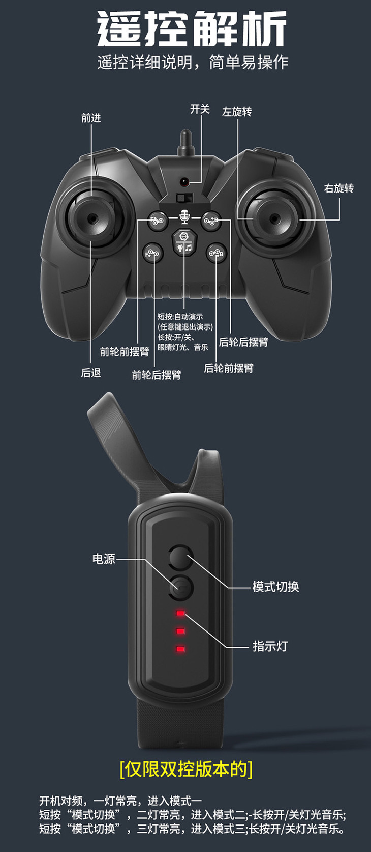 音乐… ✅八个耐磨麦克纳姆轮,不限地形 越野|沙地|草地|岩石都能跑 ✅四肢灵活、姿态百变🉑前、后臂翻越、 高姿巡逻,低趴潜行…各种花式造型 ✅超长续航,50米超远遥控距离, 灯光