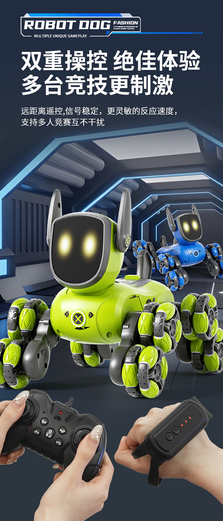 这款八轮特技机械狗🤖绝对是你的完美选择。🏞️ 经常去户外可以加一组电池,不用担心电池问题,让孩子玩得更久! 还有手势重力操控,锻炼小朋友手部协调能力。 🔋让孩子能够更直接地控制机械狗,增加乐趣。👐 无论是男孩还是女孩,这款机械狗都能成为孩子的好朋友,陪伴孩子健康成长。👧👦