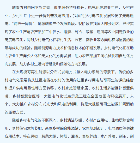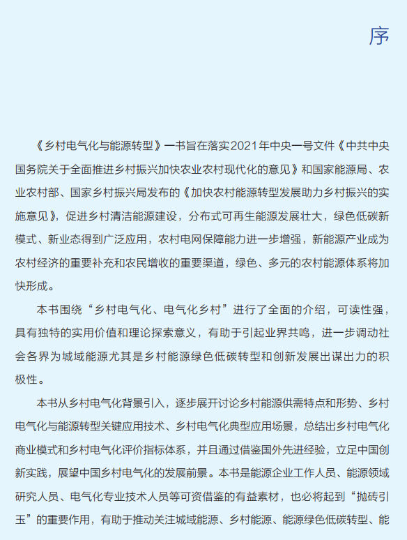 本书回顾了乡村电气化在我国的发展历程,介绍了乡村电气化相关有代表性的关键技术与应用场景,对新型电力系统下乡村电气化的发展与能源转型进行了分析与展望。