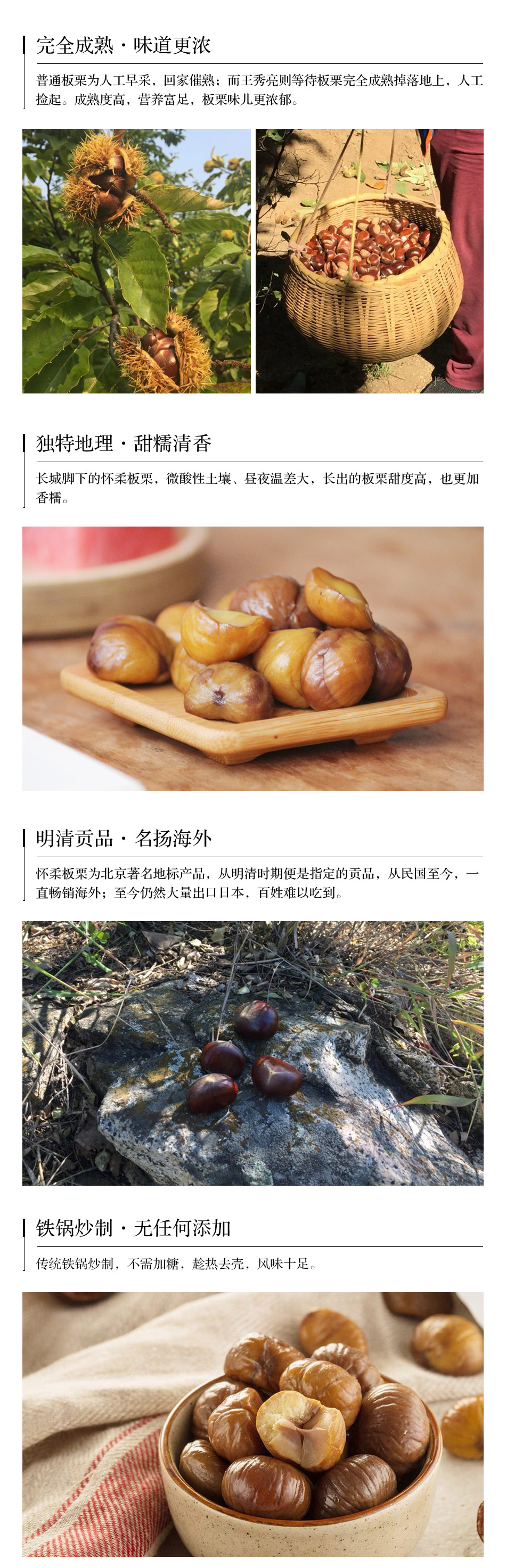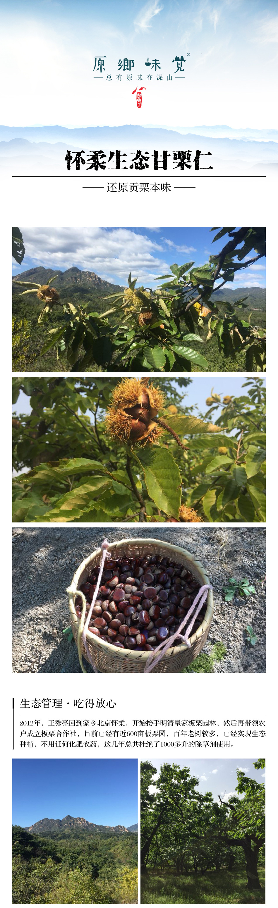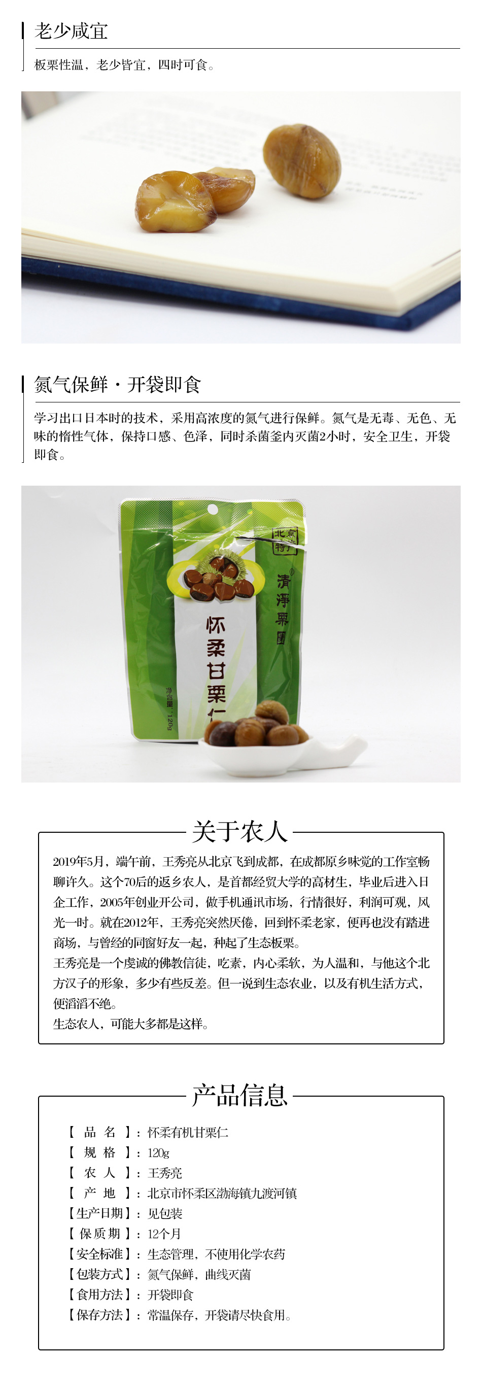 【品名】:怀柔甘栗仁 【规格】:120g/袋 【农人】:王秀亮 【原料产地】:北京市怀柔区渤海镇九渡河镇 【生产日期】:见包装封口处 【保质期】:12个月 【安全标准】:生态管理,不使用化学农药 【包装方式】:氮气保鲜,曲线灭菌 【使用方法】:开袋即食 【保存方法】:常温避光保存,开袋请尽快食用。
